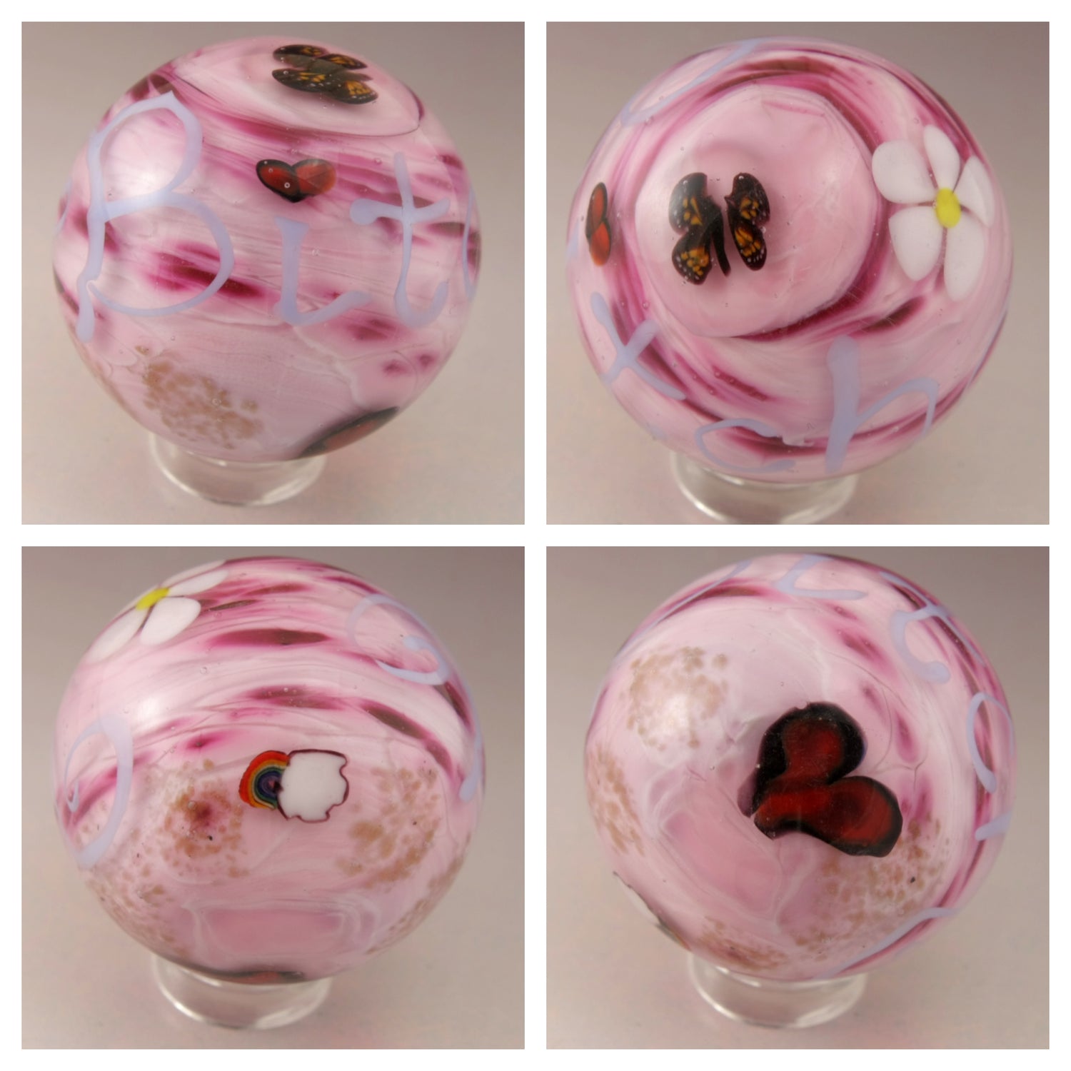 Handmade lampwork jewelry components including glass beads and electroformed copper pieces.