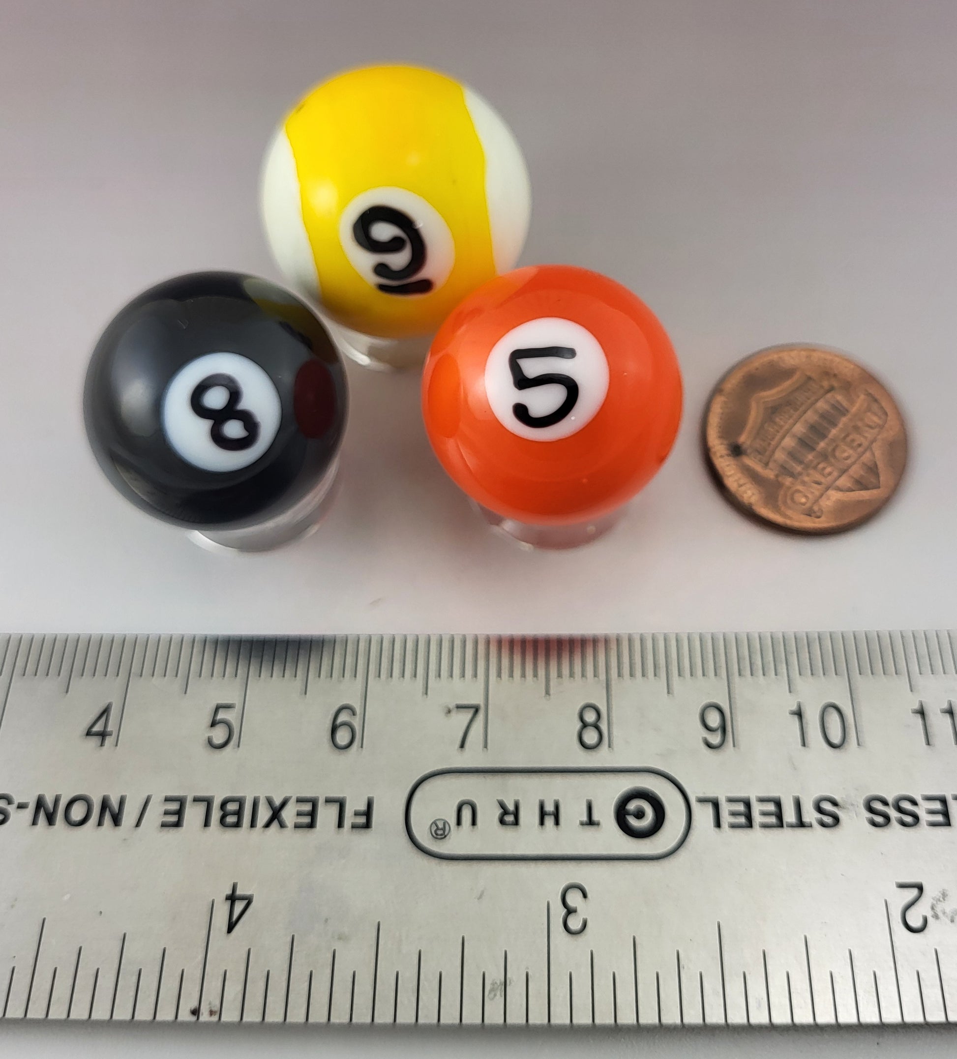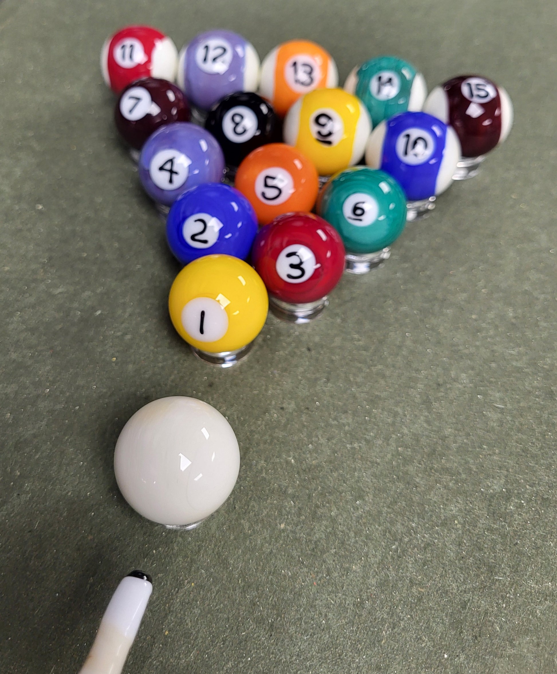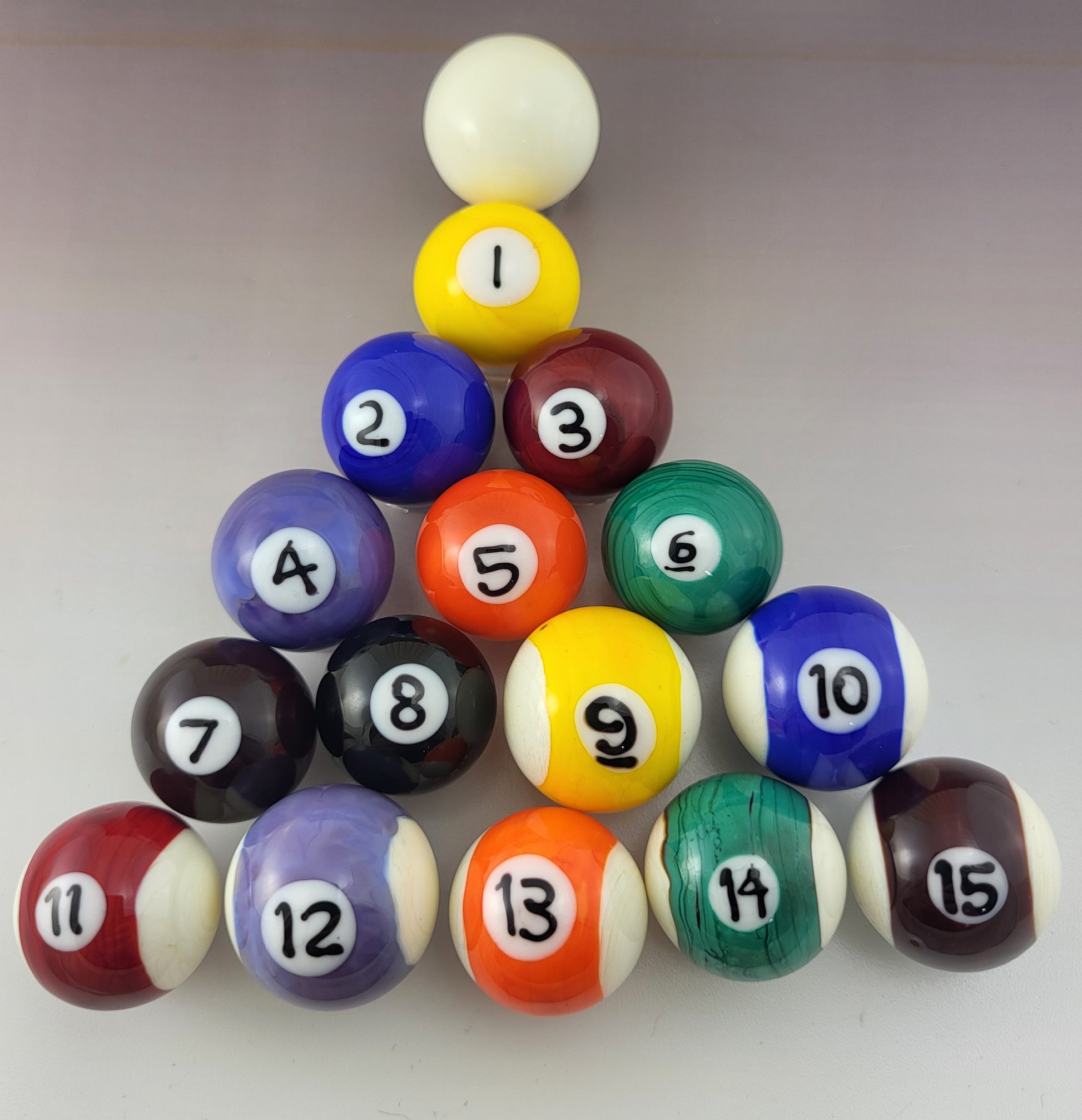 Handmade set of billiards balls including 1-8 in solids and 9-15 in stripes and an ivory colored cue ball. Comes with marble stands and individual bags