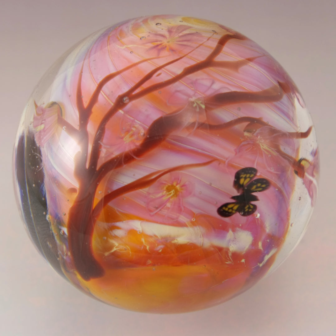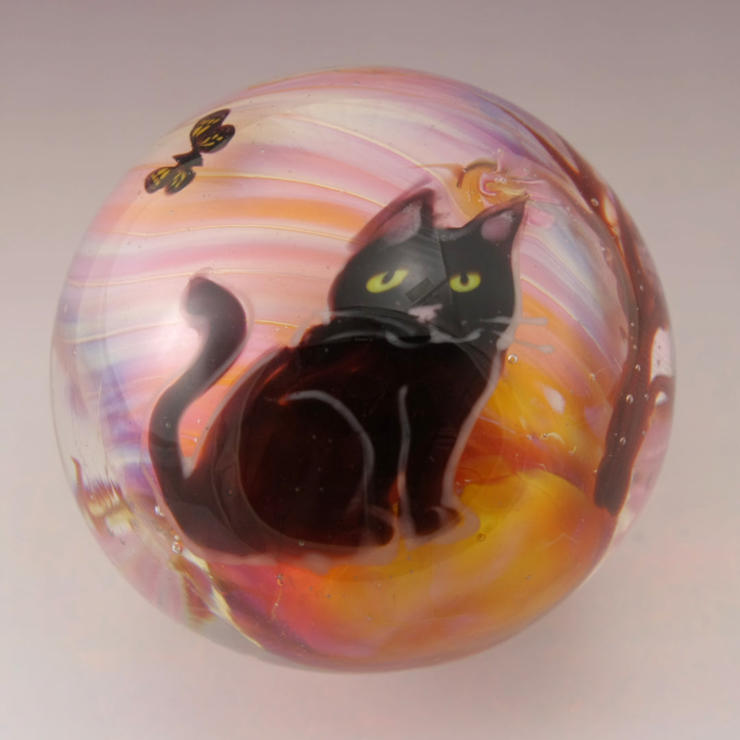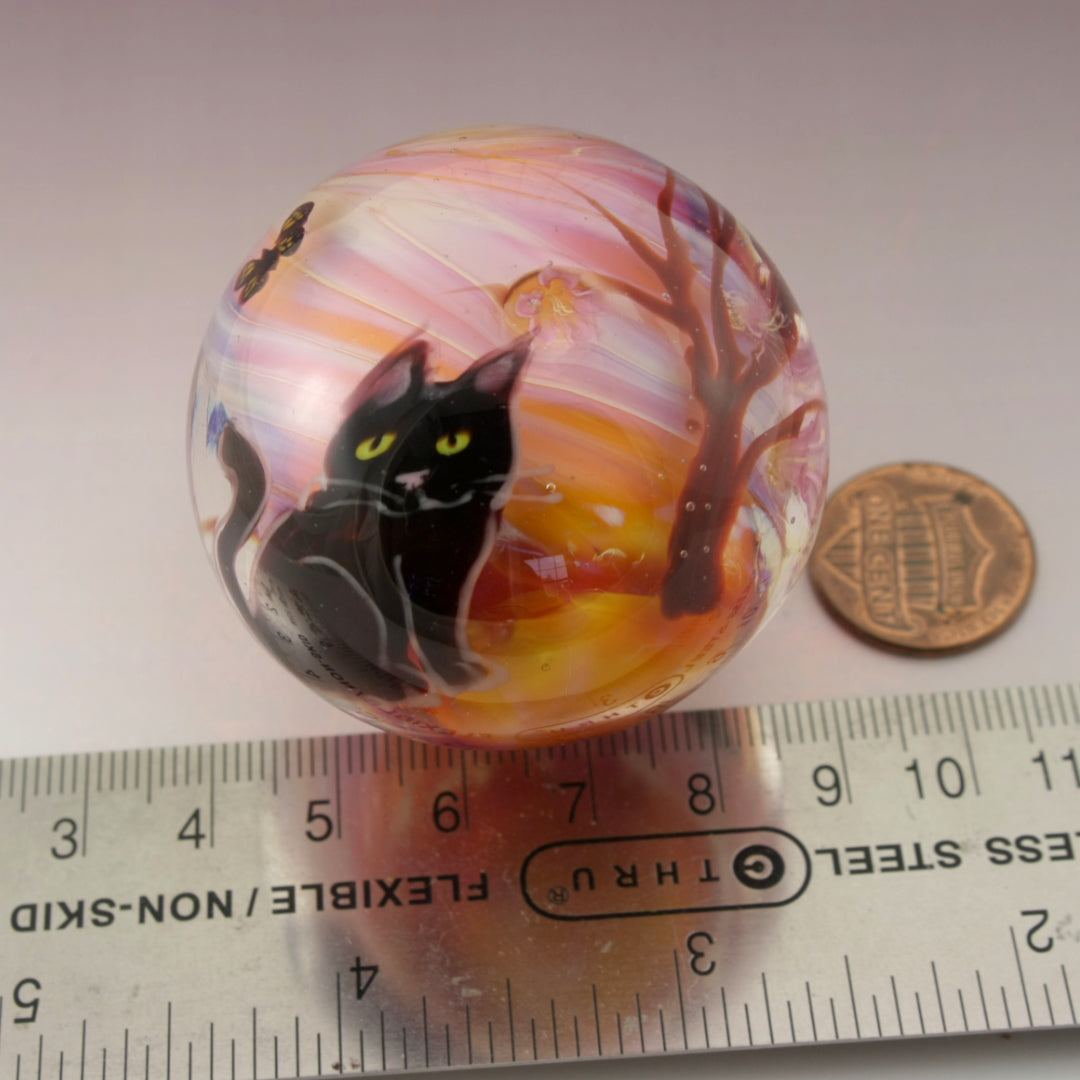 This handmade lampwork marble features a lustrous peachy orange pink background with a brown windblown tree with subtle pink purple blossoms with three butterflies dancing in the sky. I've drawn a black kitty with a pink nose and yellow eyes. This large marble has been heavily encased in clear to magnify