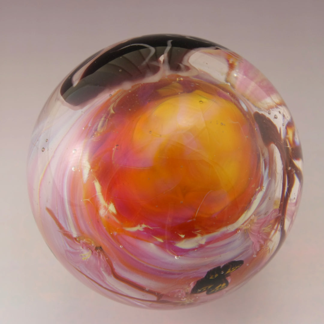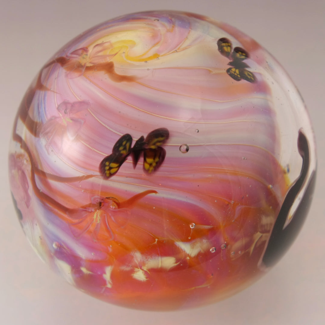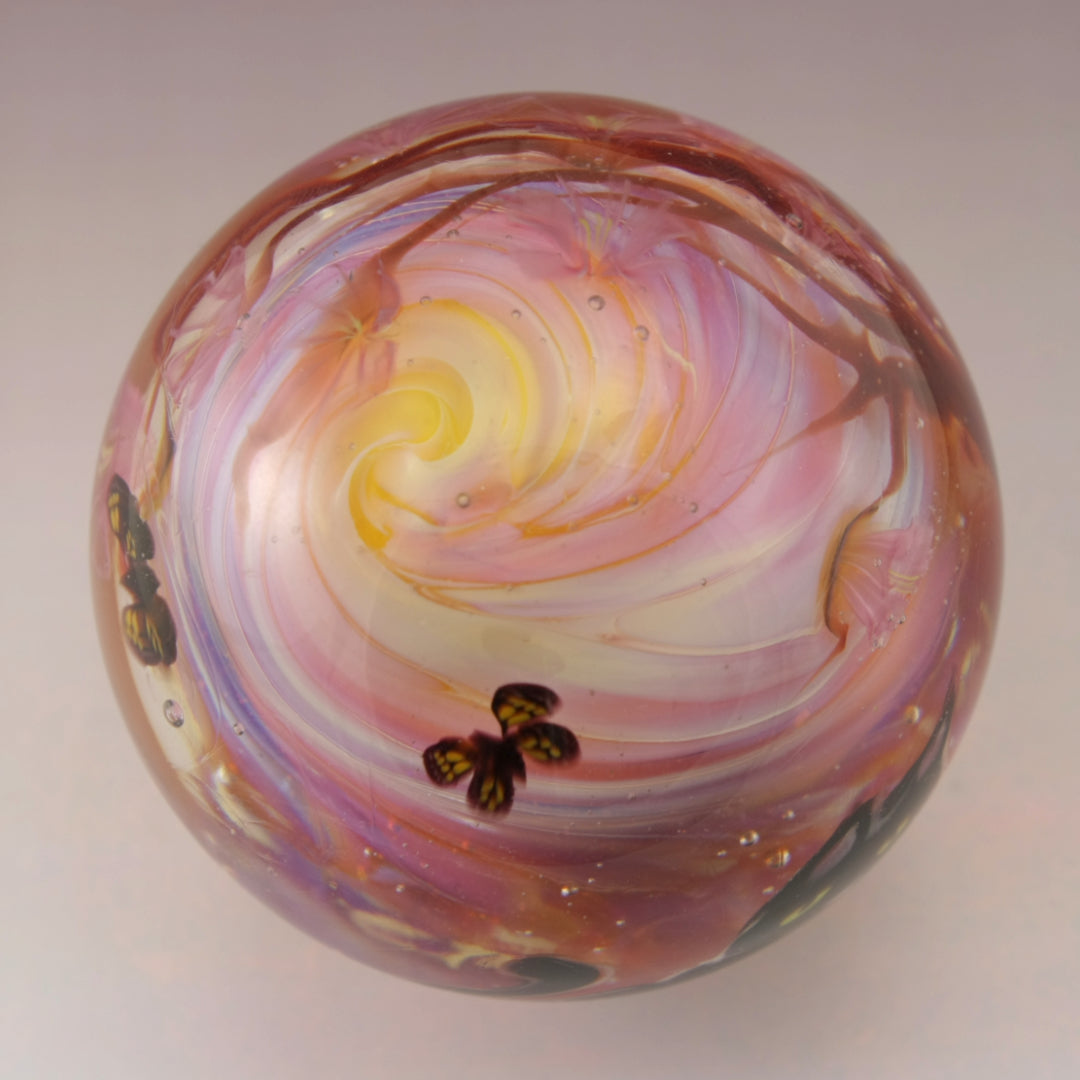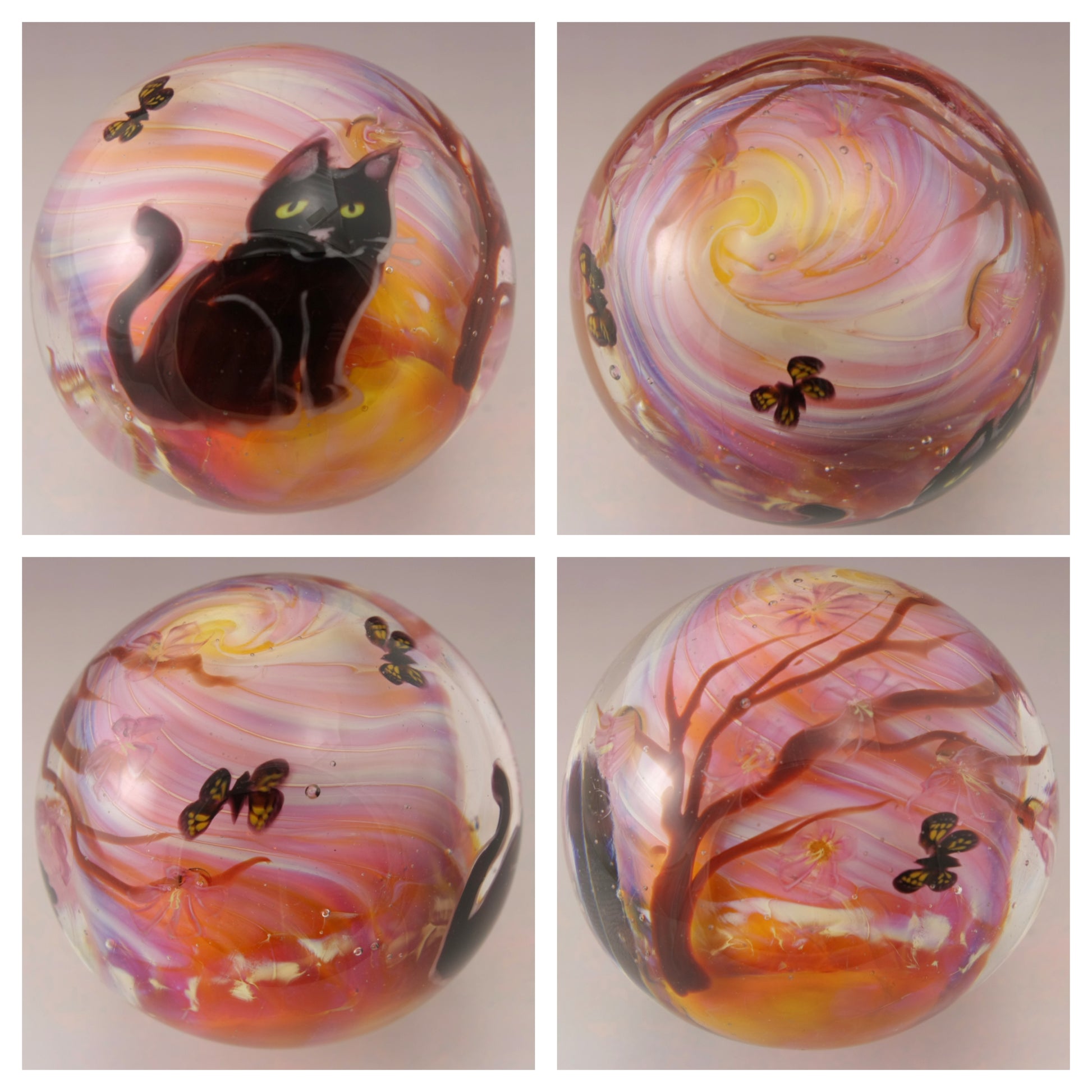 This handmade lampwork marble features a lustrous peachy orange pink background with a brown windblown tree with subtle pink purple blossoms with three butterflies dancing in the sky. I've drawn a black kitty with a pink nose and yellow eyes. This large marble has been heavily encased in clear to magnify