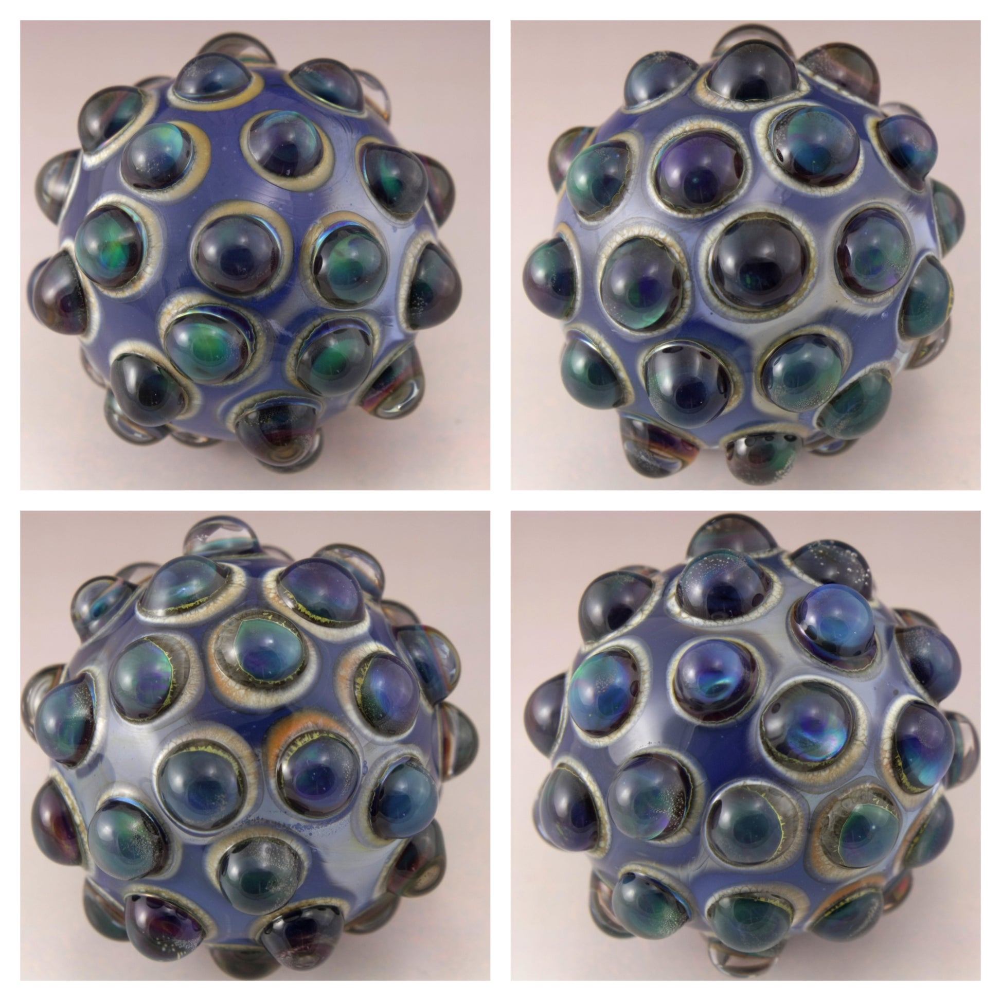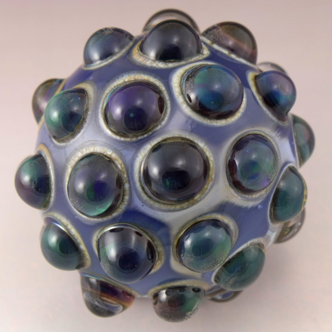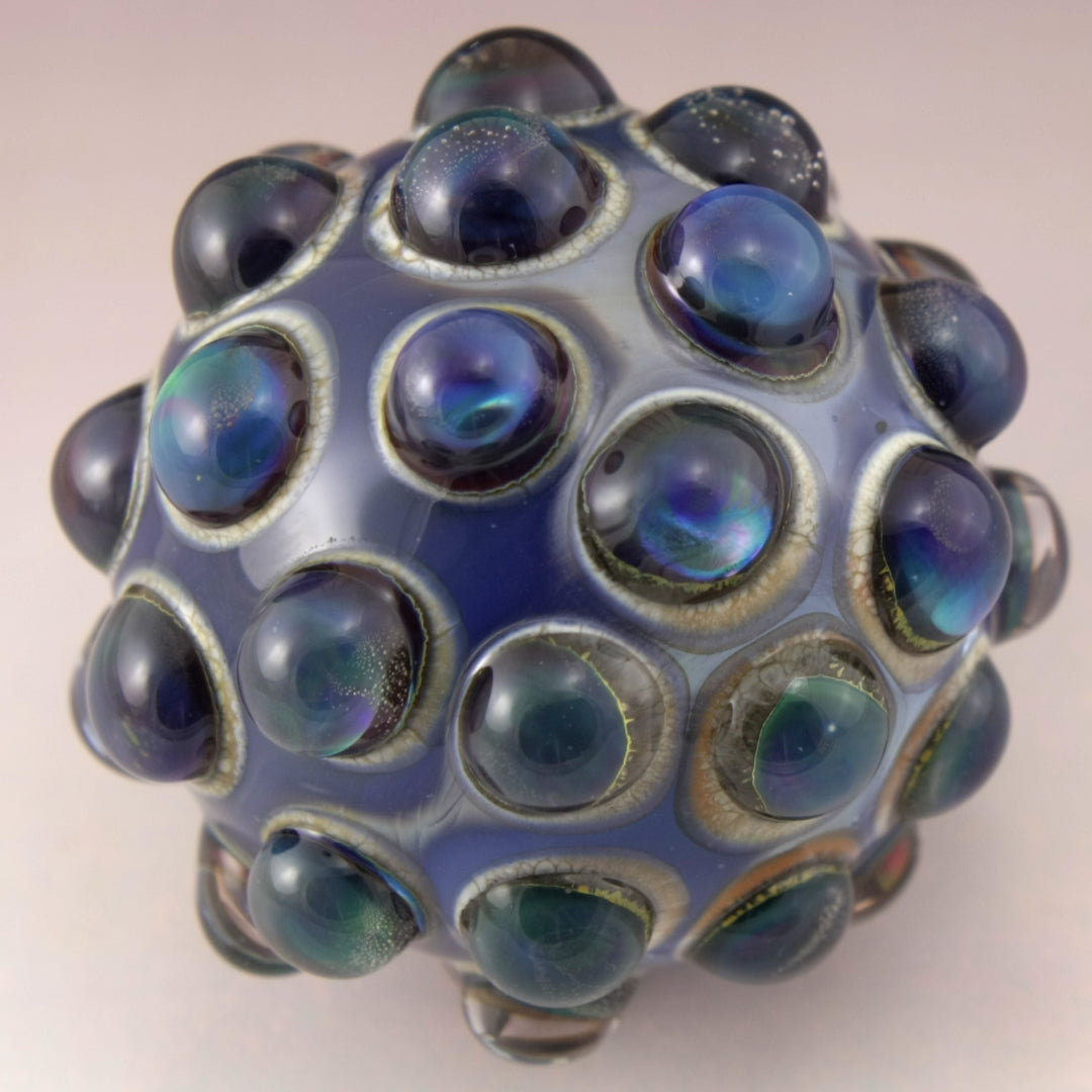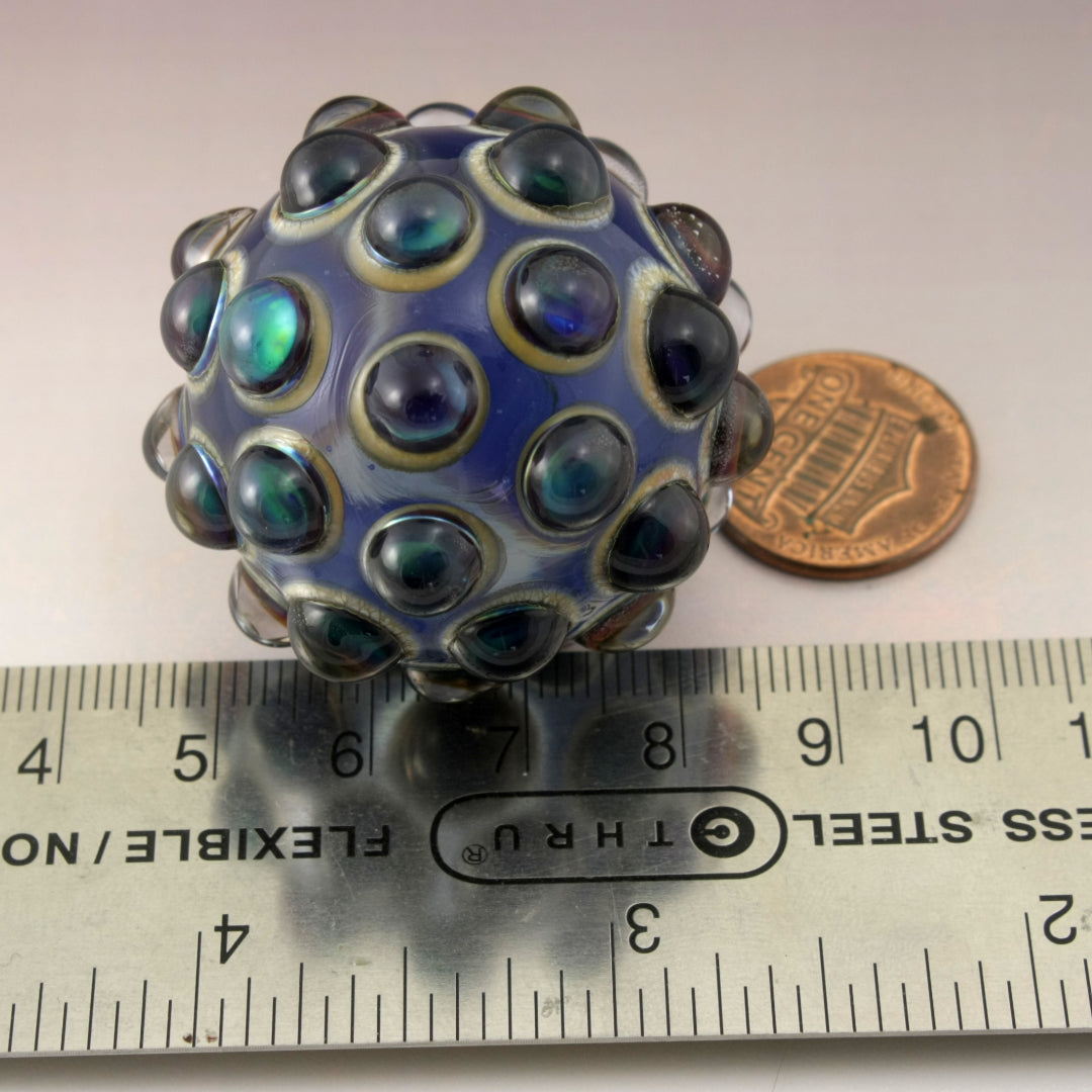 This handmade lampwork glass bead is made from a transparent light blue base with raised bumpy dots. The dots have a base of aged silvered ivory with blue green purple luster encased in a large dot of clear