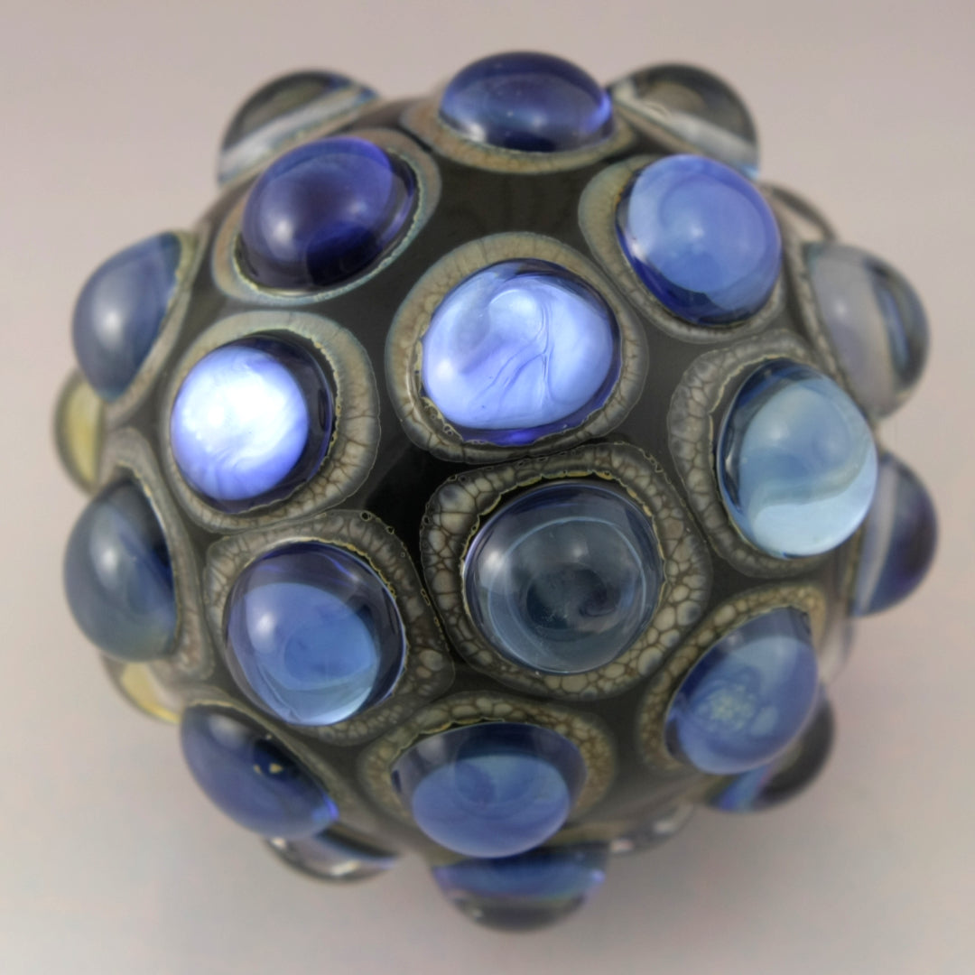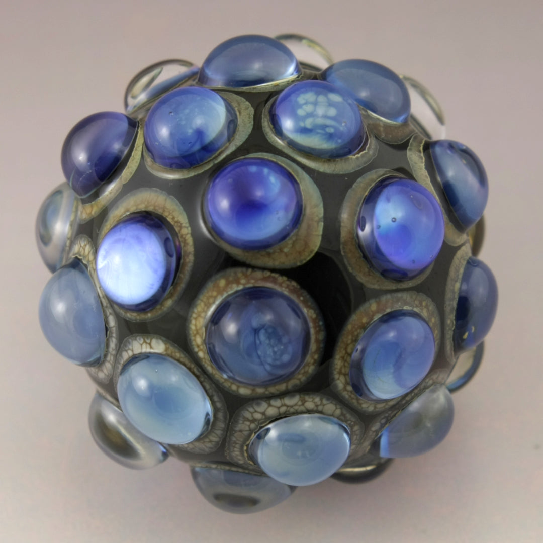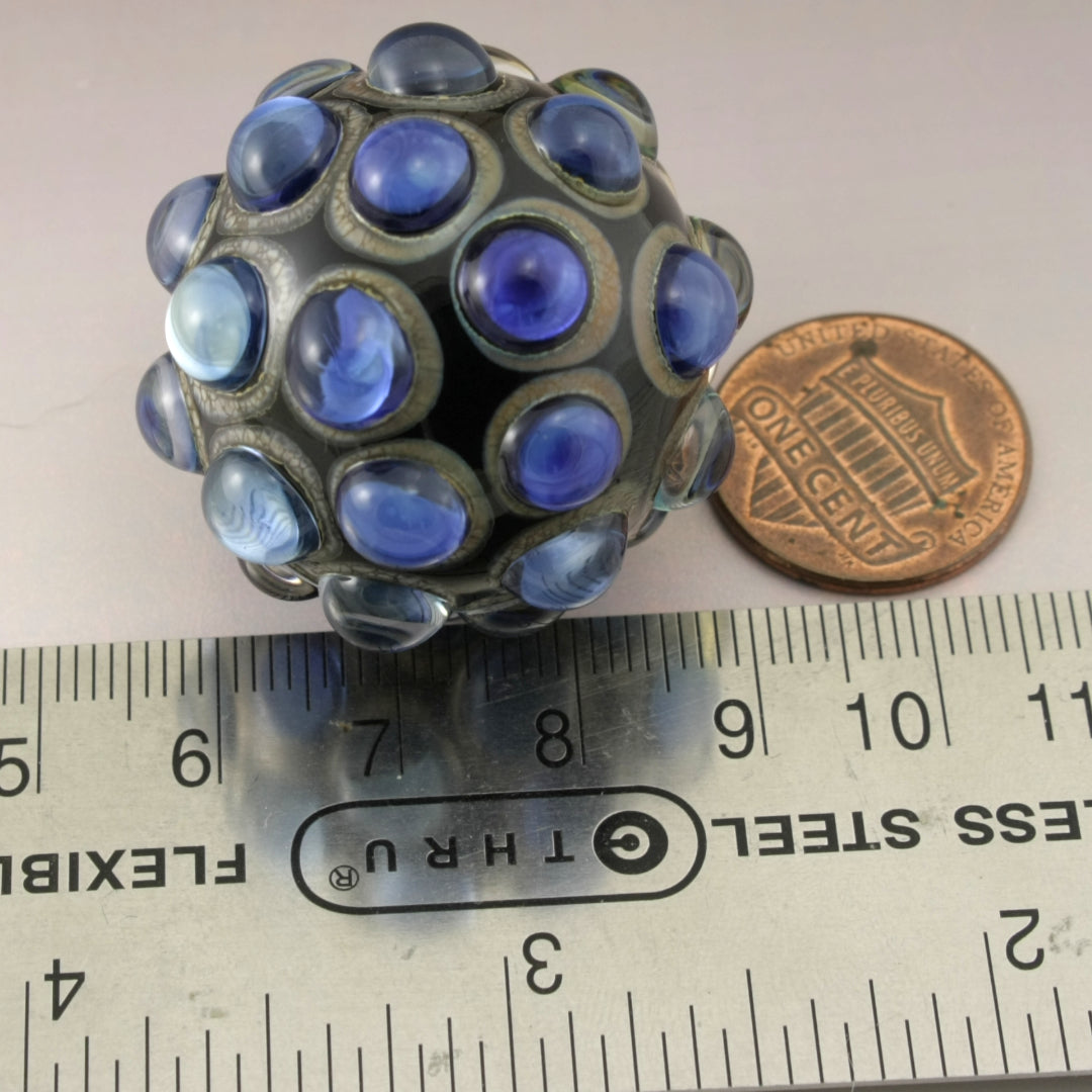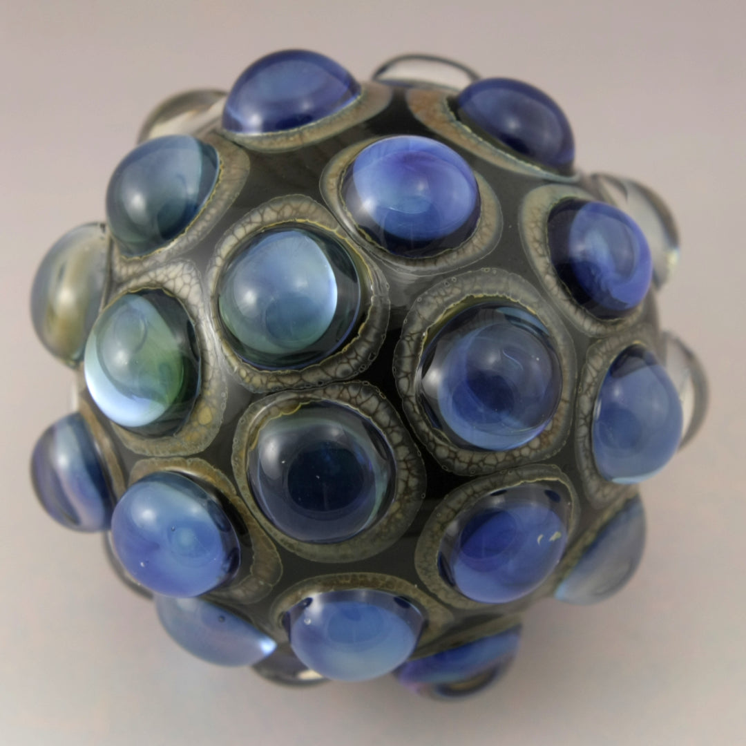 This handmade lampwork glass bead is made from a black base with raised bumpy dots. The dots have a base of aged silvered ivory with blue luster encased in a large dot of clear