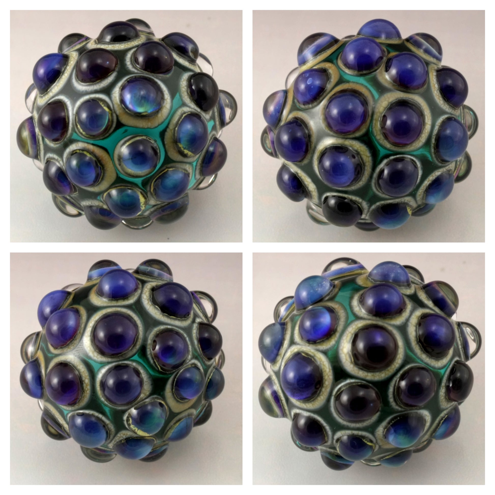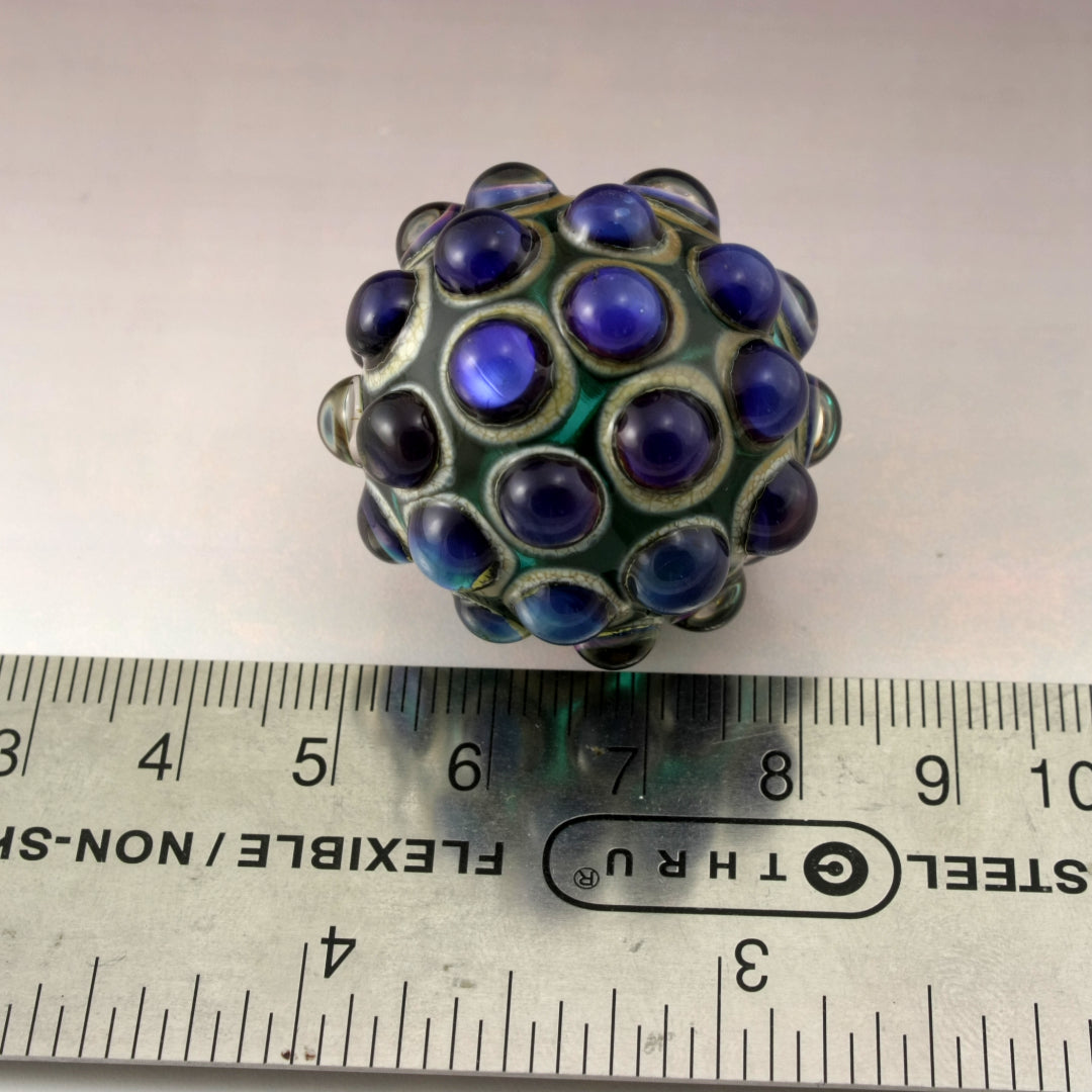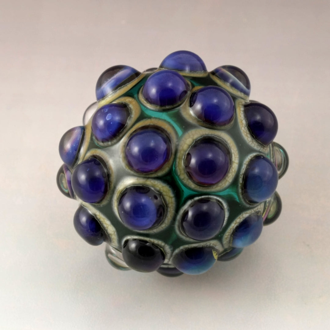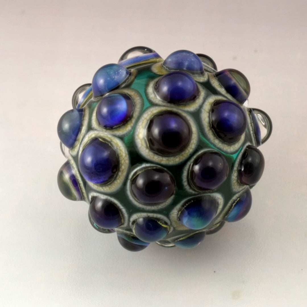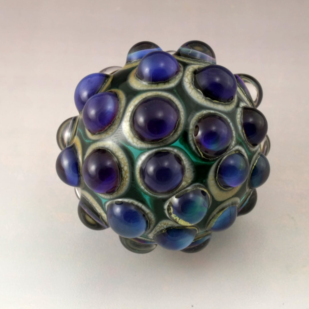 This handmade lampwork glass bead is made from a teal base with raised bumpy dots. The dots have a base of aged silvered ivory with blue purple encased in a large dot of clear