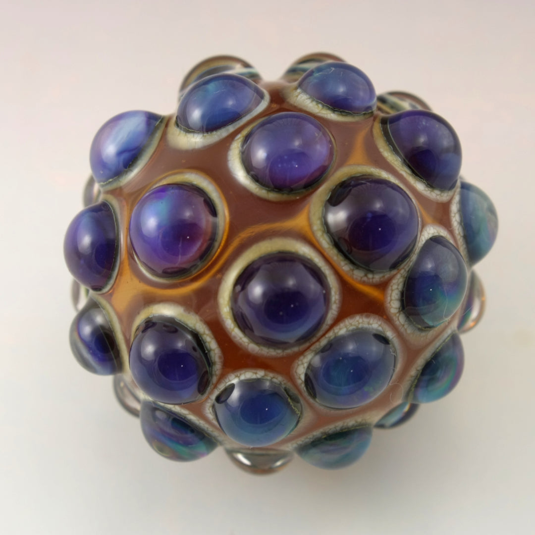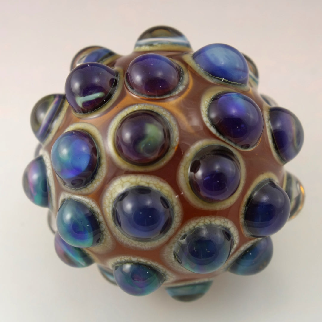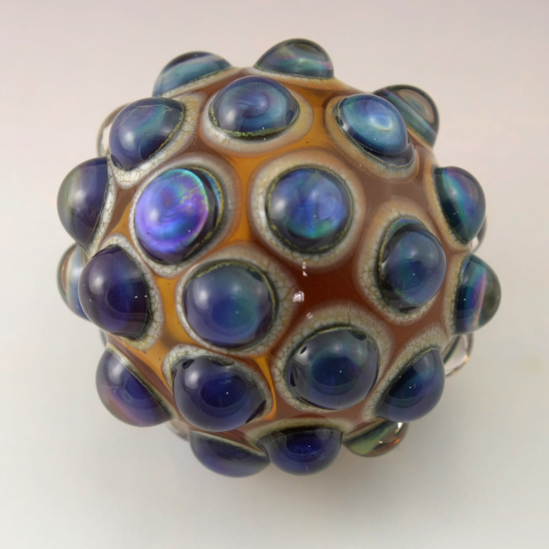 This handmade lampwork glass bead is made from a transparent topaz base with raised bumpy dots. The dots have a base of aged silvered ivory with blue purple luster encased in a large dot of clear
