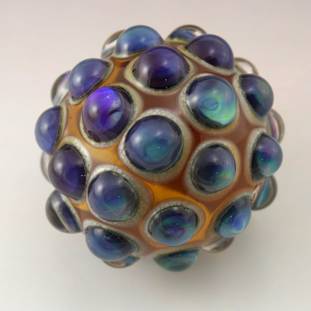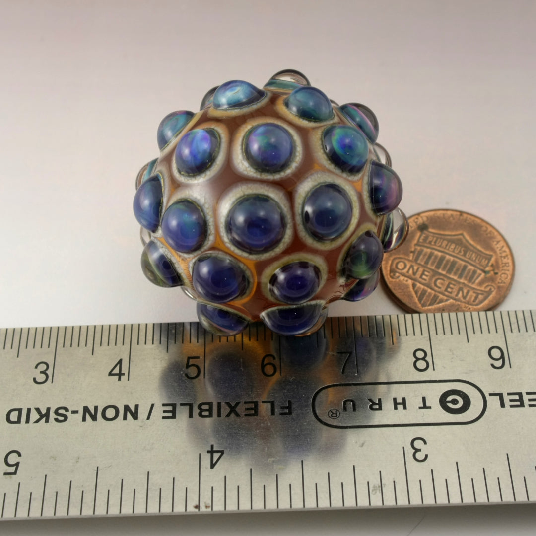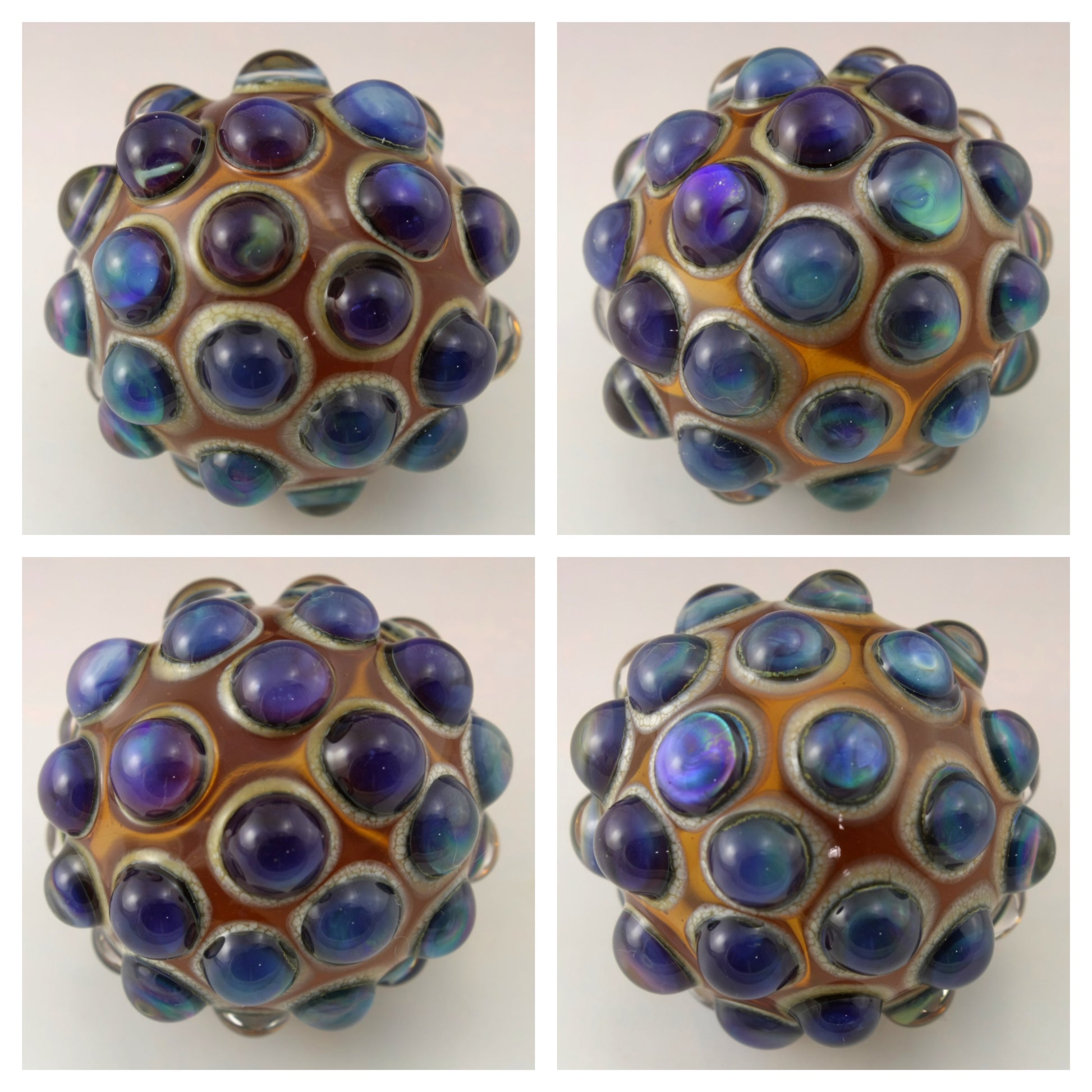 This handmade lampwork glass bead is made from a transparent topaz base with raised bumpy dots. The dots have a base of aged silvered ivory with blue purple luster encased in a large dot of clear