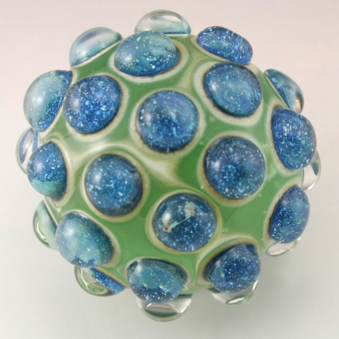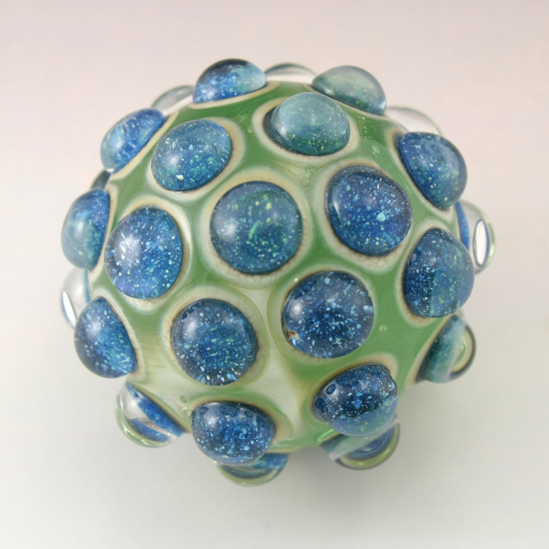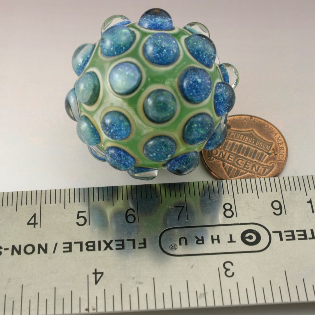 This handmade lampwork glass bead is made from a transparent pale emerald green base with raised bumpy dots. The dots have a base of aged silvered ivory with blue speckled luster encased in a large dot of clear