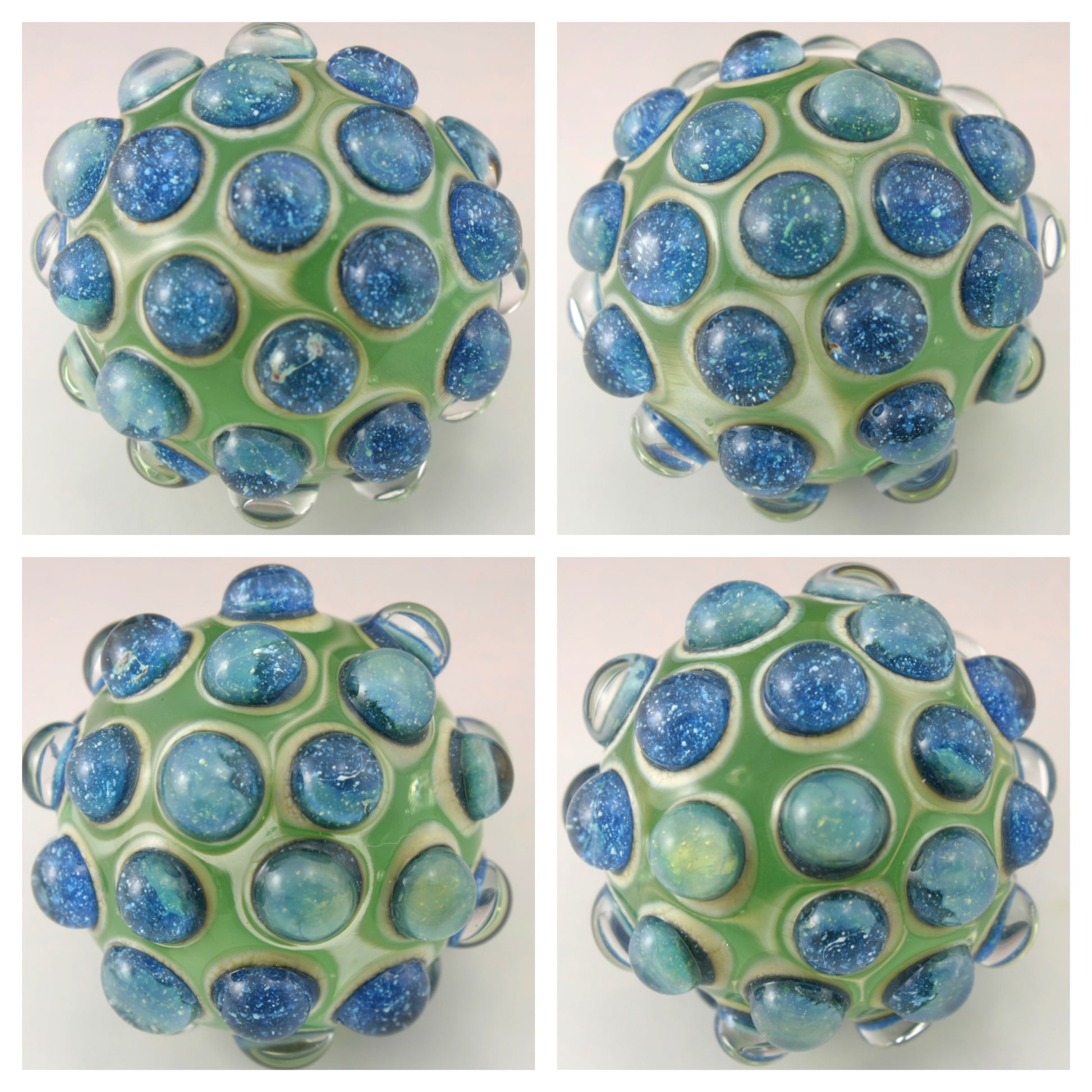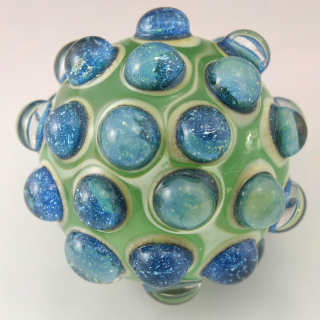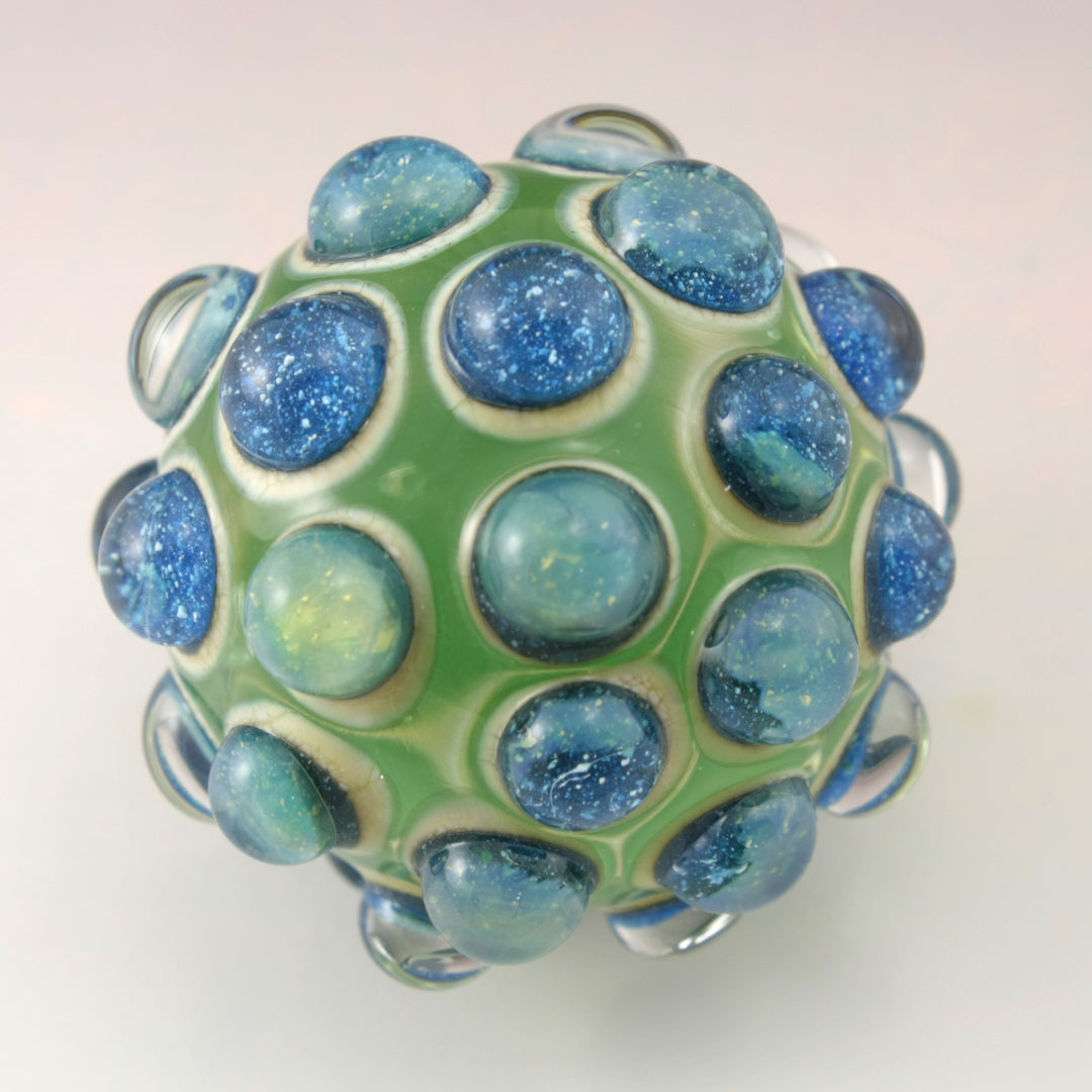 This handmade lampwork glass bead is made from a transparent pale emerald green base with raised bumpy dots. The dots have a base of aged silvered ivory with blue speckled luster encased in a large dot of clear