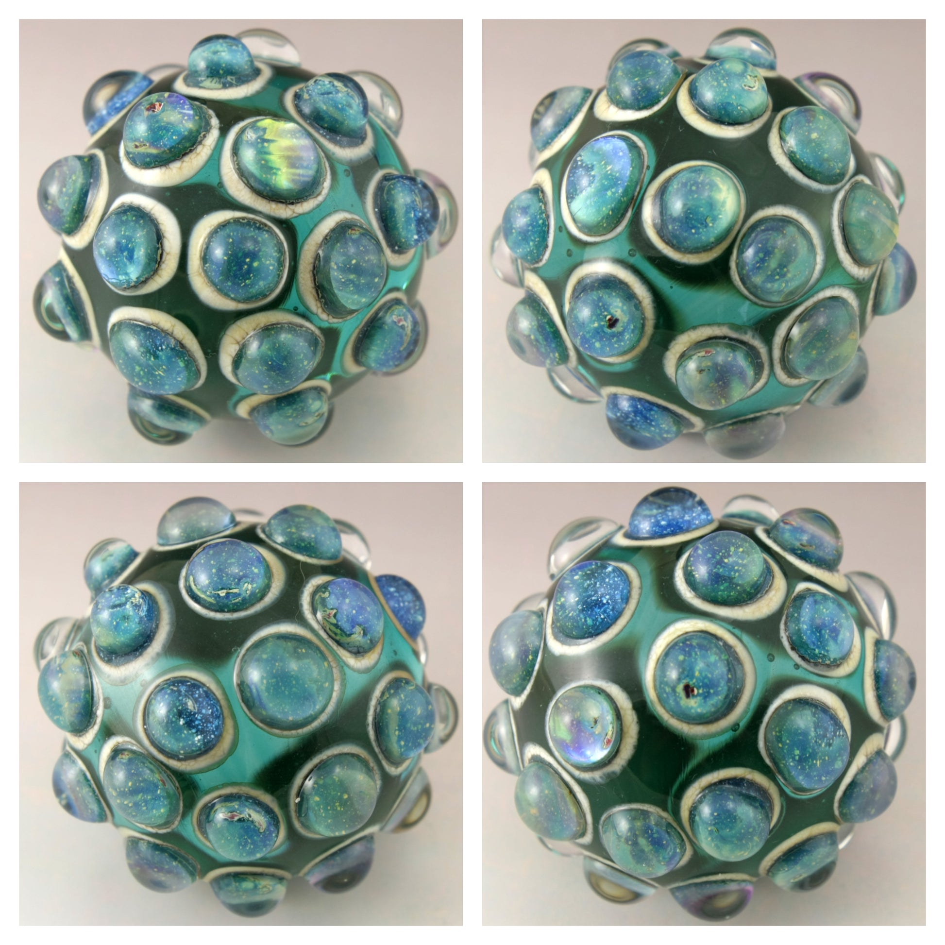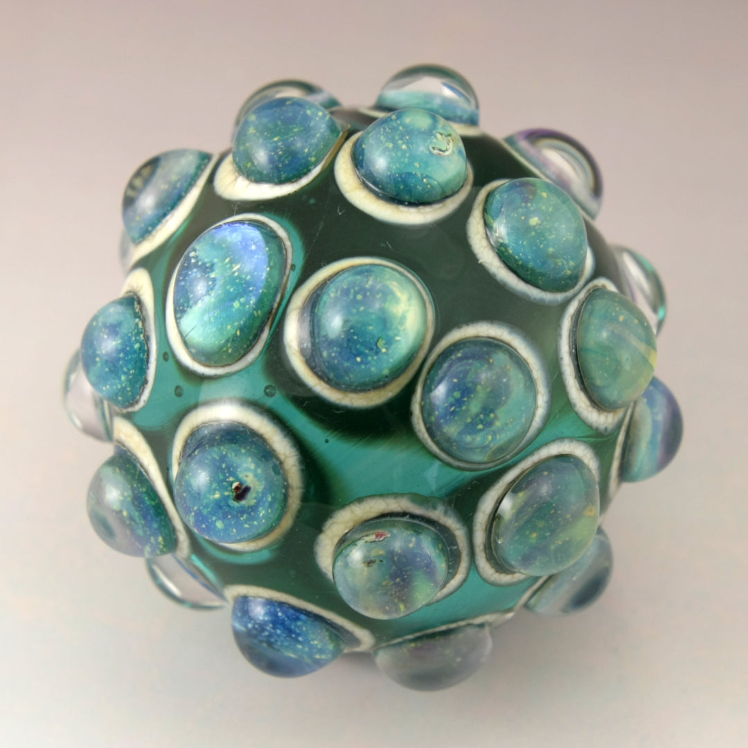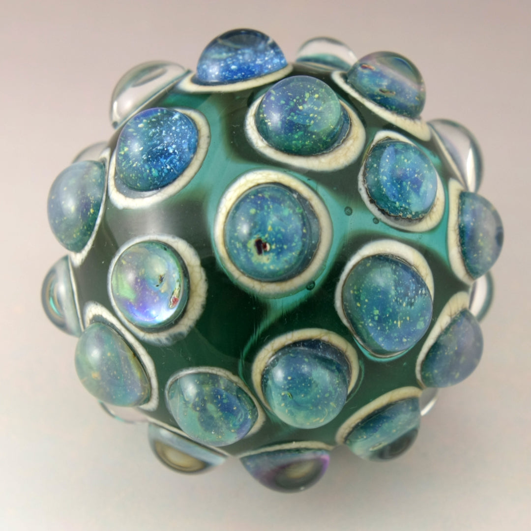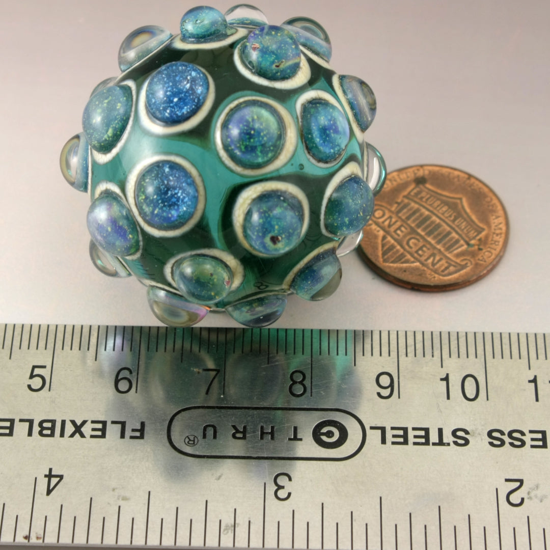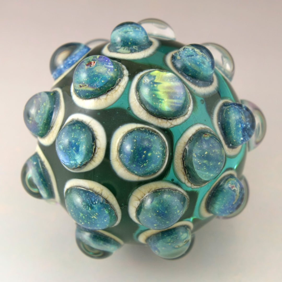 This handmade lampwork glass bead is made from a transparent teal base with raised bumpy dots. The dots have a base of aged silvered ivory with blue speckled luster encased in a large dot of clear
