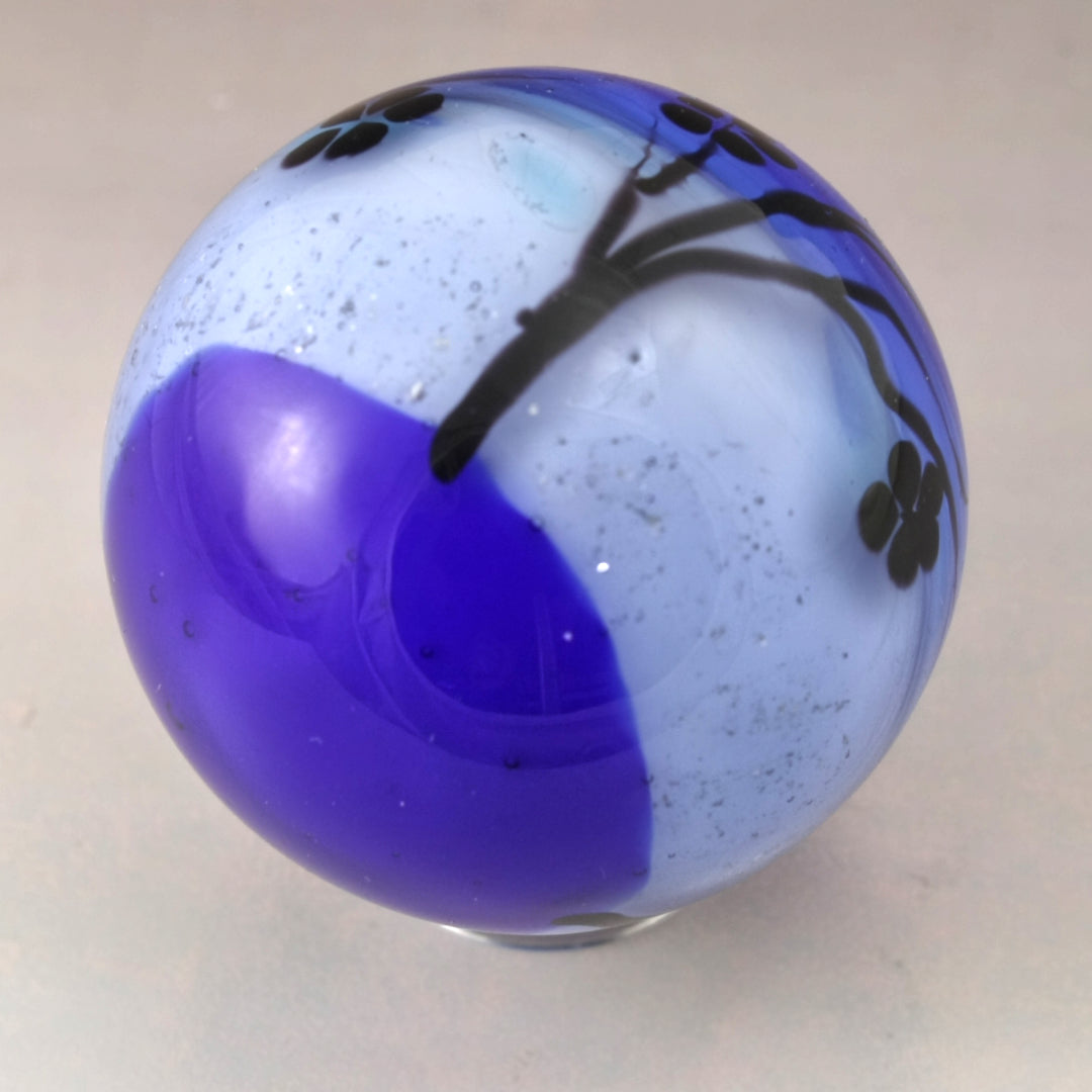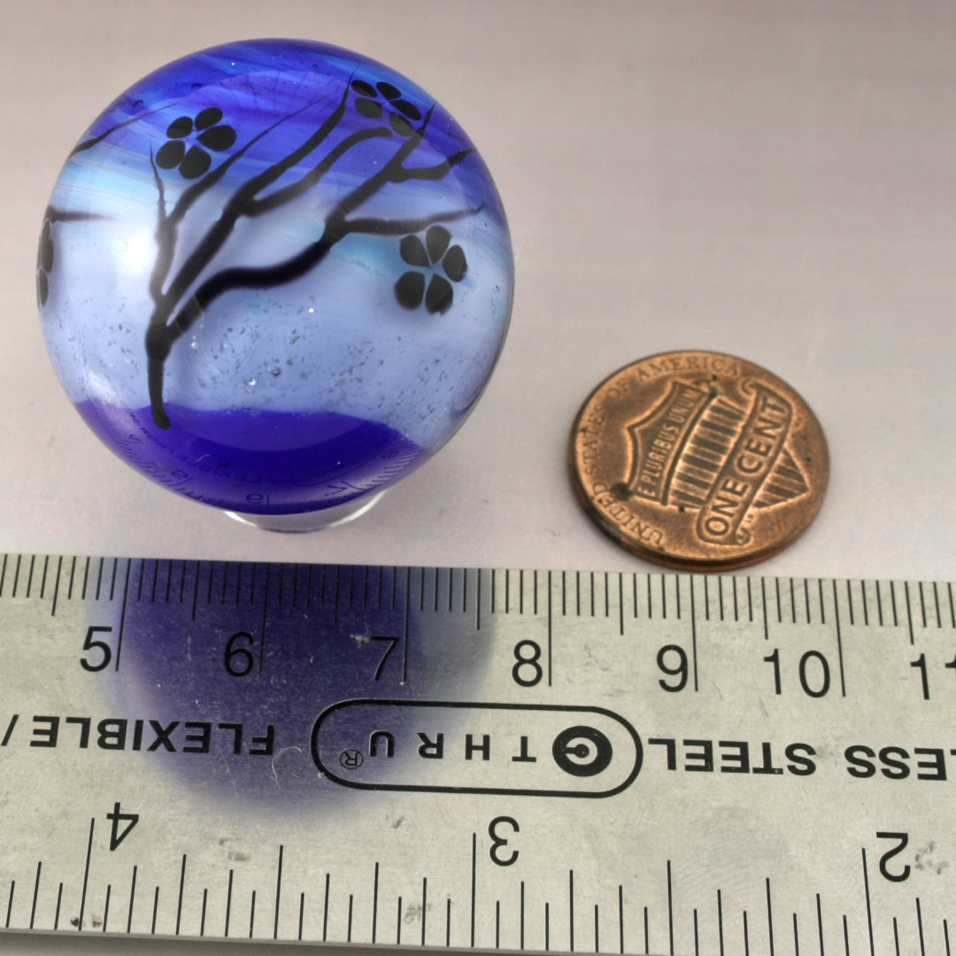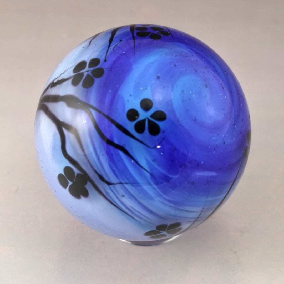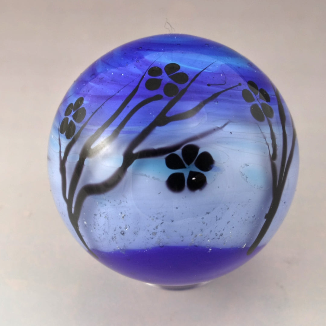 This handmade lampwork glass bead is made from a base of transparent light blue and silver mica powder over white with swirls of darker blue goldstone for a soft sparkle. Black tree silhouettes come from cobalt blue ground with blossoms signifying to beginning of Spring.