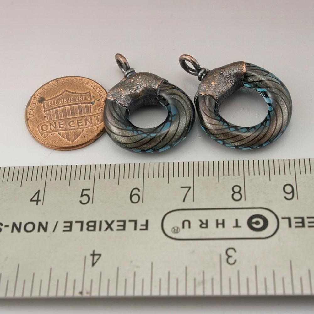 Handmade sparkling goldstone encased in aqua with black pinstripes helix twisty circle loop with Electroforming Oxidized pair