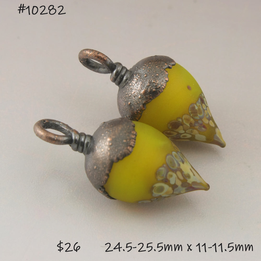 Handmade Etched bright yellow Lampwork Glass drops with raku frit with Copper Electroforming Oxidized pair