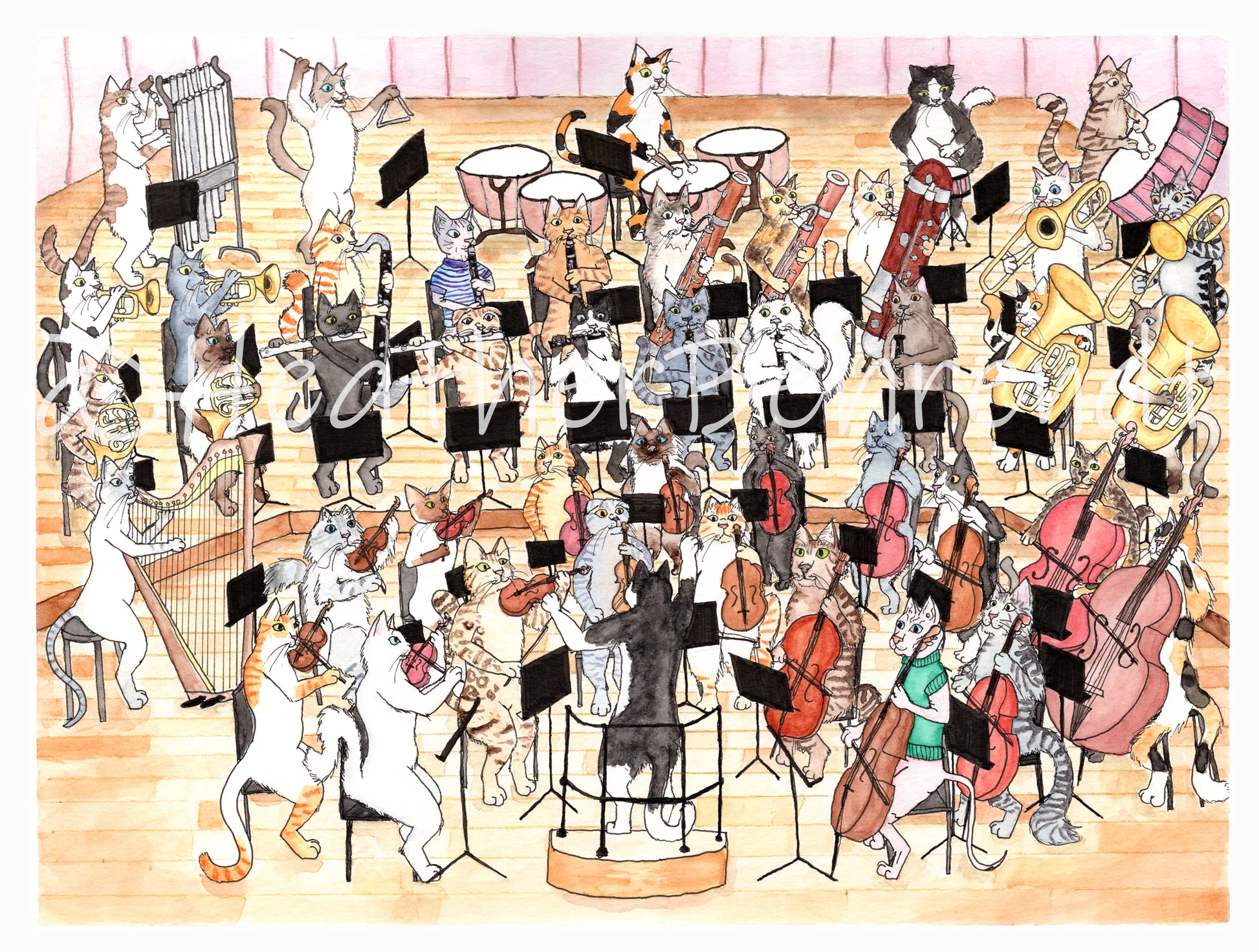 Print of Ink and Watercolor Art by Heather Behrendt. This 9" x 12" art print features a cat orchestra complete with Conductor, violins, violas, cellos, double bass, flutes, piccolo, clarinets, bass clarinet, oboes, english horn, bassoons, contrabassoon, french horns, trumpets, trombones, Tubas, Bass Drum, Snare Drum, Timpani, Chimes and don't forget the triangle.