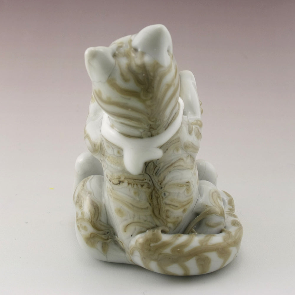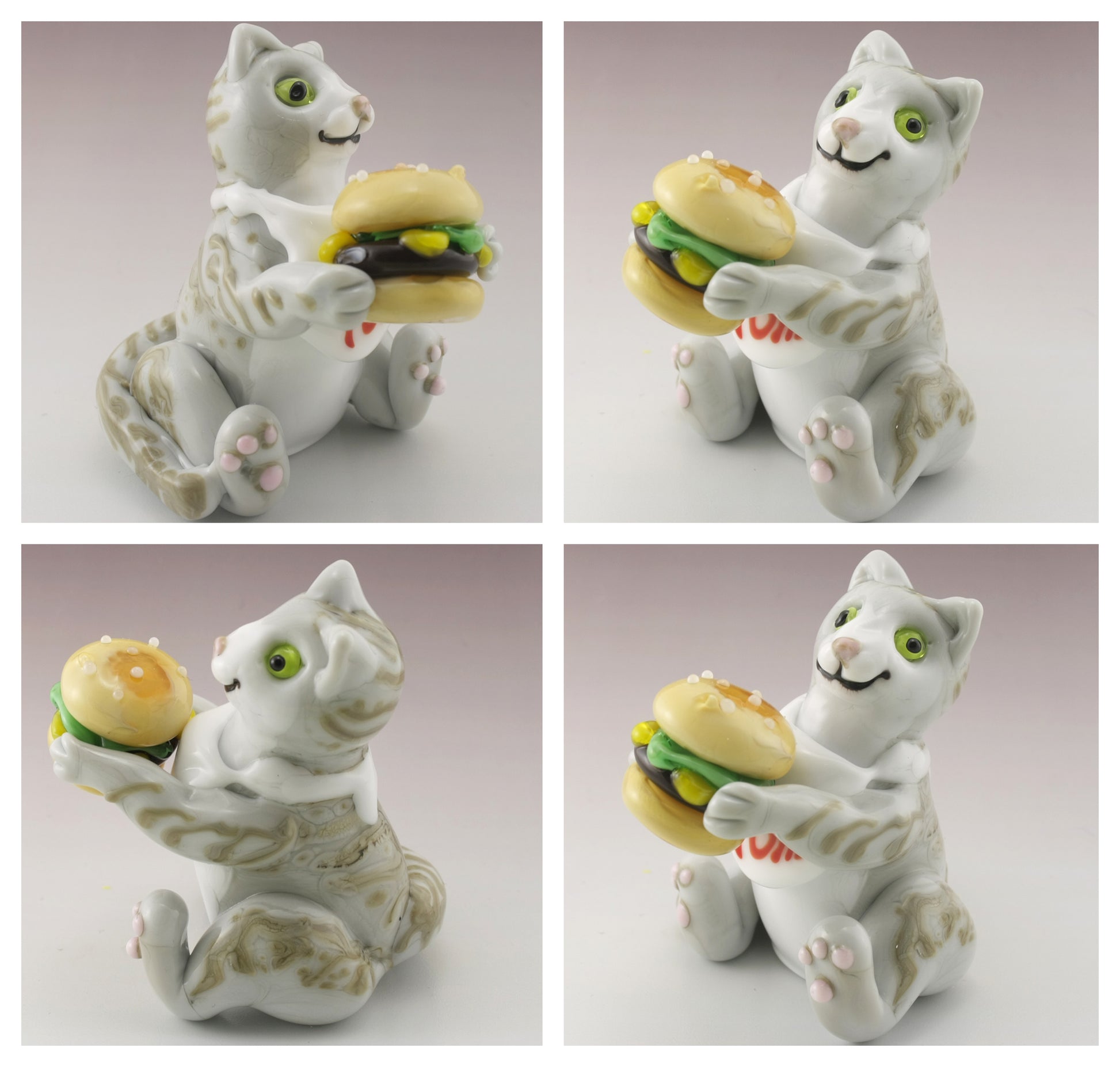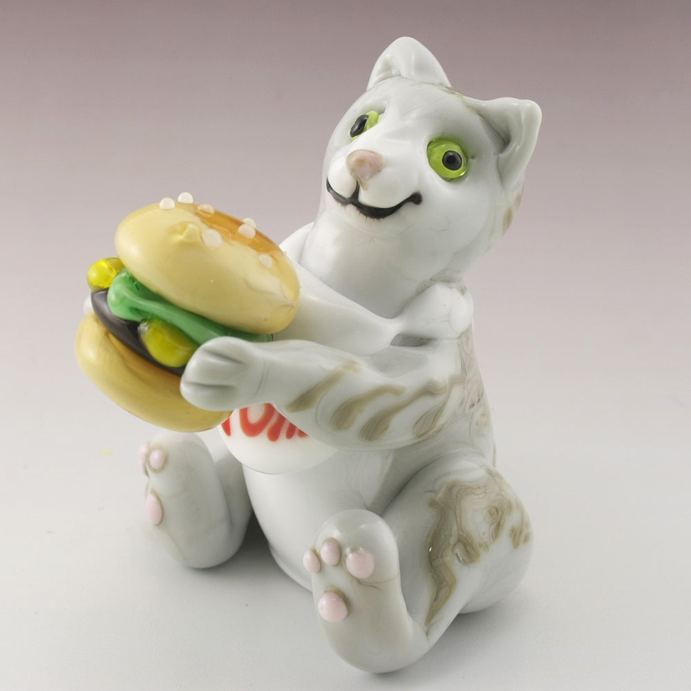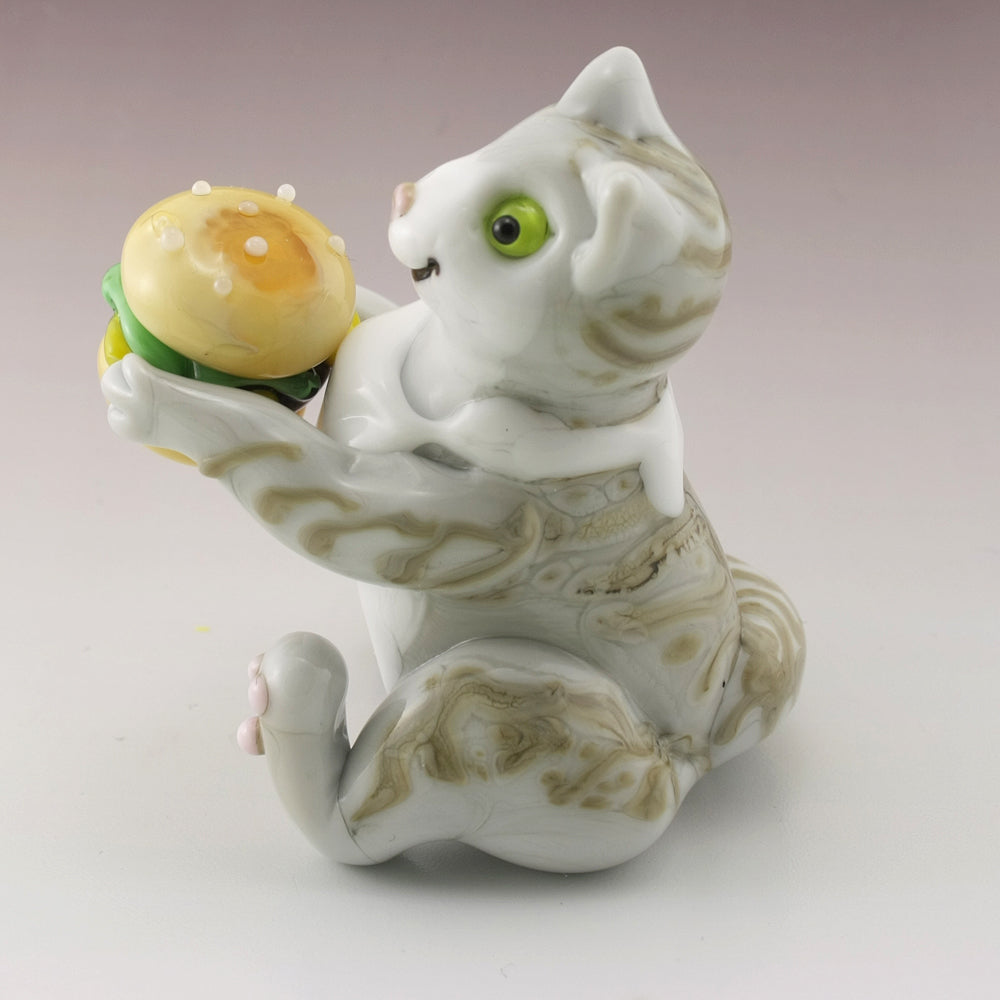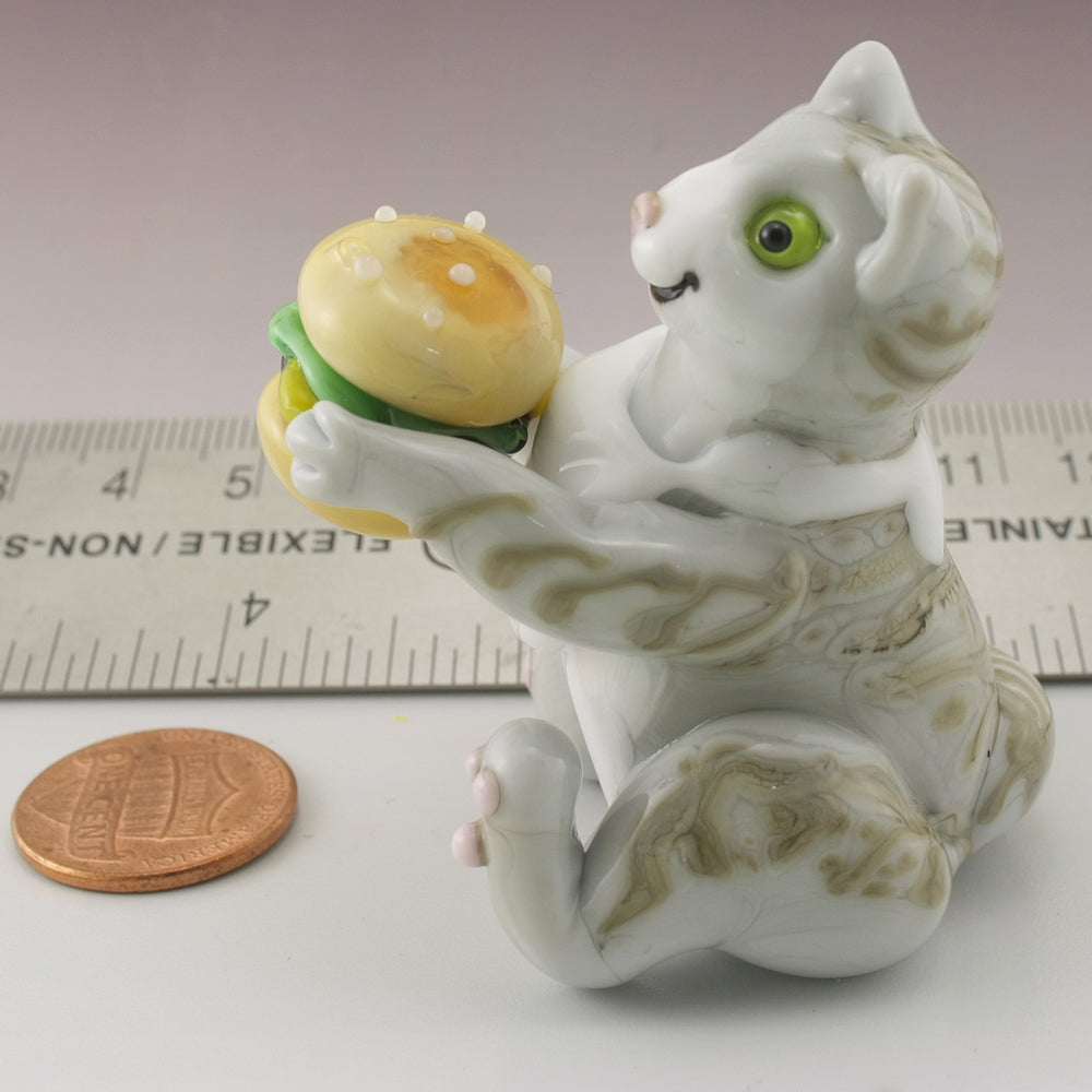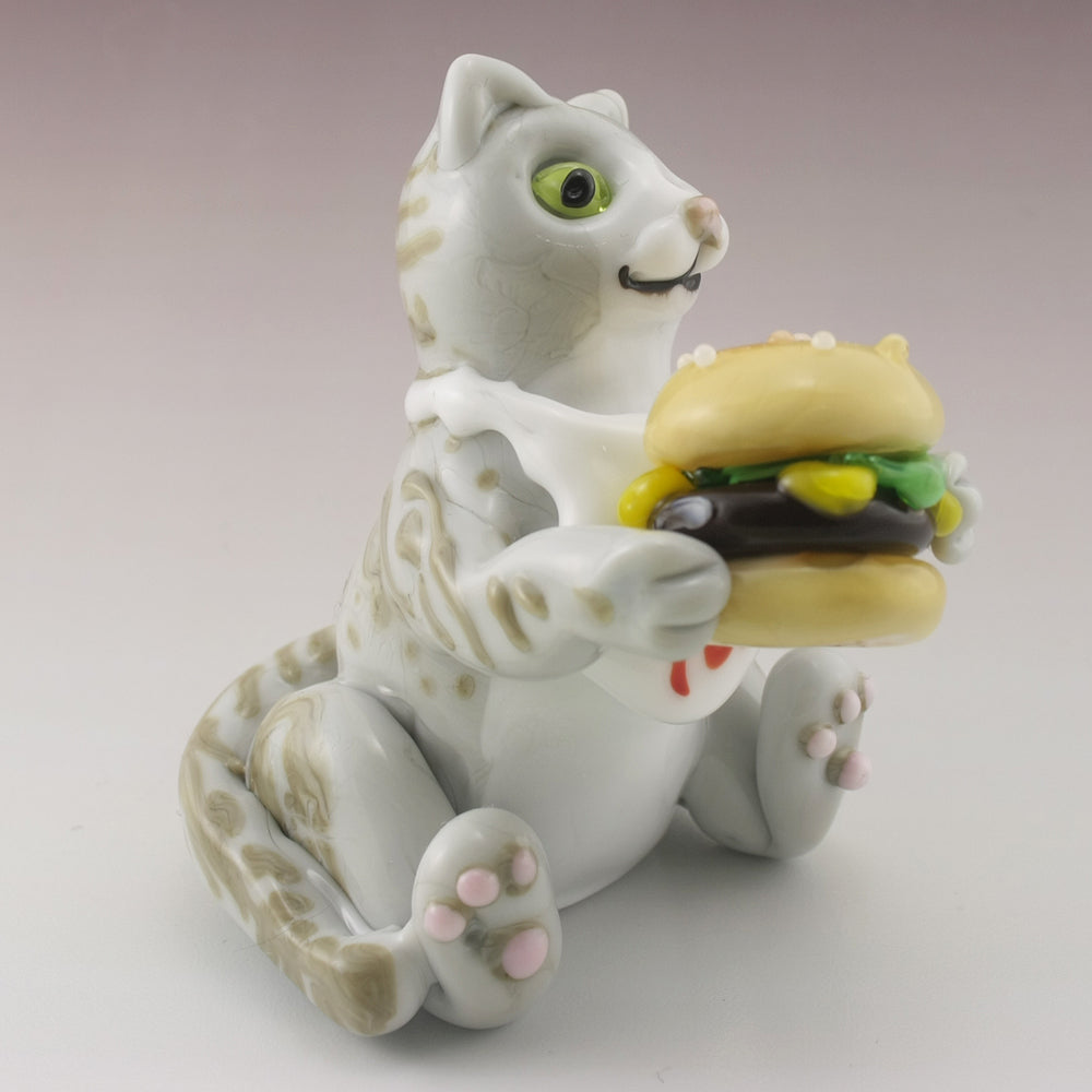 This adorable lampwork glass kitty sculpture is made with gray and white glass with darker grey brown tabby stripes. He is holding a cheeseburger with lettuce and a sesame seed bun. It may be bigger than his head, but he is ready to dig in. He is wearing a white bib with "Yum" written on it to catch any drips. He has green eyes, a pink nose and pink toebeans.
