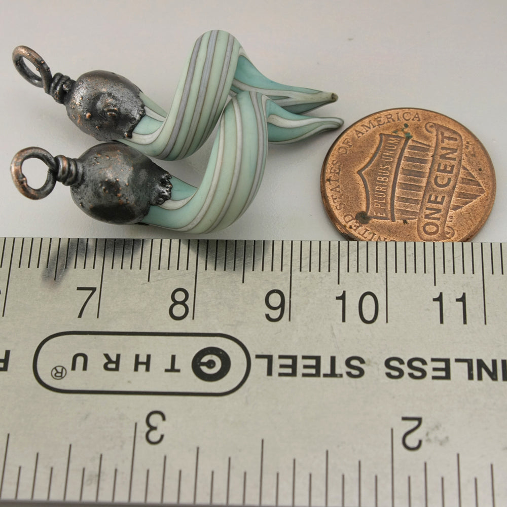 handmade etched copper green with ivory pinstripes Lampwork Glass curly spirals with Copper Electroforming Oxidized pair
