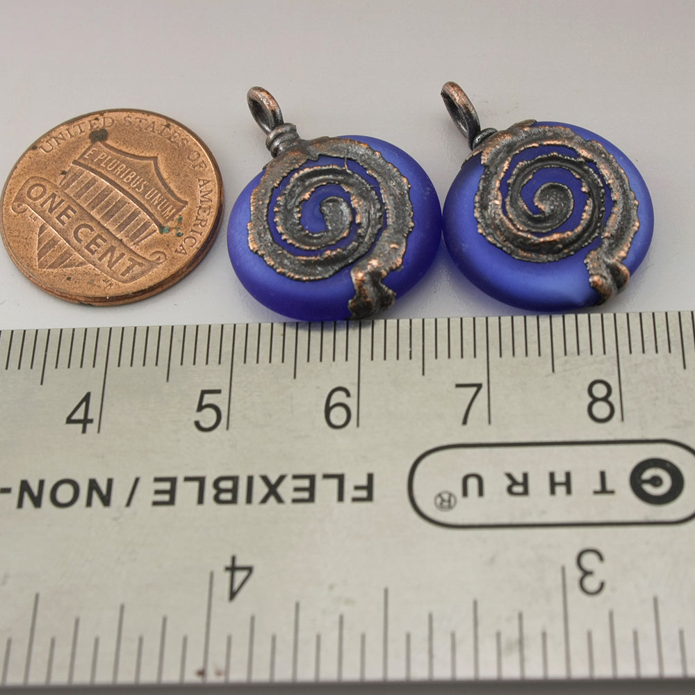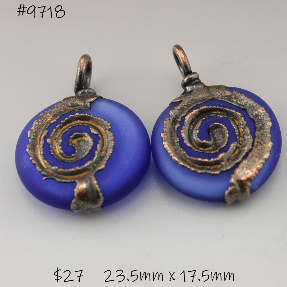 Handmade Etched intense blue over white Lampwork Glass lentils with spiral Copper Electroforming Oxidized pair