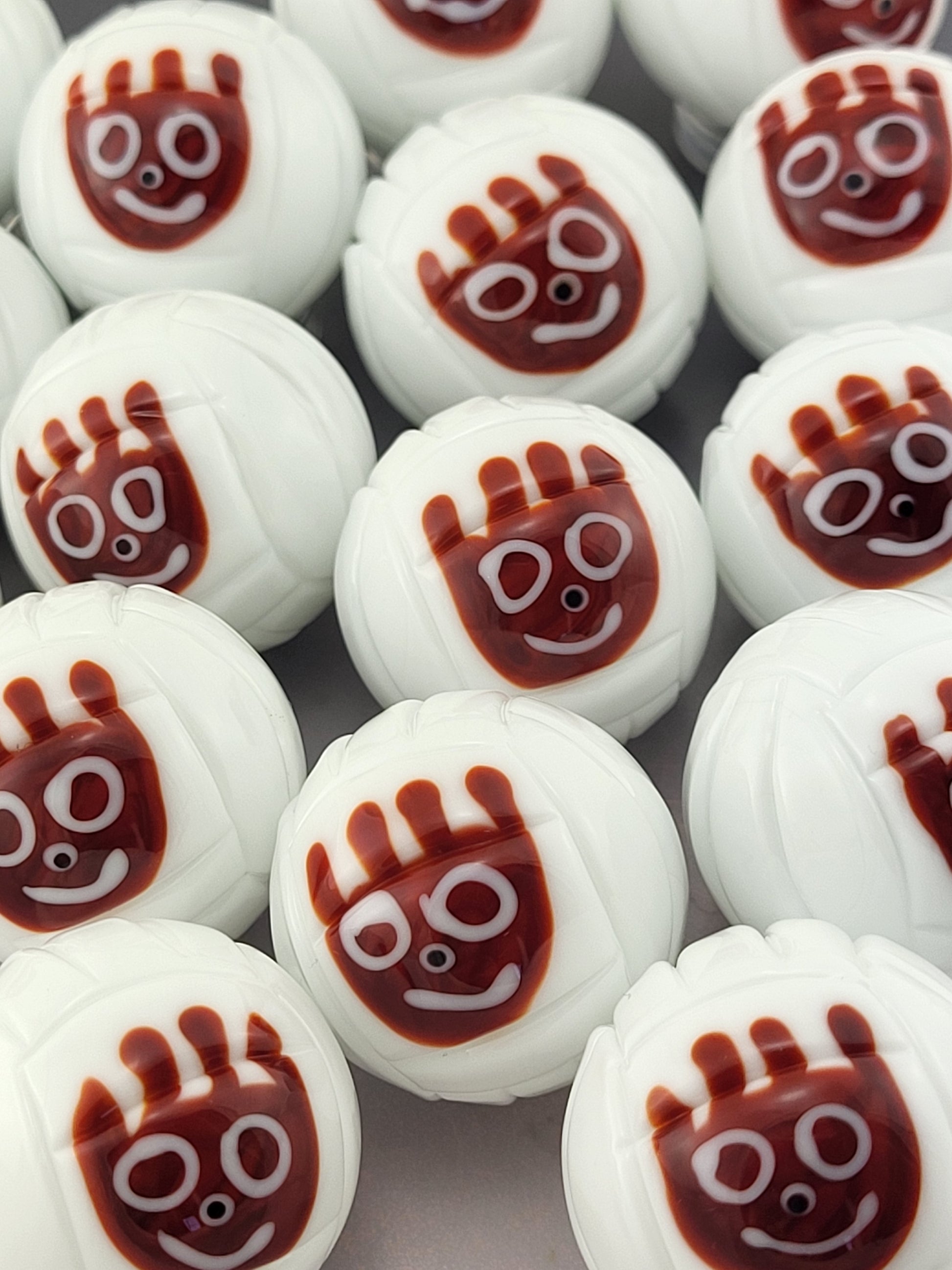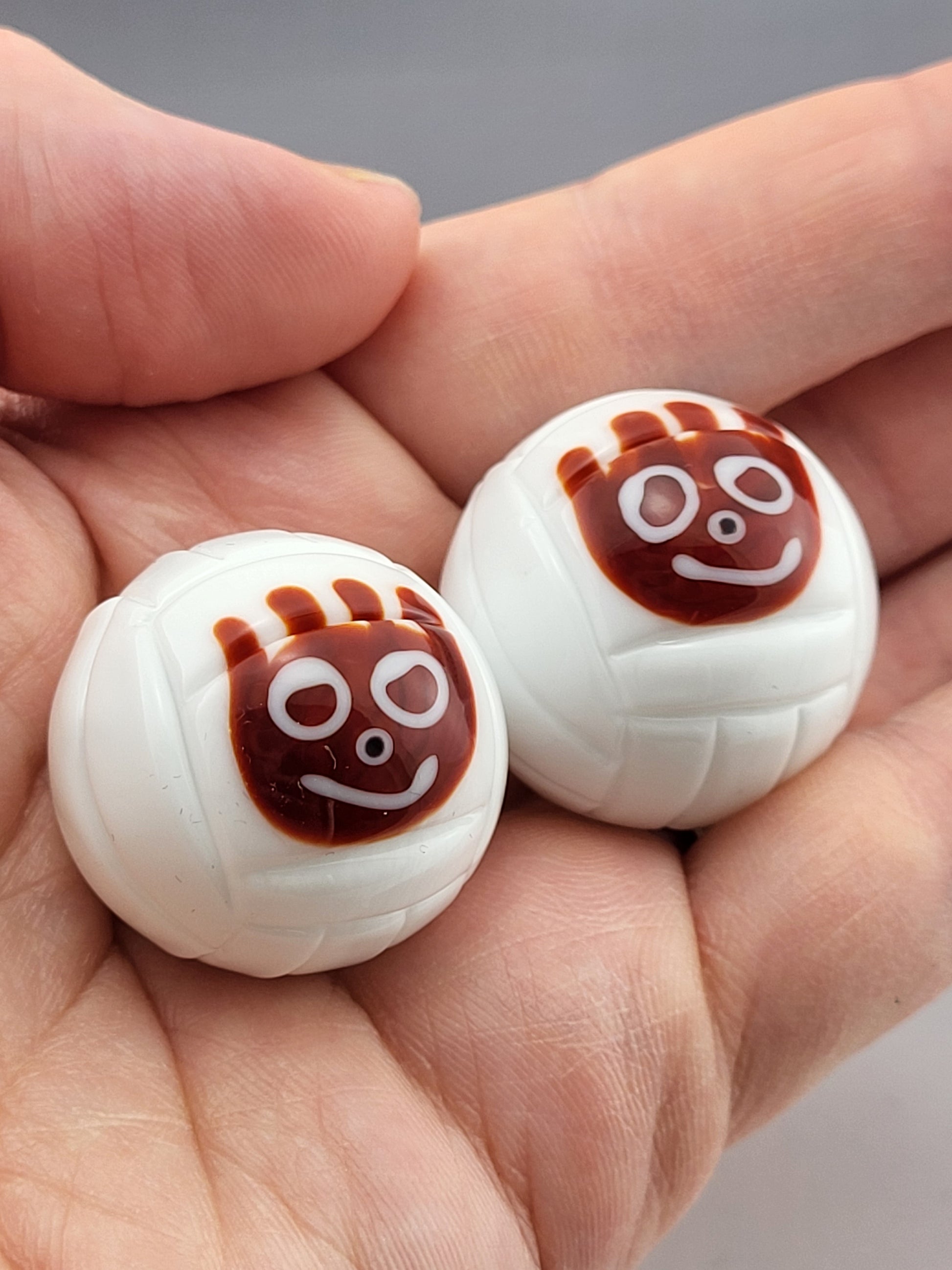 White volleyball marble with an adorable face drawn in sienna, black and white stringer. This little Wilson isn't much for talking, but is a great listener, will always keep you company and fits in your pocket