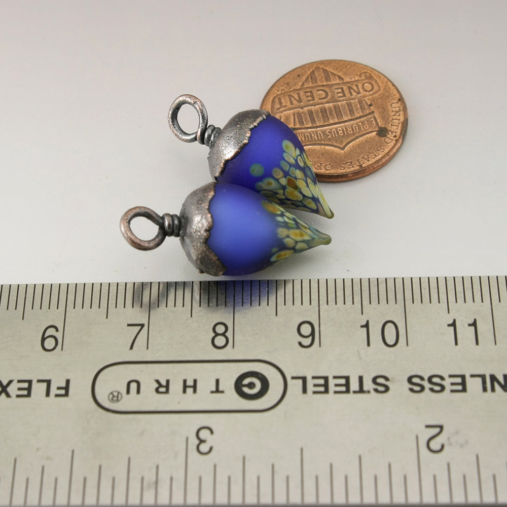 Handmade Etched intense blue over white Lampwork Glass drops with Copper Electroforming Oxidized pair