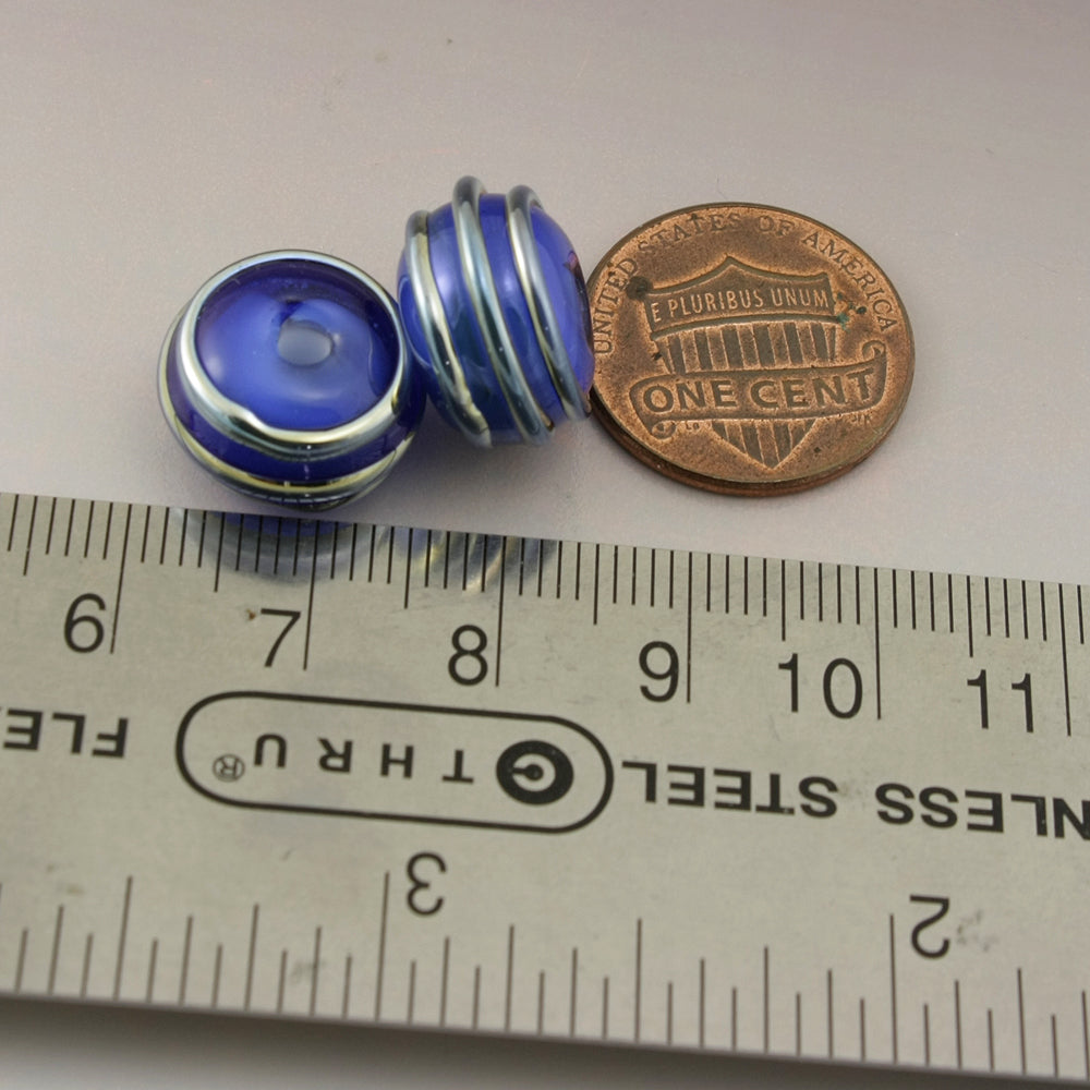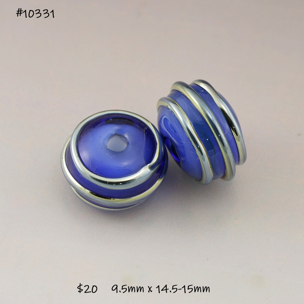 Handmade intense blue over white transparent rondelles with metallic lines left raised for texture.
