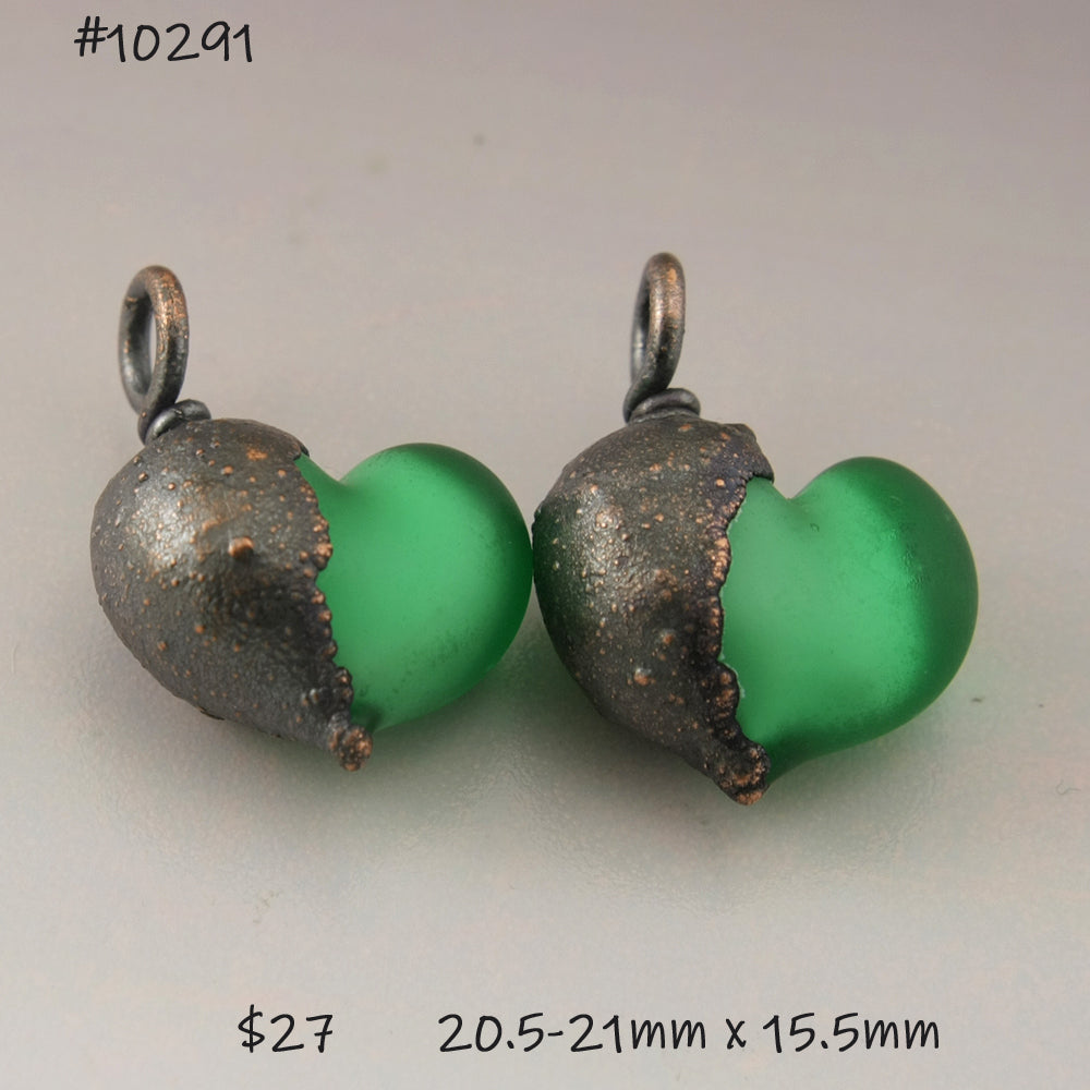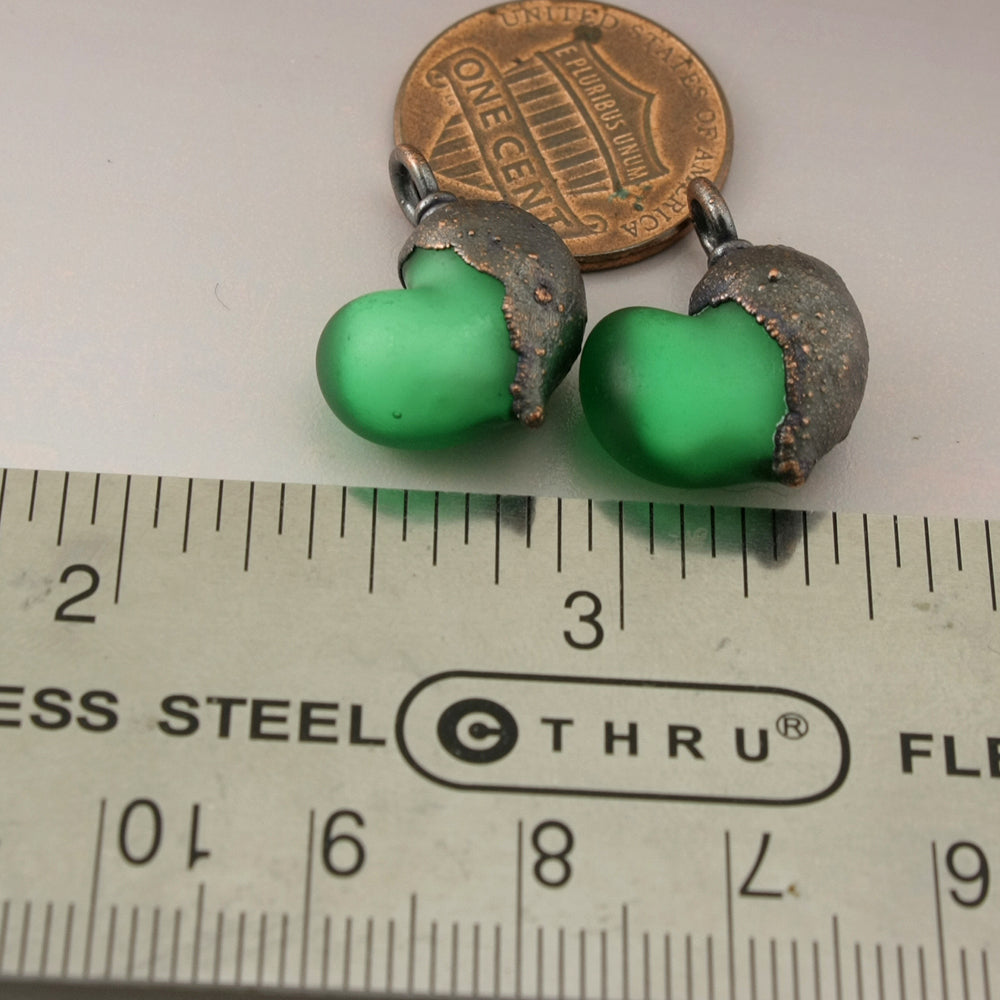 Handmade Etched emerald green over white Lampwork Glass hearts with Copper Electroforming Oxidized pair