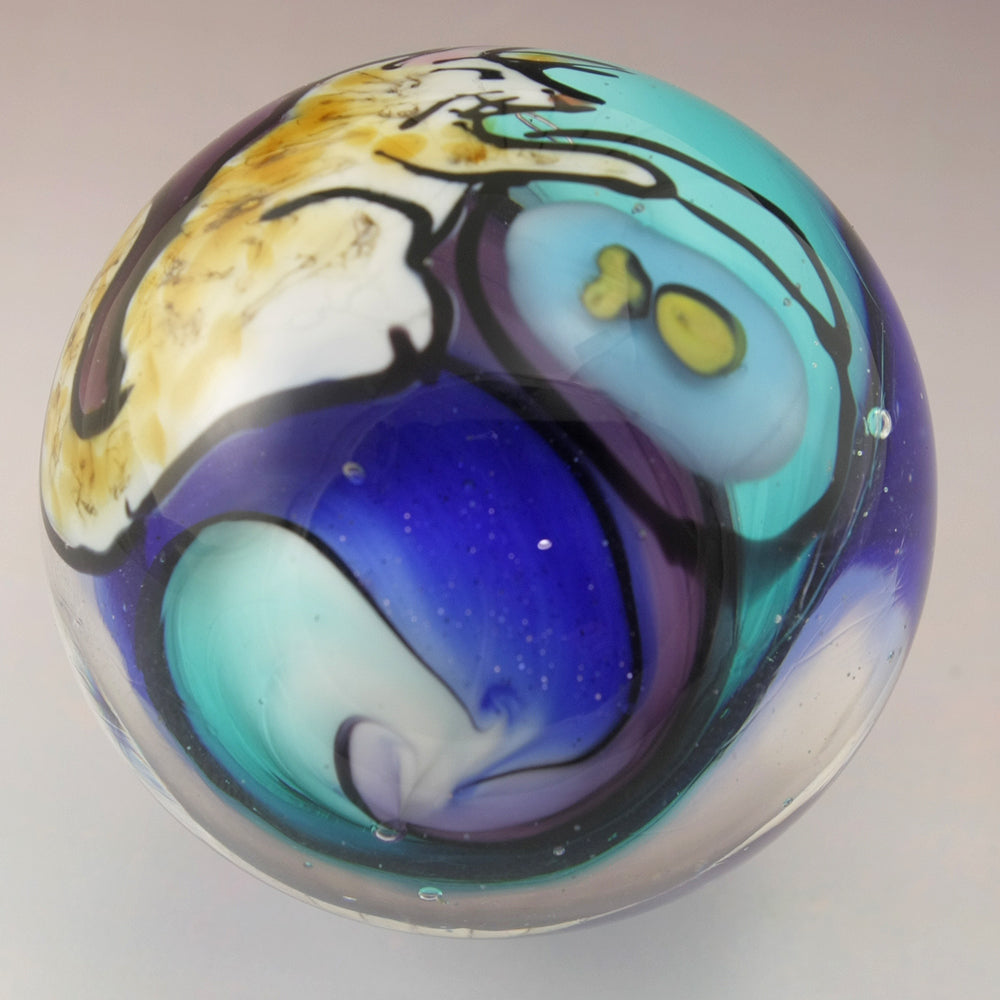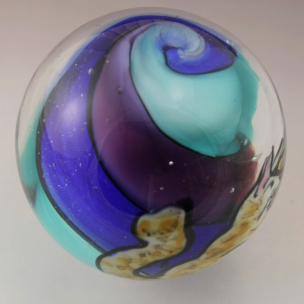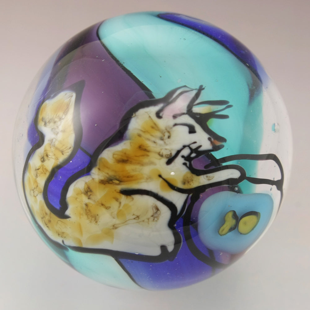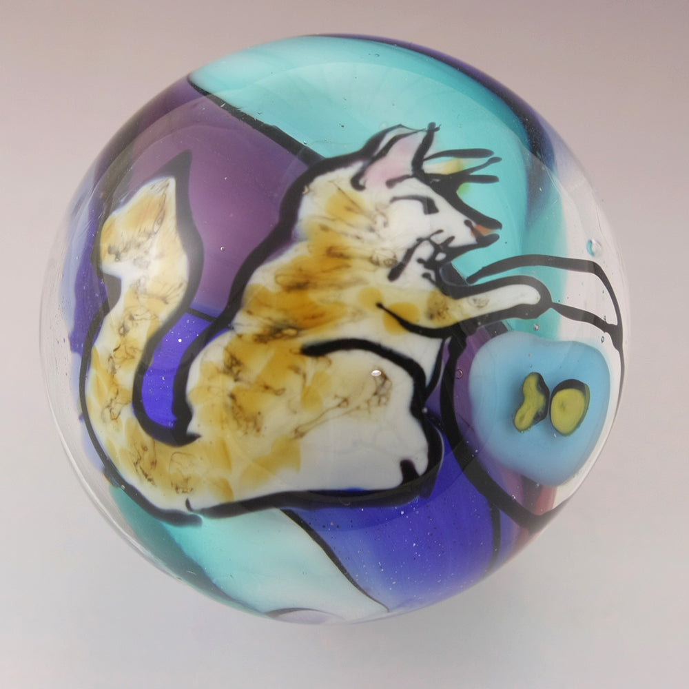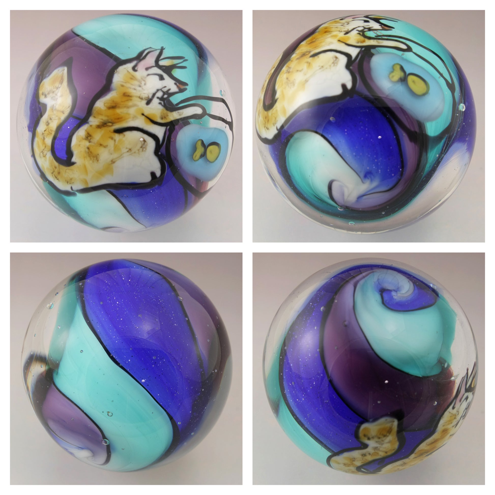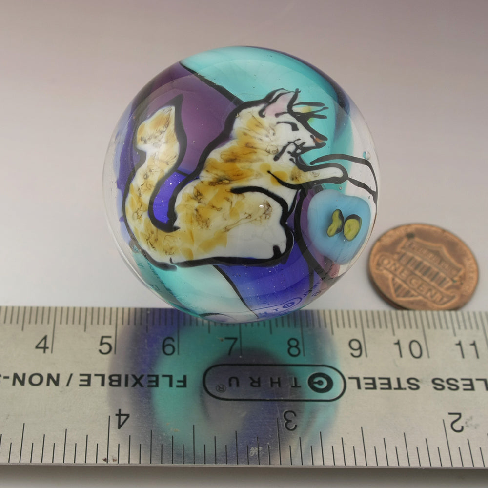 This handmade lampwork marble features a kitty investigating the fish bowl. The kitty has been drawn with glass stringer with a topaz coloring and pink ears. The background is a swirl of bright teal, purple and a sparkling aventurine cobalt blue. This large marble has been heavily encased in clear to magnify