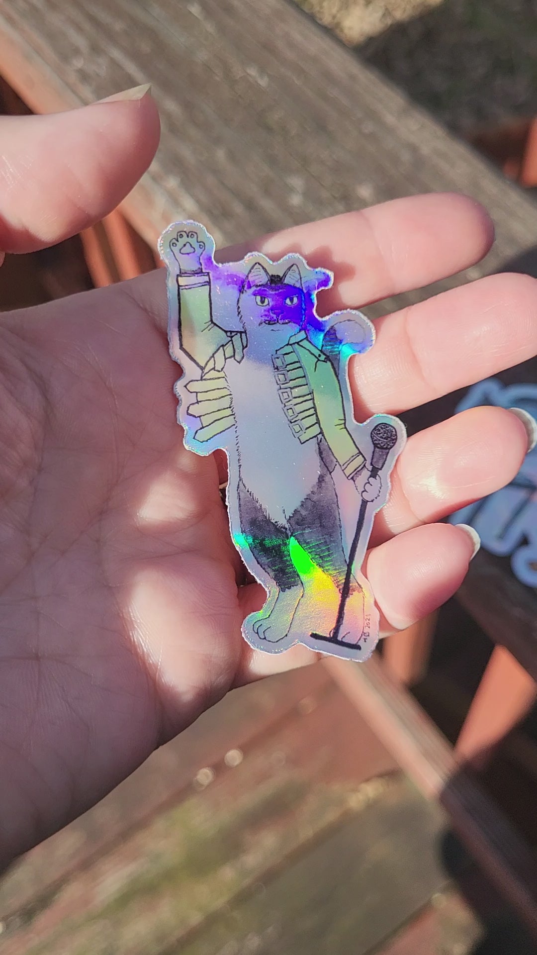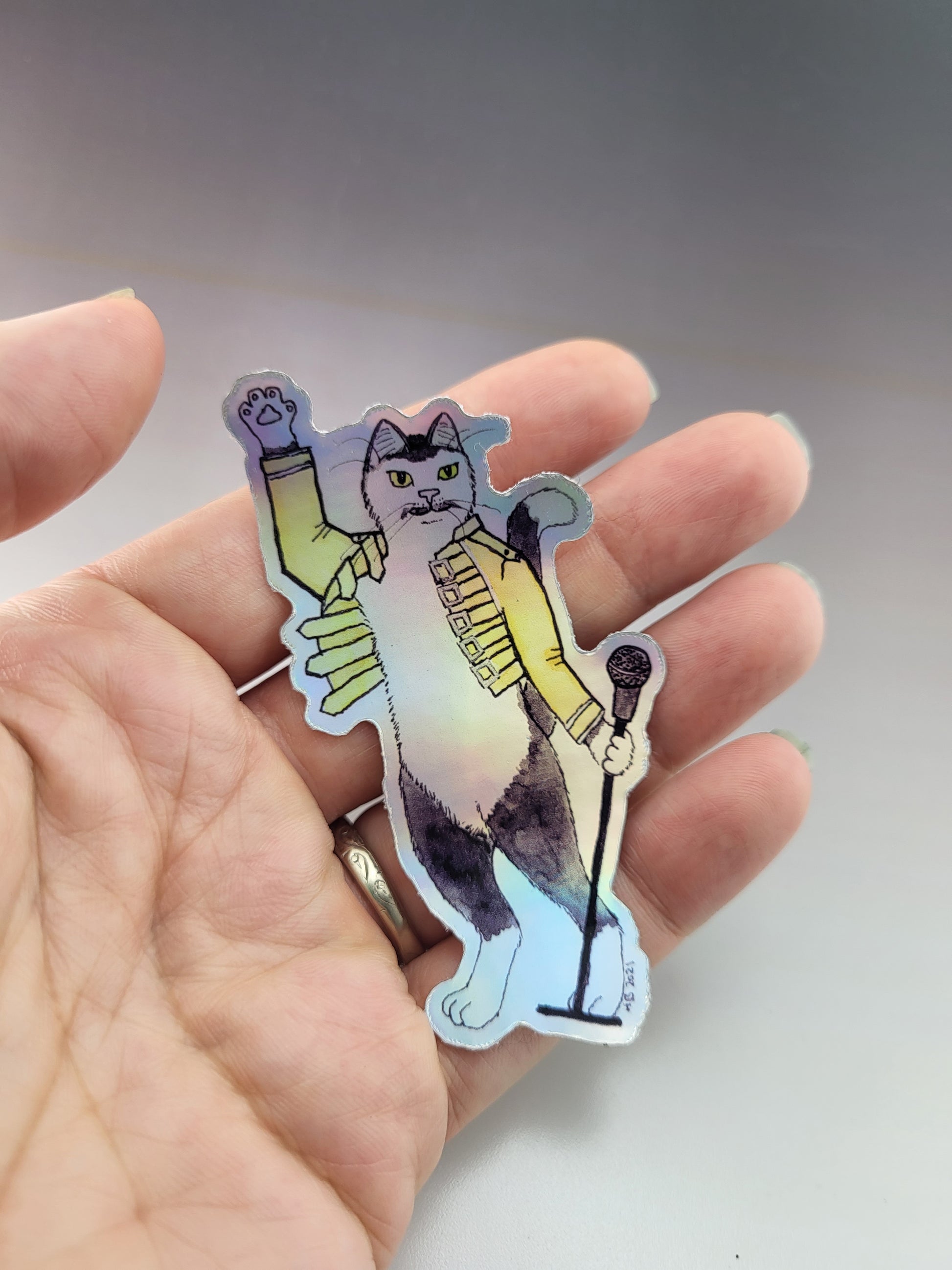 3 inch long holographic waterproof vinyl sticker of Freddie Purrcury in his iconic yellow military jacket. Ships free in an envelope with a postage stamp