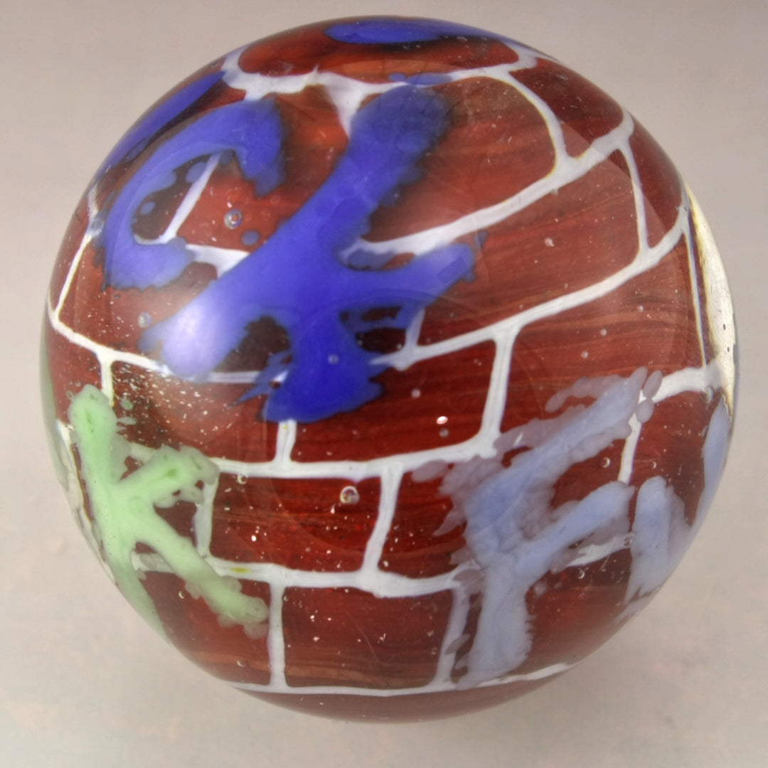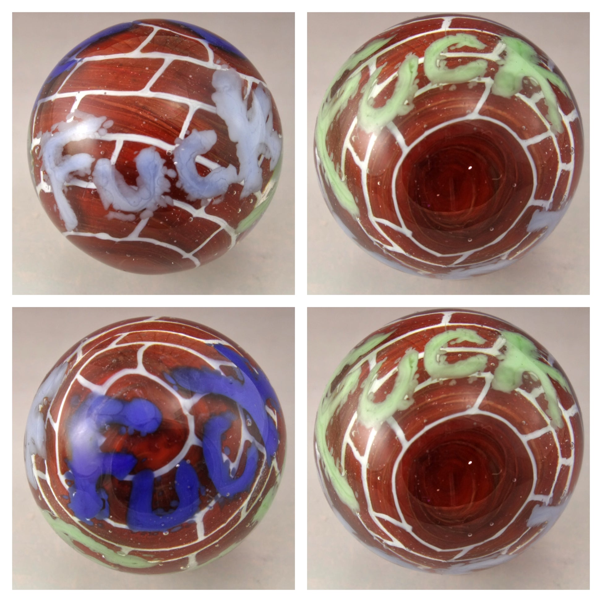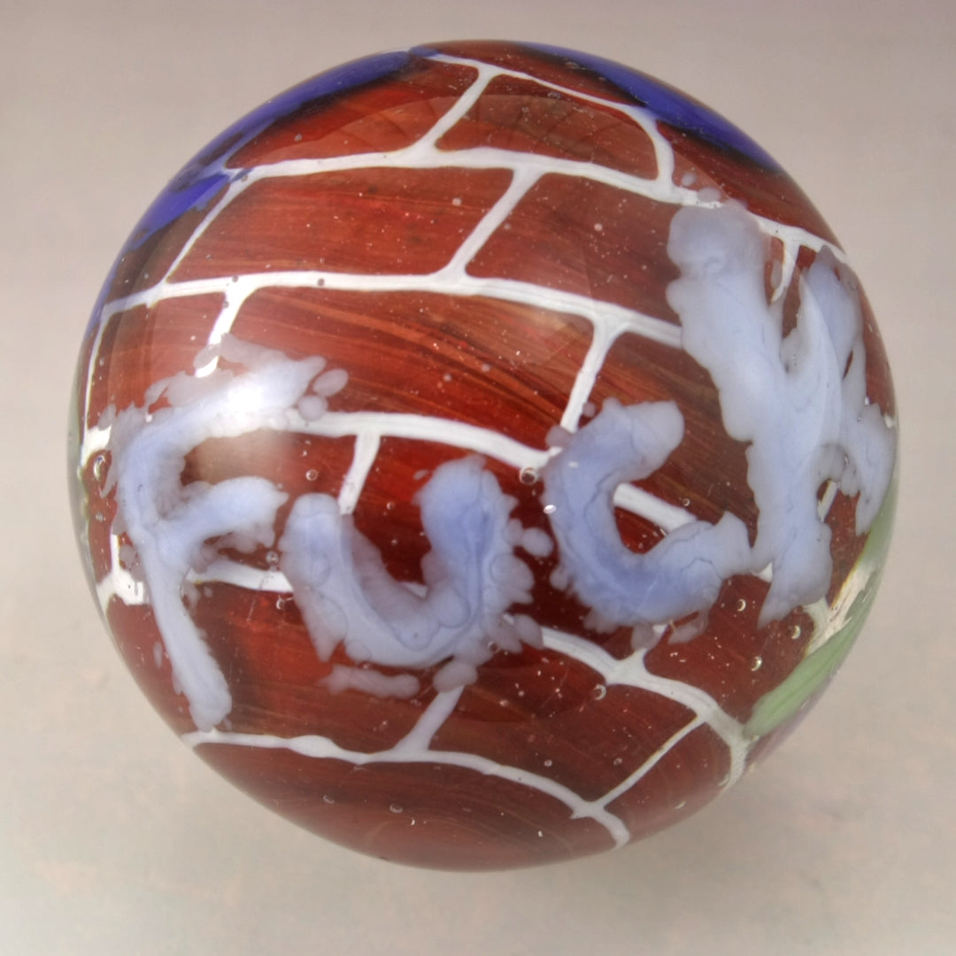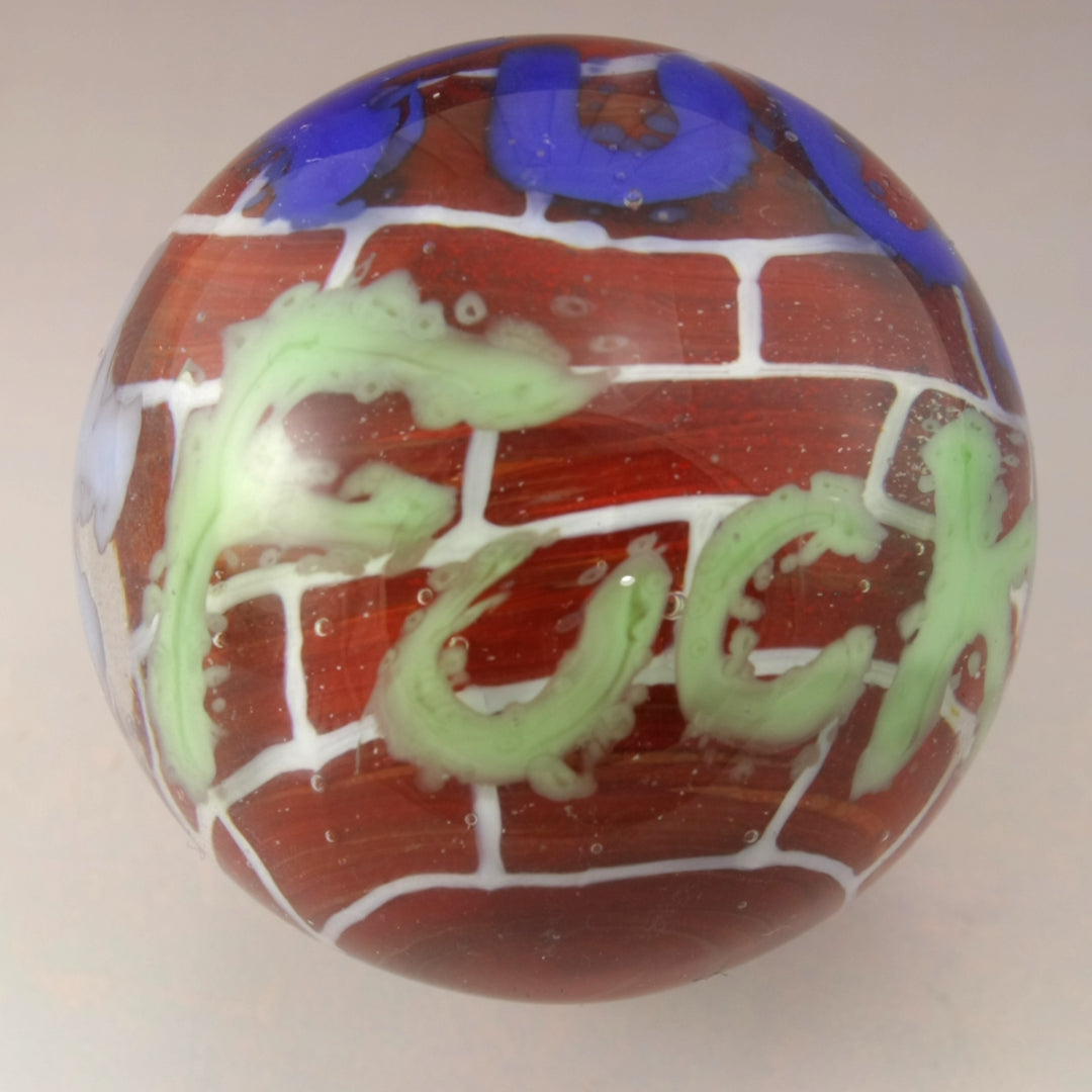 This handmade lampwork glass bead is made from sienna with swirls of variations of reds and browns to simulate bricks. I've applied white stringer in a brick pattern and encased in clear. I used thick lines of stringer to imitate a spray can font with the word "Fuck" three times in green, blue and purple before encasing in another layer of clear