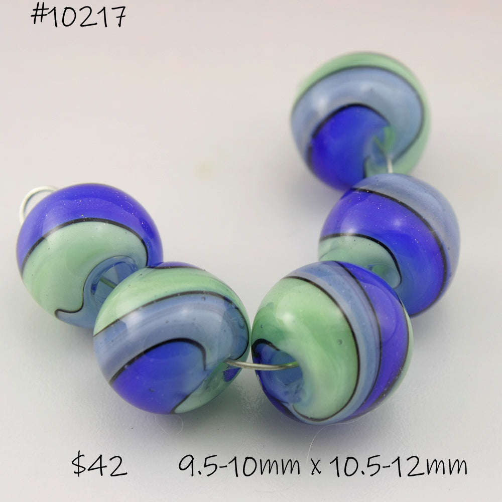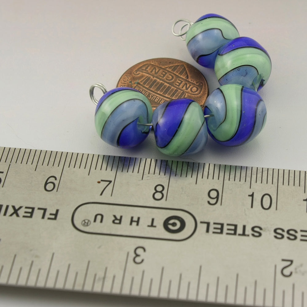 Handmade pale emerald green, periwinkle and blue with black twistie rounds. These have a subtle sparkle overlay of diluted goldstone