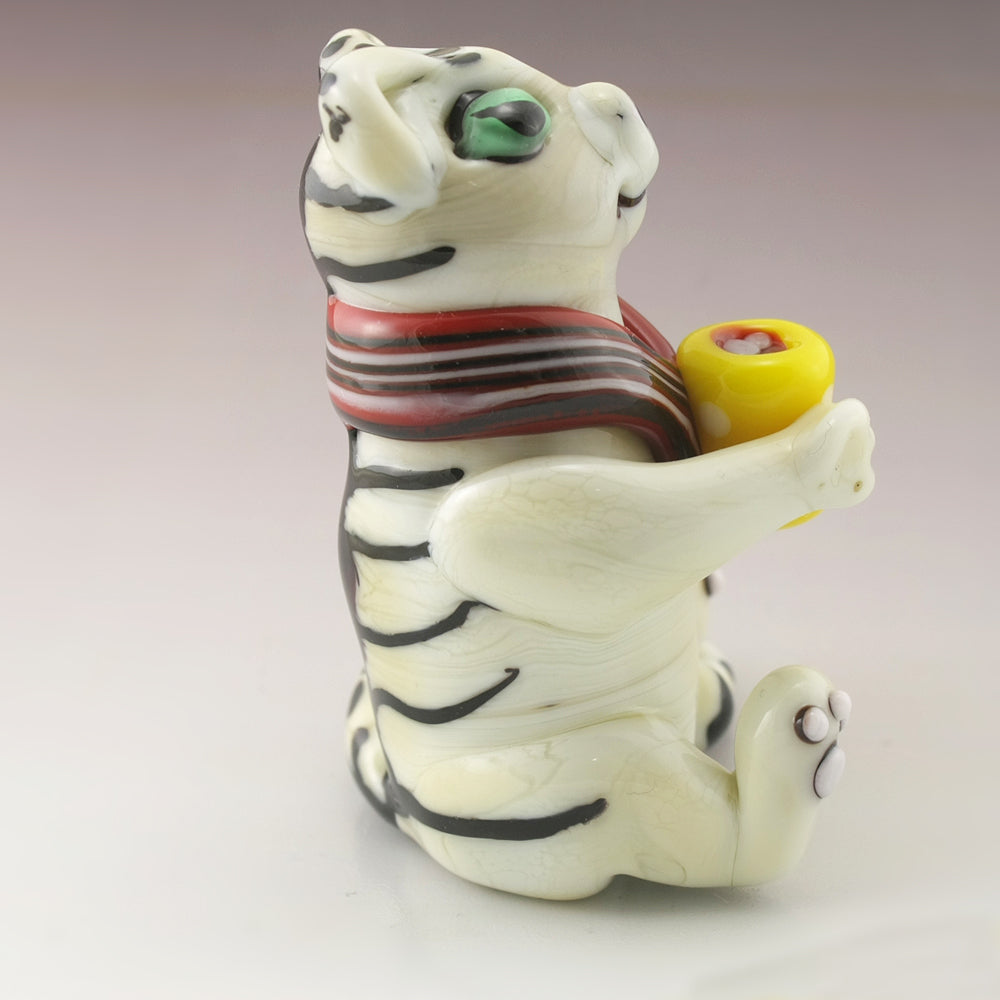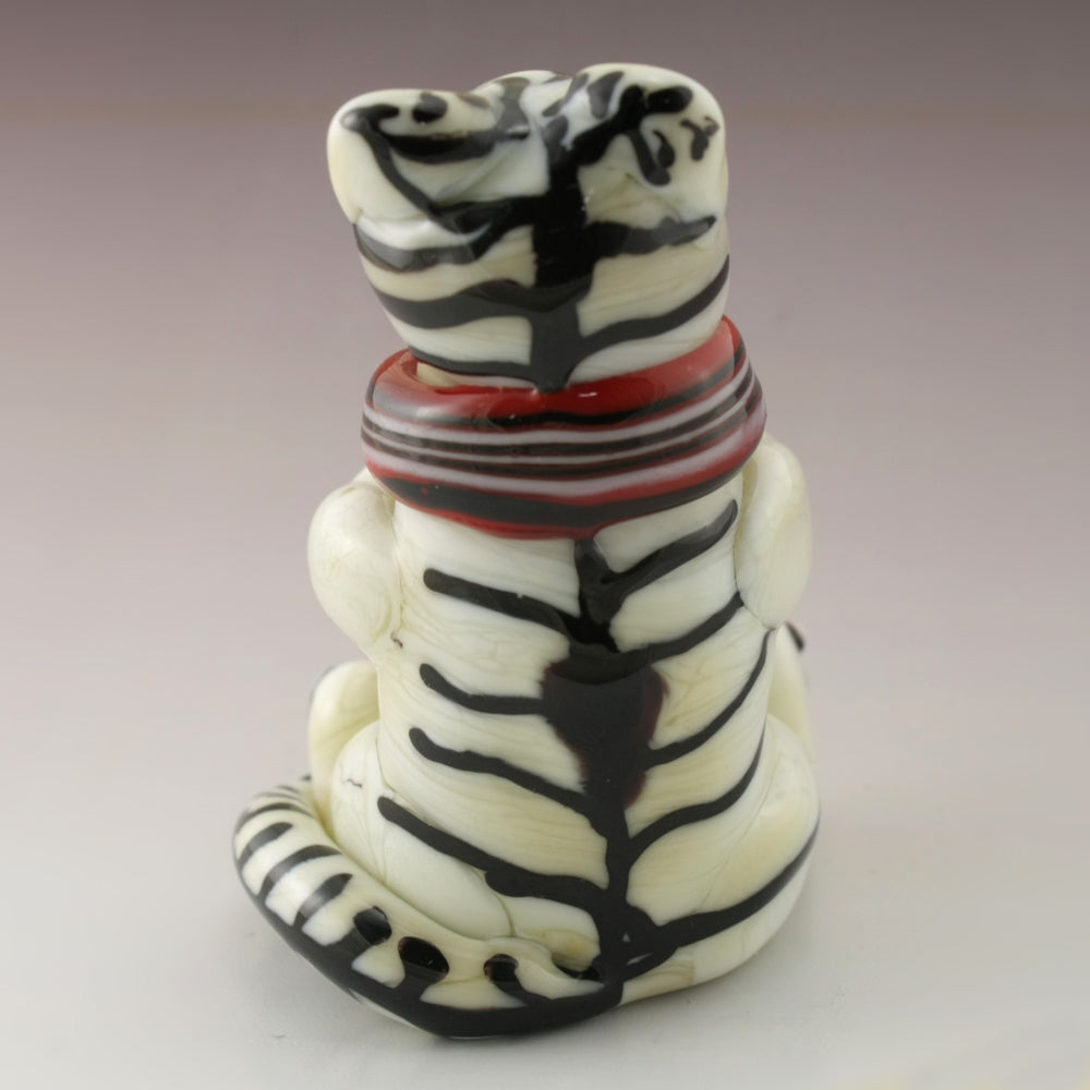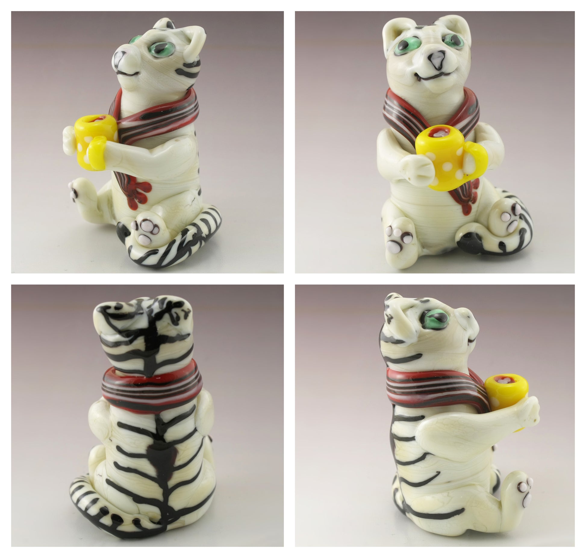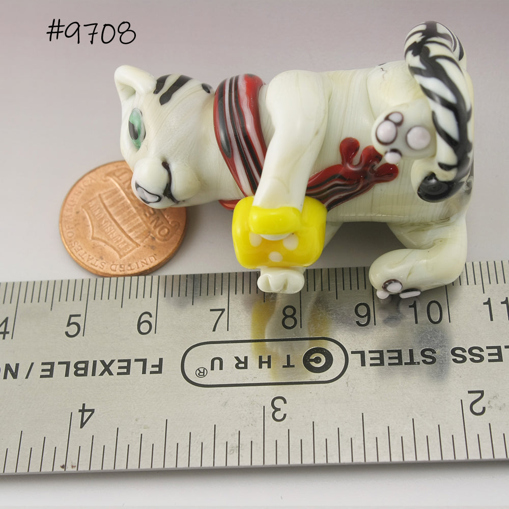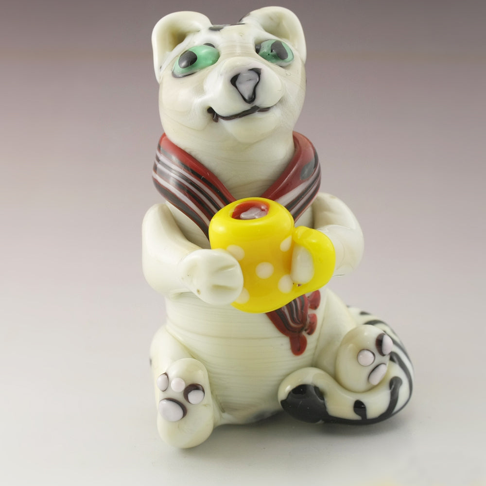 This adorable lampwork glass kitty sculpture is made with ivory glass with black stripes. He is holding a yellow polka dotted mug with brown cocoa and a few dots of marshmellows. He has a red, black and white striped scarf with tassels around his neck so he can stay cozy. He has green eyes, a pink nose and pink toebeans.