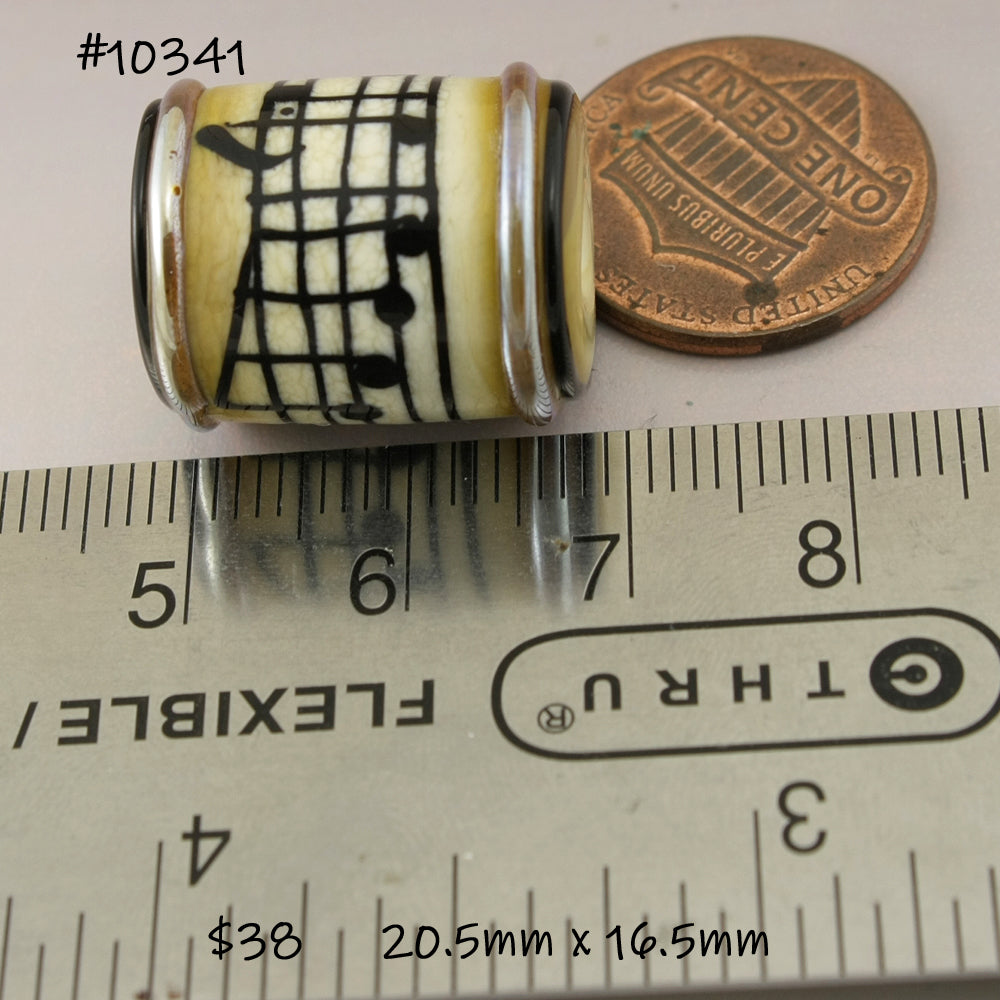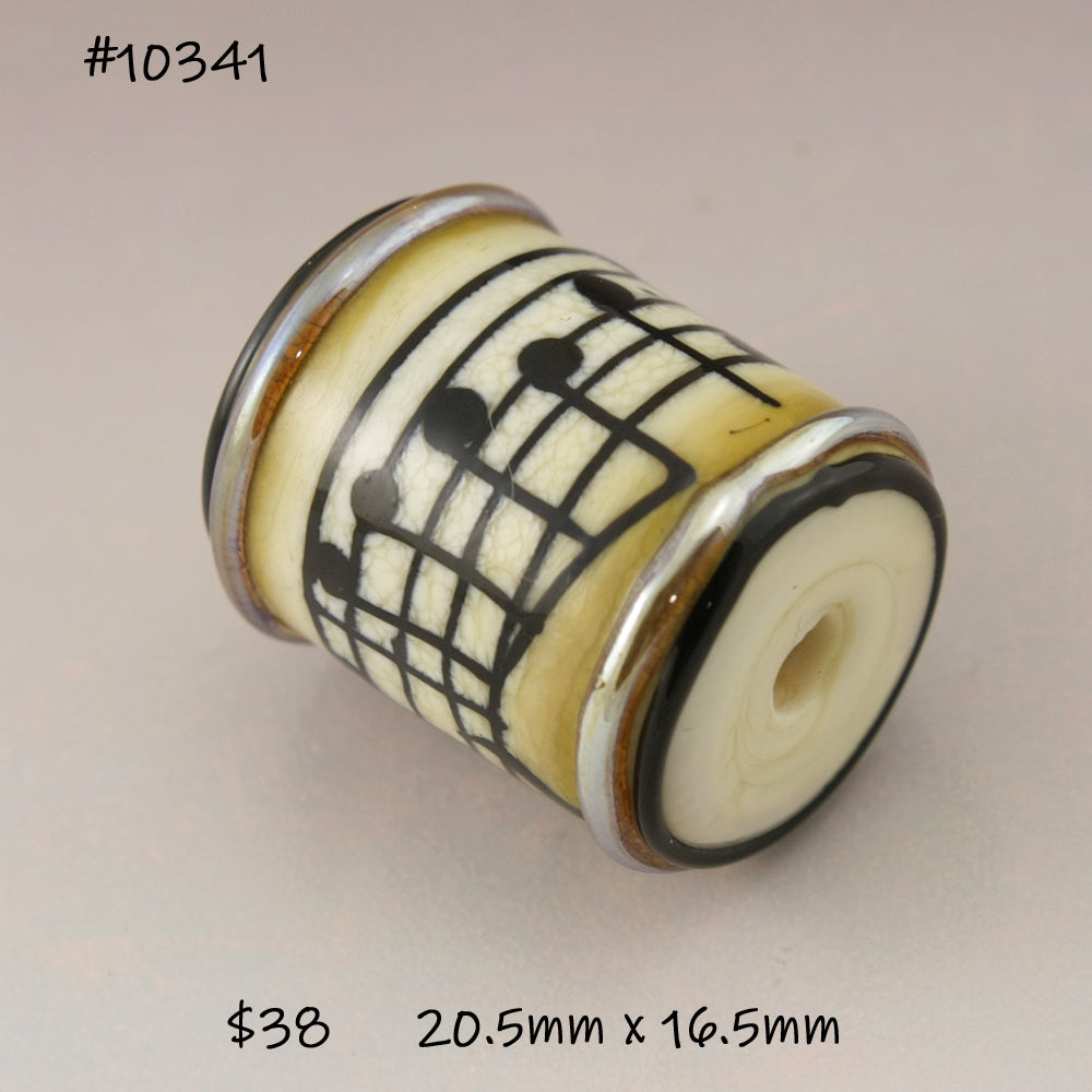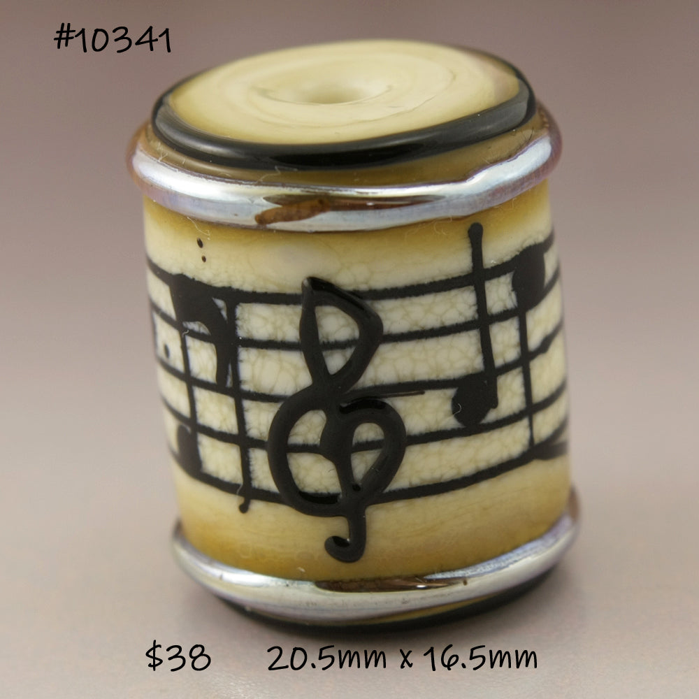 Ivory glass cylinder bead with black manuscript and music notes drawn in hairthin glass stringer. The edges are embellished with a raised line of metallic and black. The treble clef has been left slightly raised.