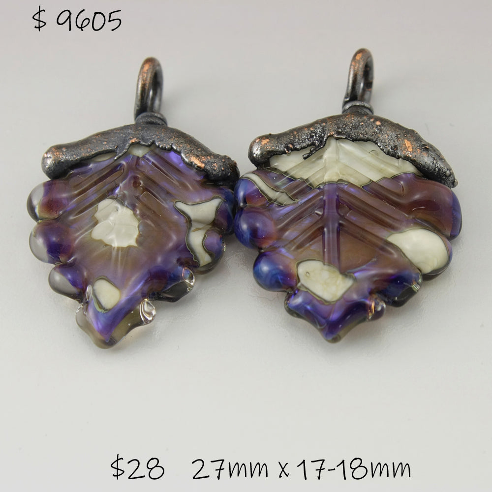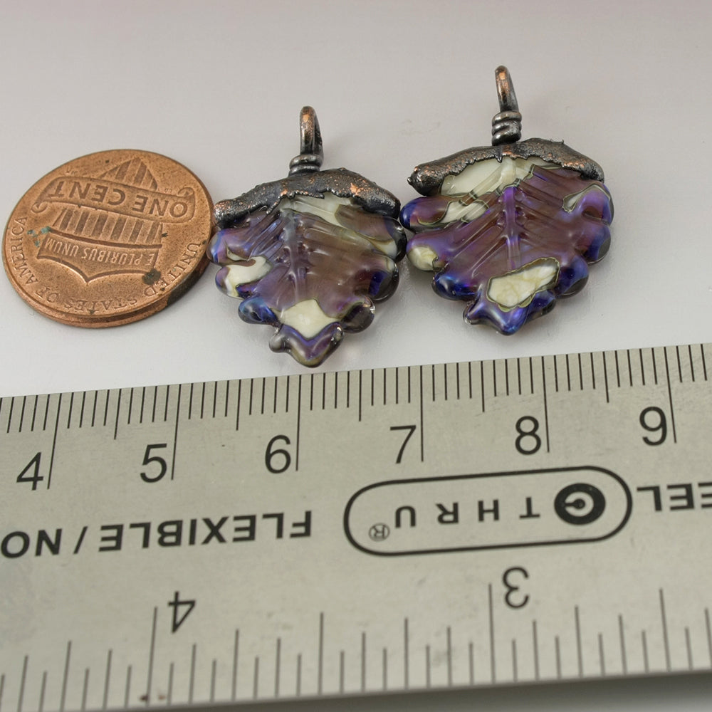 Handmade Ivory and Purple blue Lampwork Glass Leaves with Raku Frit with Copper Electroforming Oxidized pair