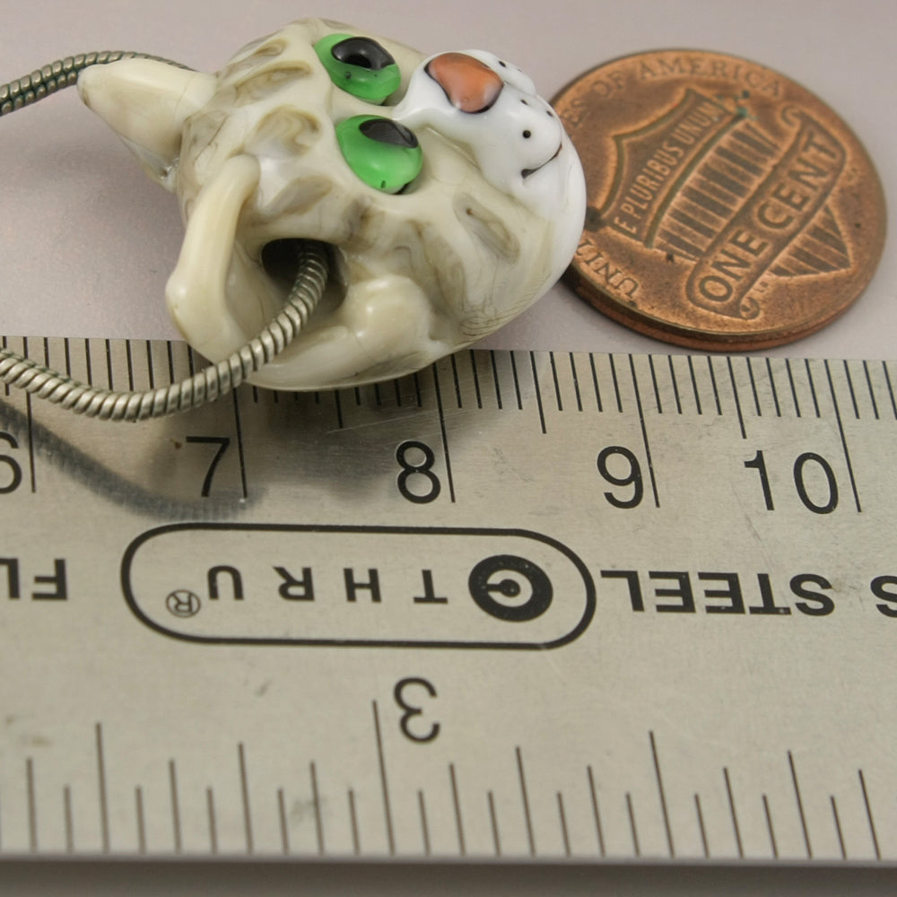 Kitty Pendant/Bead in Beige and White. This kitty has green eyes and a coral nose. The hole is horizontal at about the eye level in front of the ears. The hole is aprox 3mm wide. It should be able to fit on many of the small chains and neck wires available, but it does not include one
