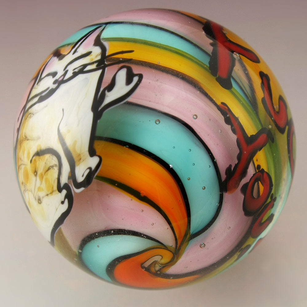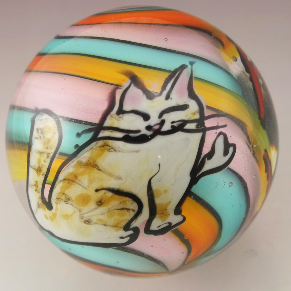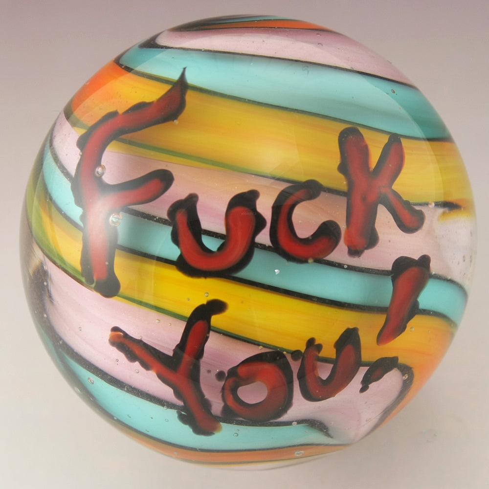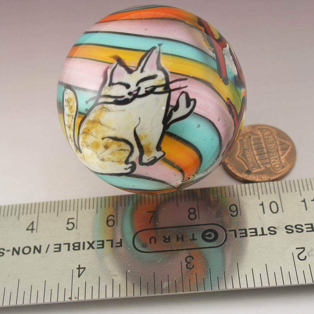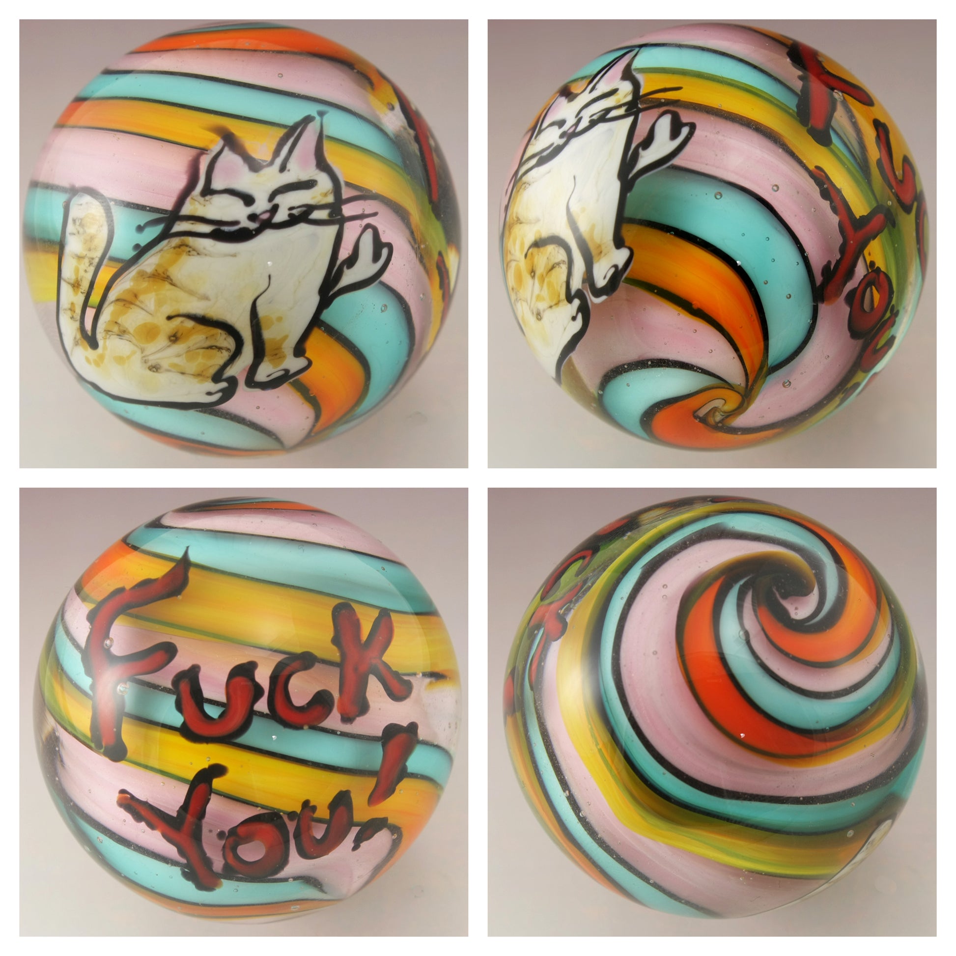 This handmade marble features a Kitty that has been drawn with soft glass stringer flipping the bird. If you continue rotating the marble, kitty is saying "Fuck you" in a graffiti font in red. He is on a background of subtly sparkling light pink, aqua blue, and light orange. This large marble has been heavily encased in clear to magnify