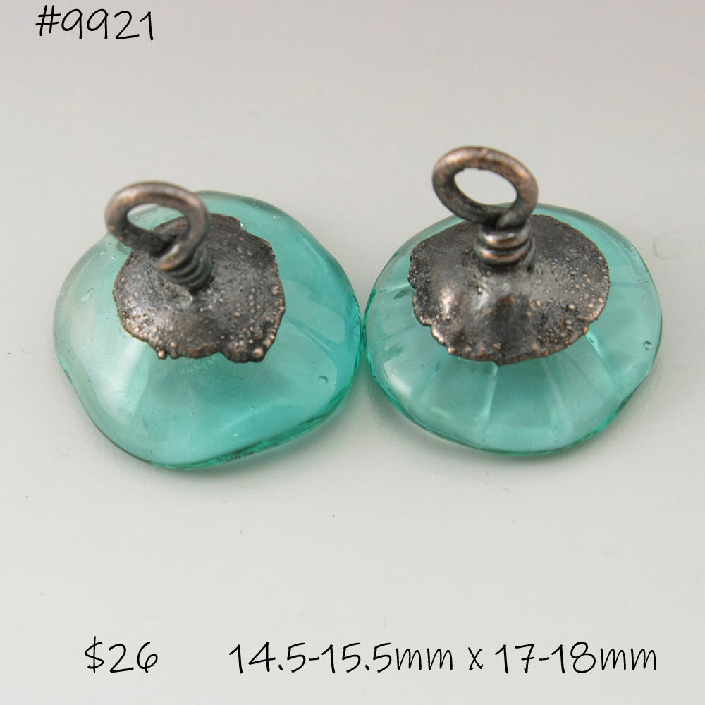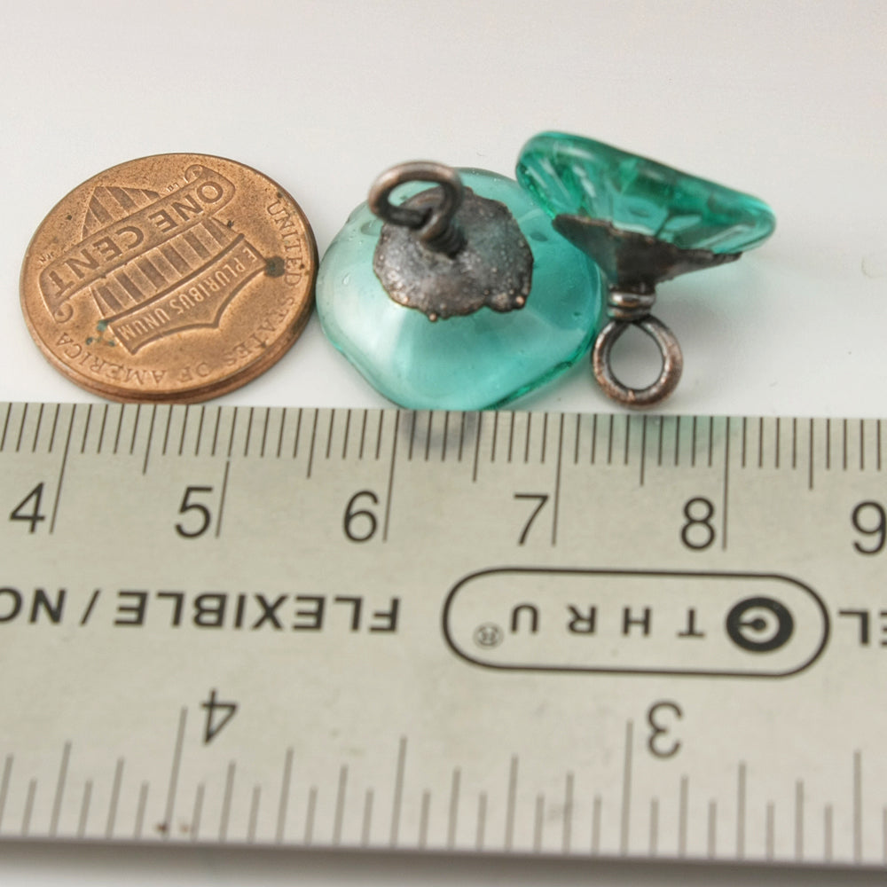 Handmade pale emerald green with teal lampwork Glass bellflowers with Copper Electroforming Oxidized pair