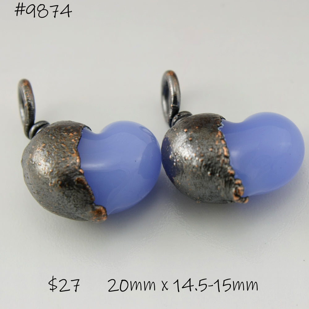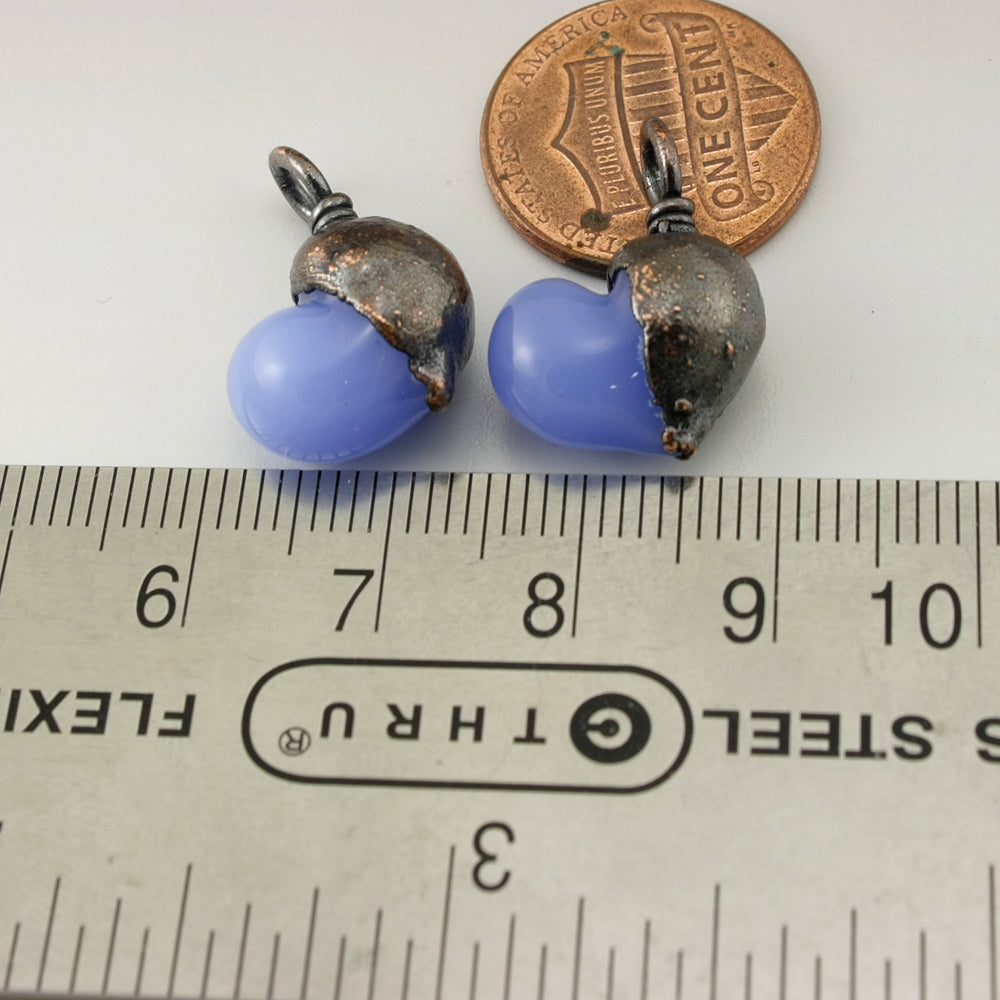 Handmade milky blue Lampwork Glass hearts with Copper Electroforming Oxidized pair