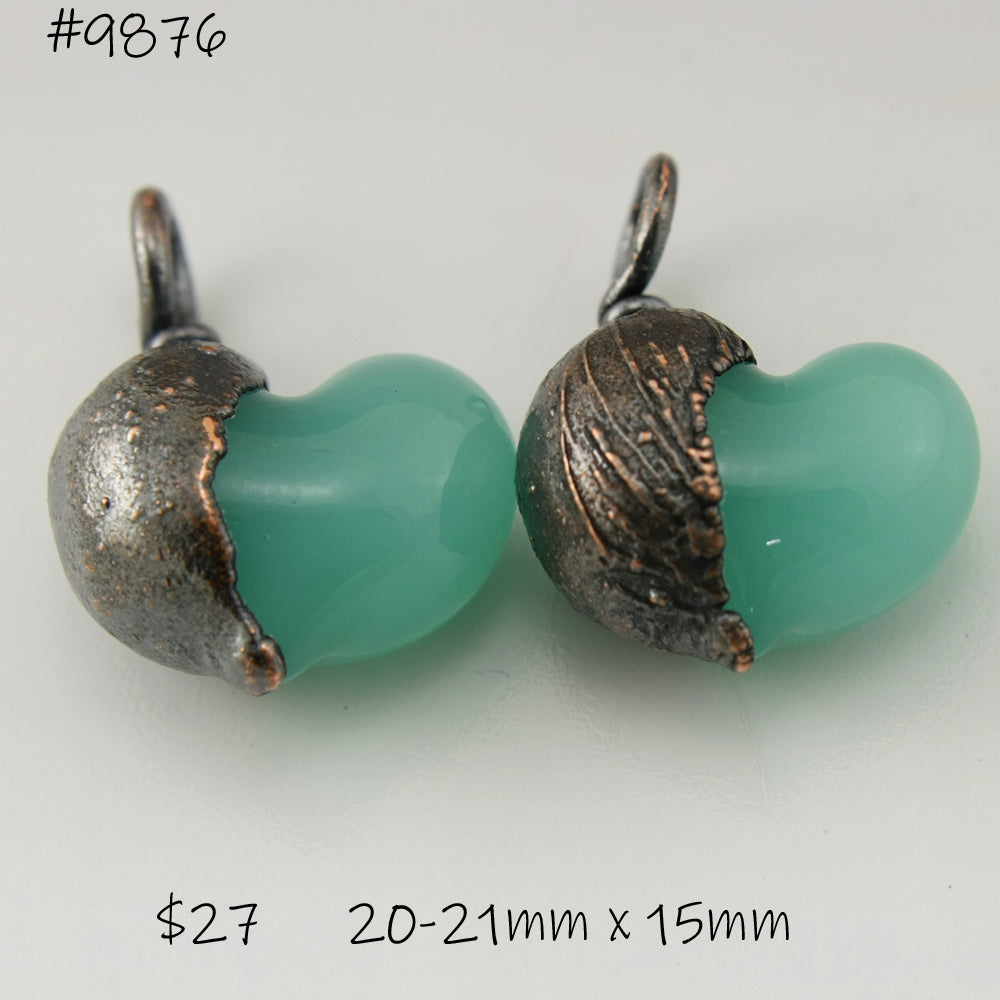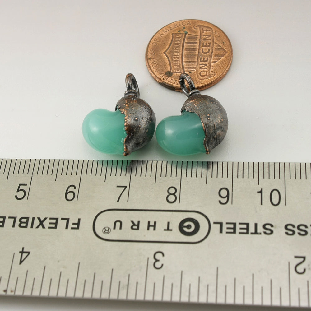 Handmade milky jade green over white Lampwork Glass hearts with Copper Electroforming Oxidized pair