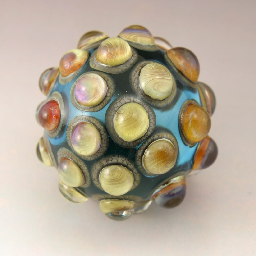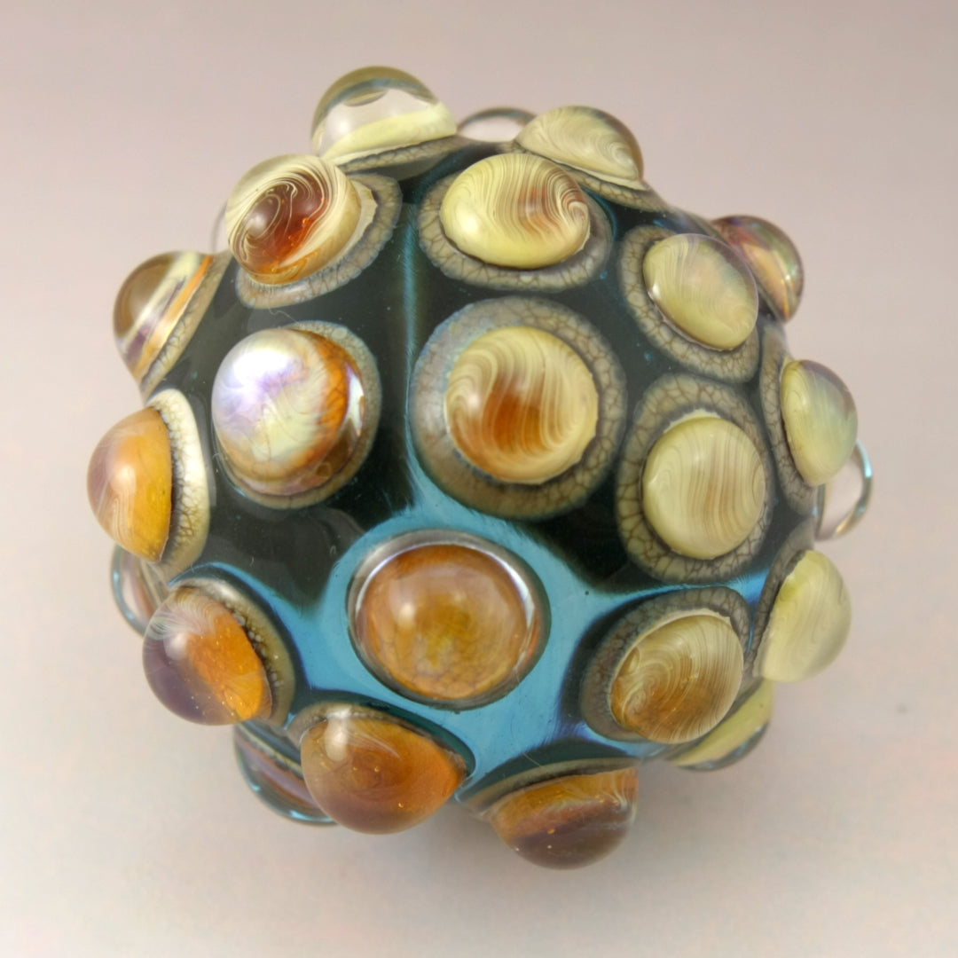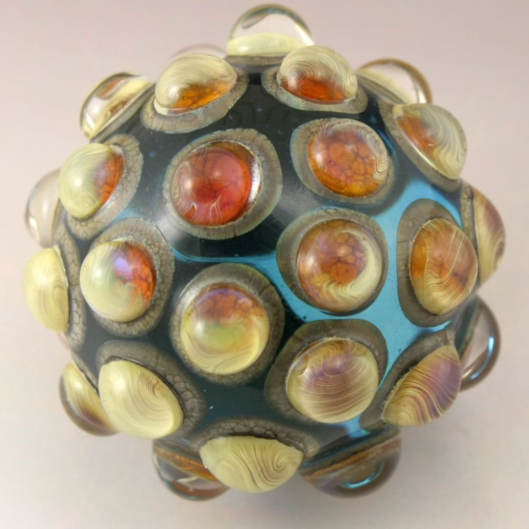 This handmade lampwork glass bead is made from a transparent teal base with raised bumpy dots. The dots have a base of aged silvered ivory with peachy with pale green swirls luster encased in a large dot of clear. This marble has been slightly discounted because there is more variation in the dot color than I would like