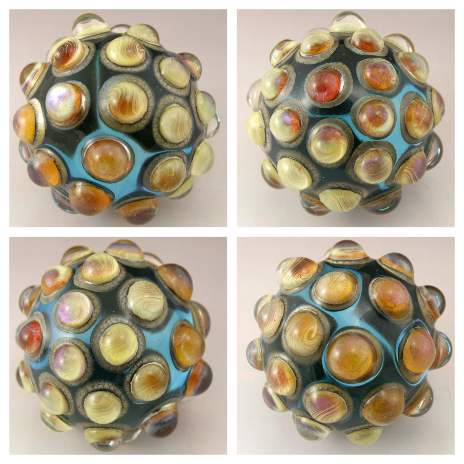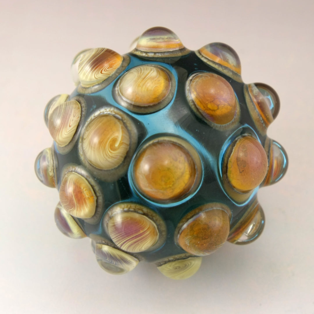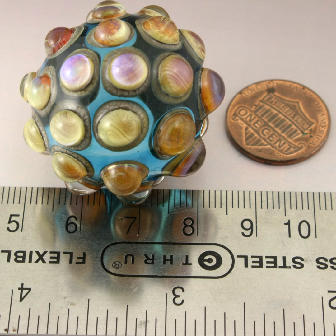 This handmade lampwork glass bead is made from a transparent teal base with raised bumpy dots. The dots have a base of aged silvered ivory with peachy with pale green swirls luster encased in a large dot of clear. This marble has been slightly discounted because there is more variation in the dot color than I would like