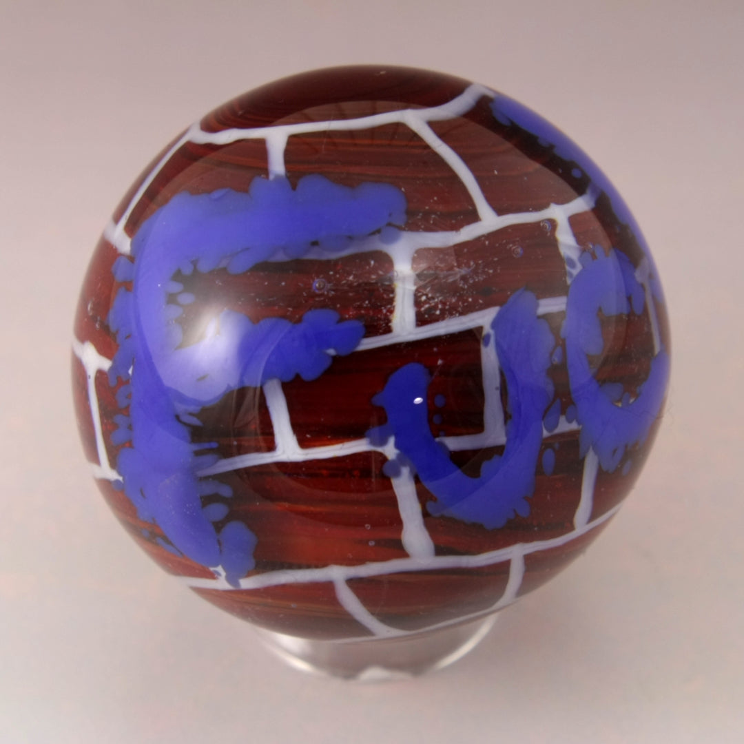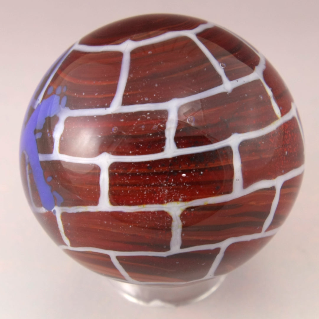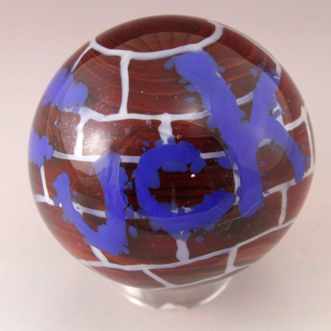 This handmade lampwork glass bead is made from sienna with swirls of variations of reds and browns to simulate bricks. I added some enamels of white and black to give it a more rough aged brick look. I've applied white stringer in a brick pattern and encased in clear. I used thick lines of stringer to imitate a spray can font with the word "Fuck" in Blue before encasing in another layer of clear