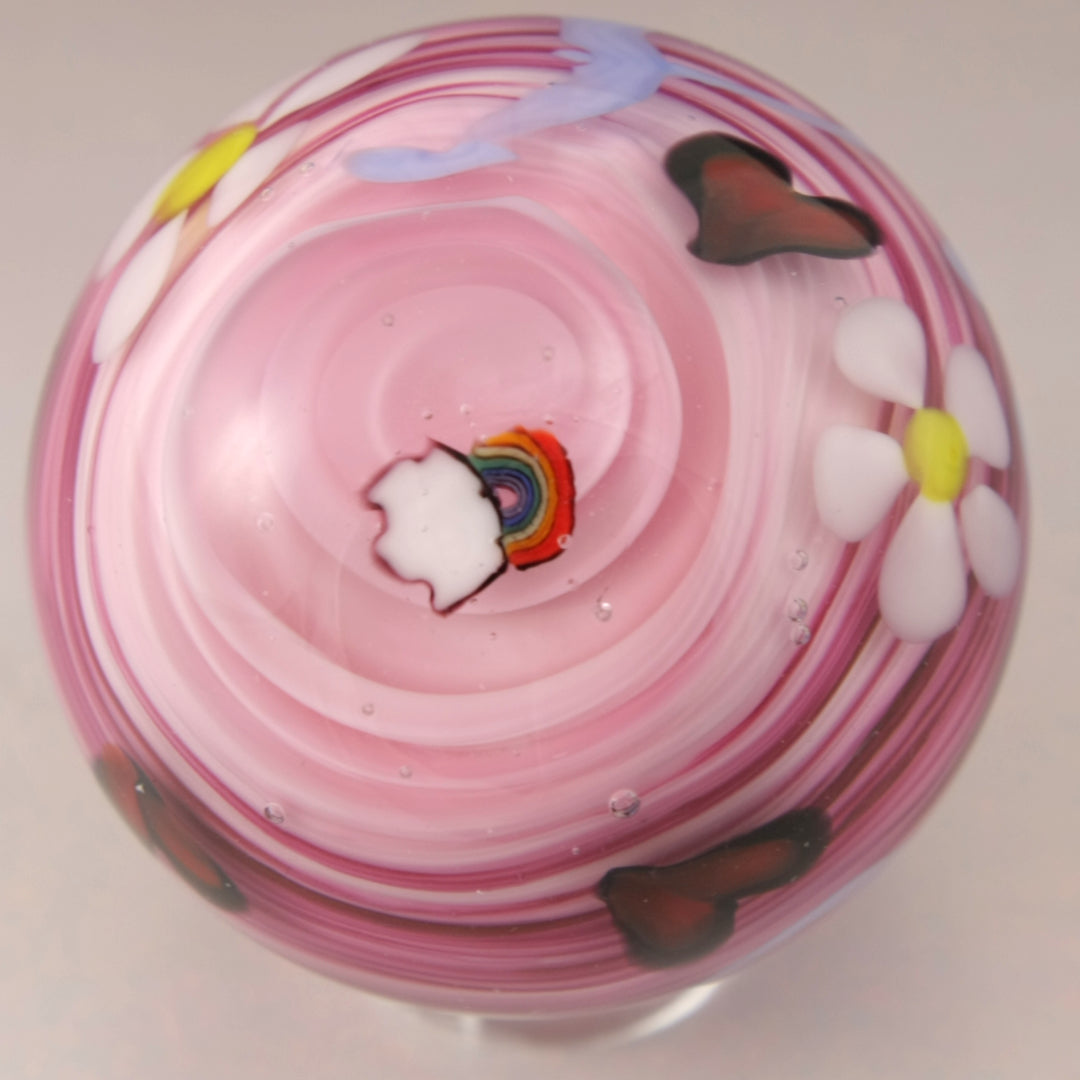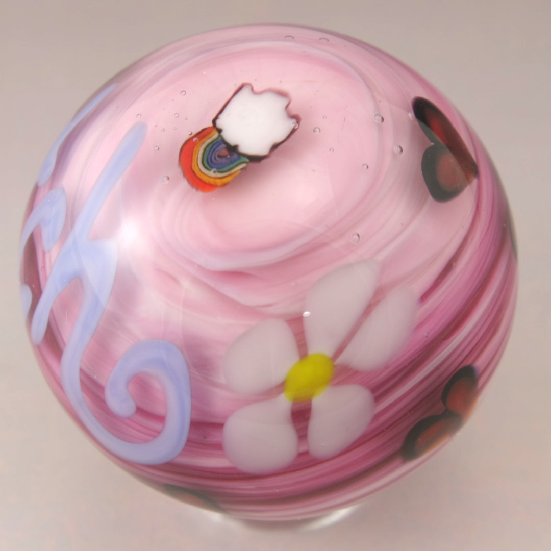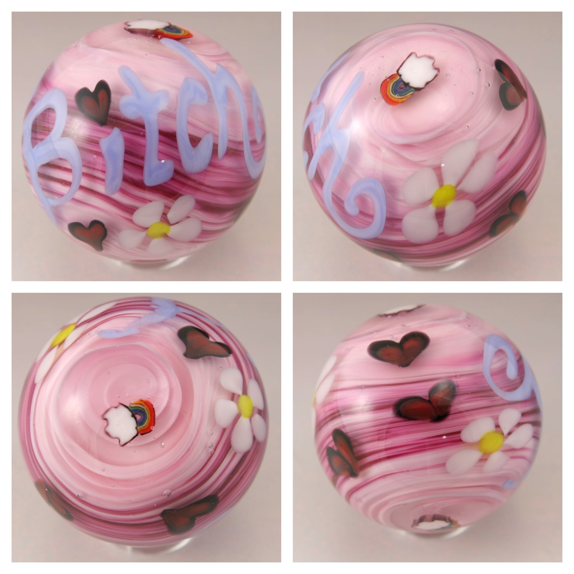 This handmade lampwork glass bead is made from shades of pink glass encased in clear. I've added periwinkle cutesy writing with the word "bitch" for when you are feeling fiesty. I've embellished this marble with a few hearts, some daisy flowers and rainbows.