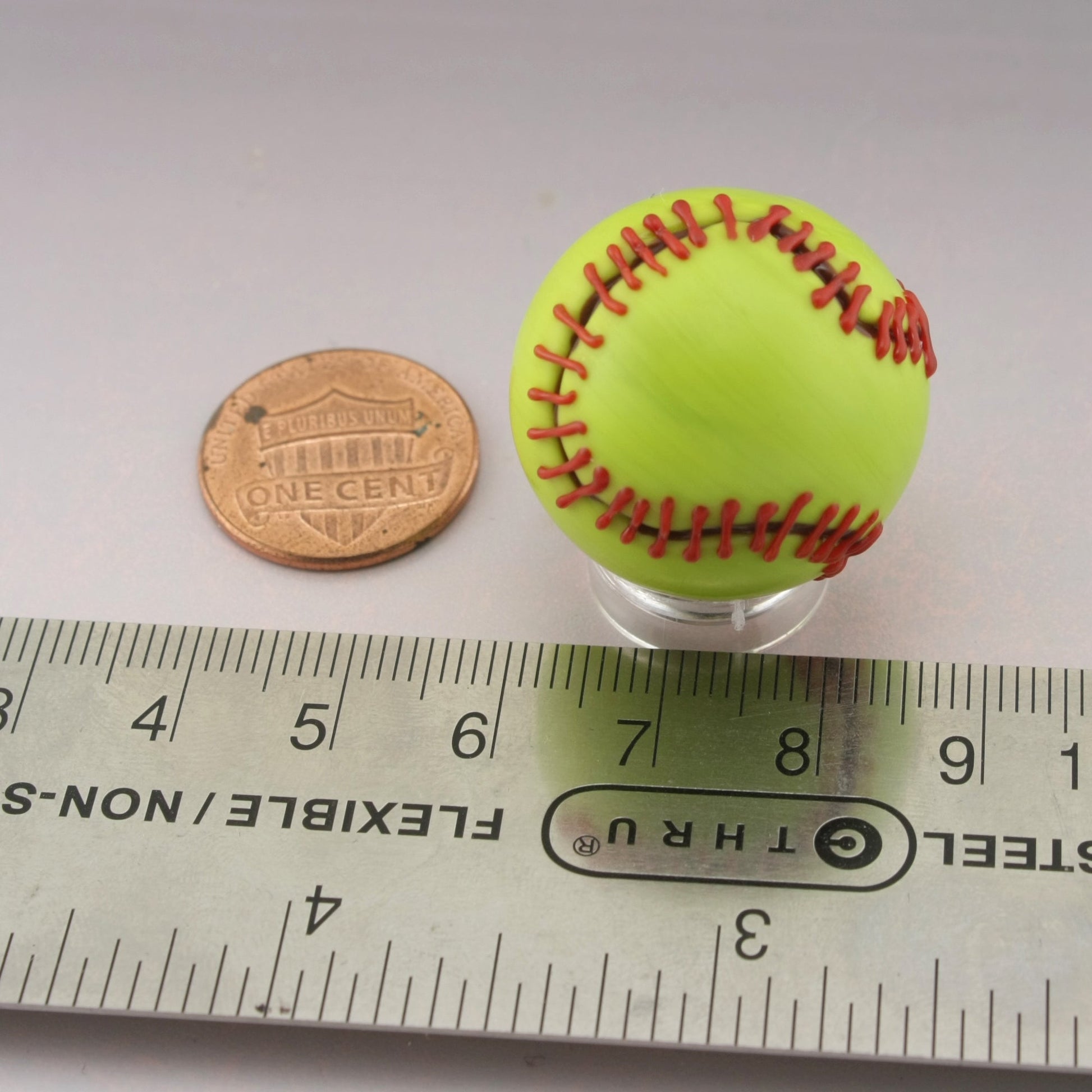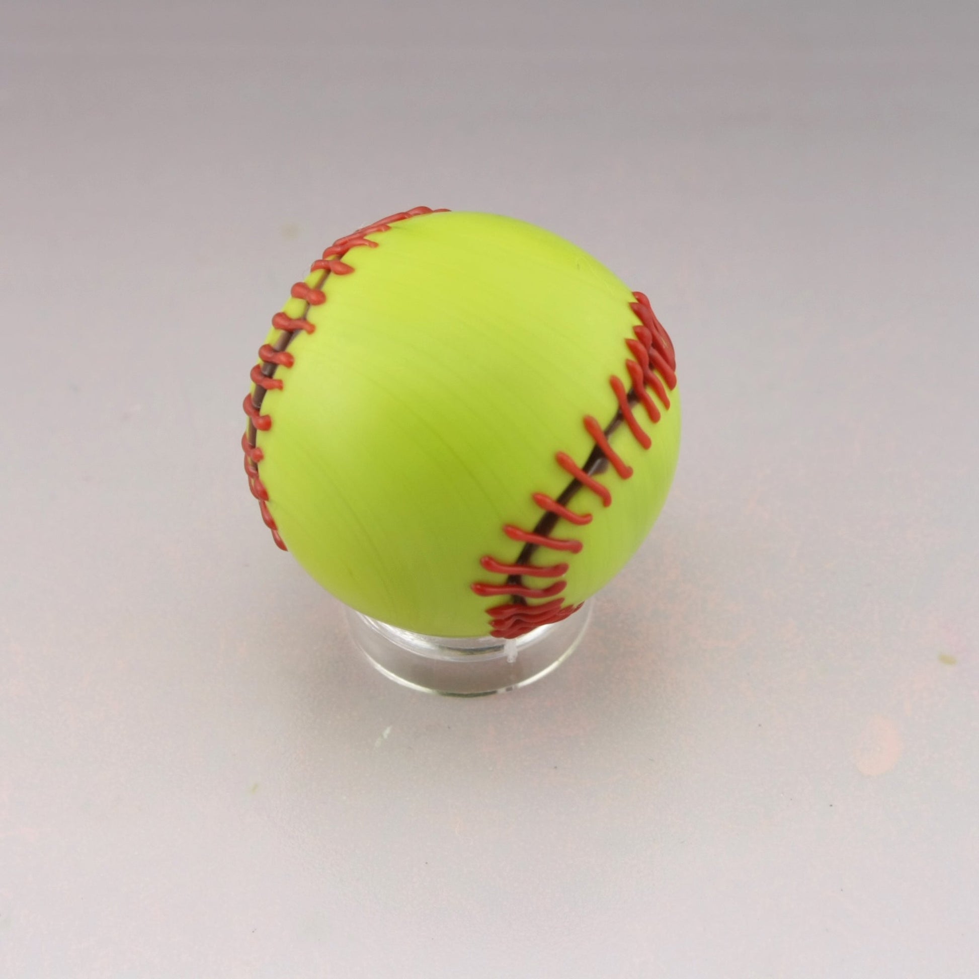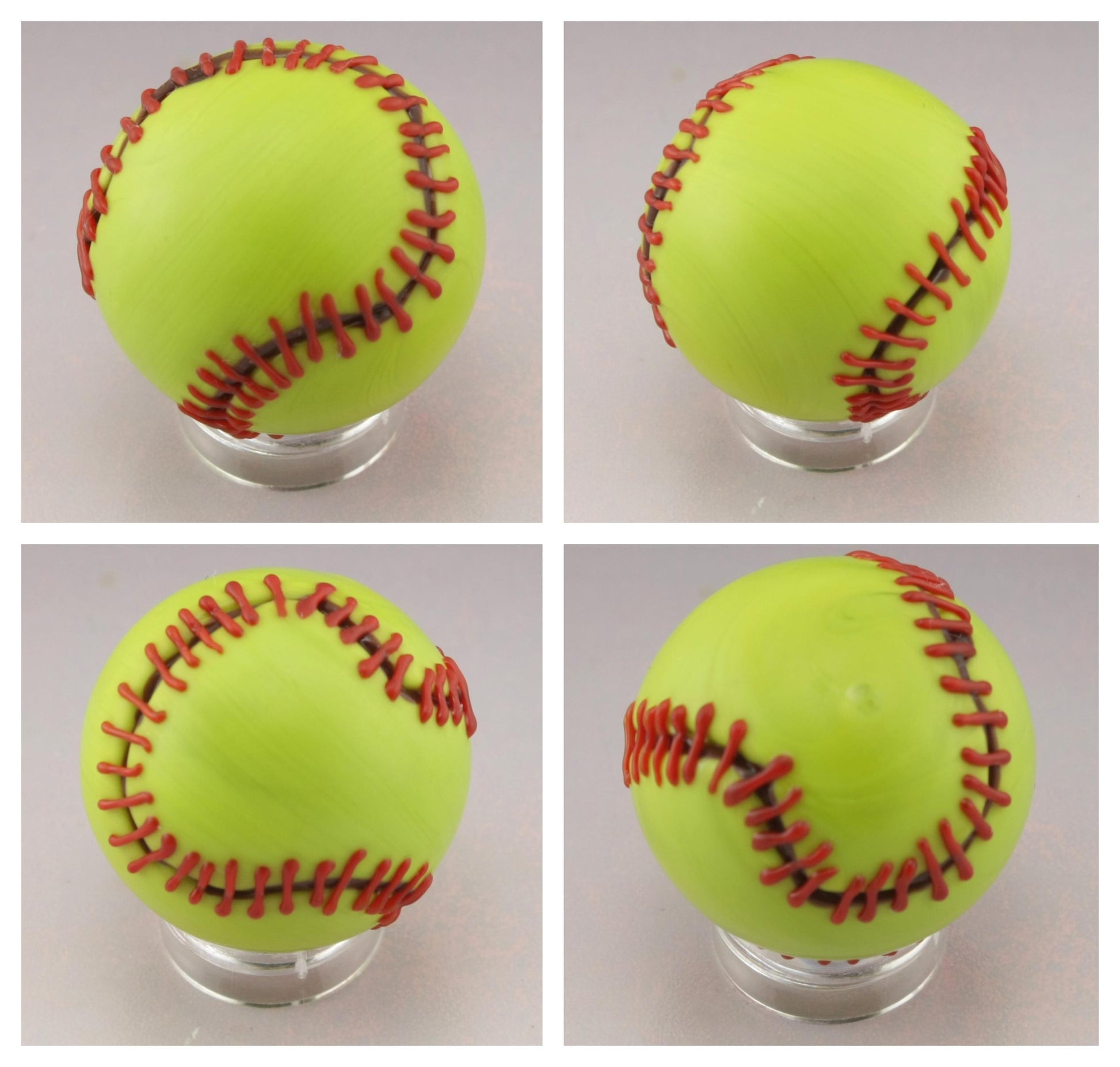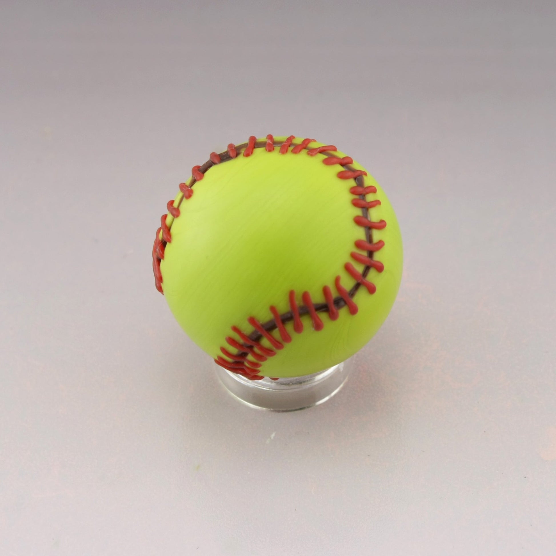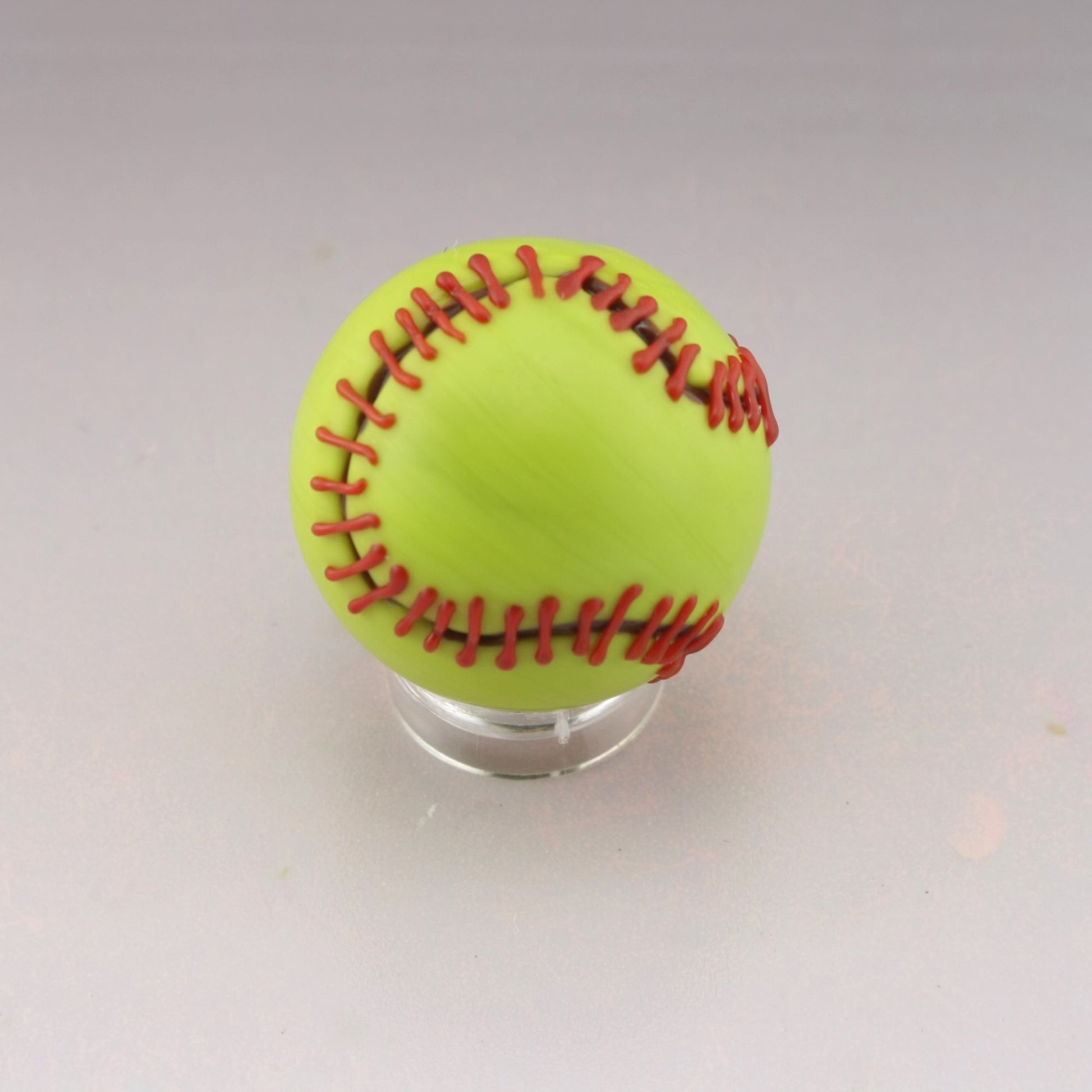 neon green baseball inspired marble with raised red stitching in stringer over a creased texture to represent the seam of the ball. This baseball has been lightly etched to take away some of the shine and add a more leathery authentic texture.