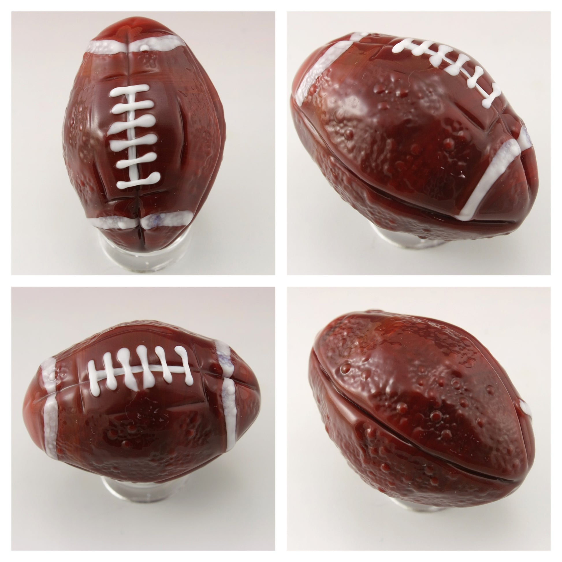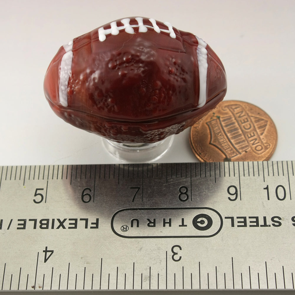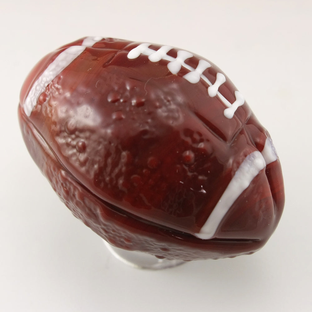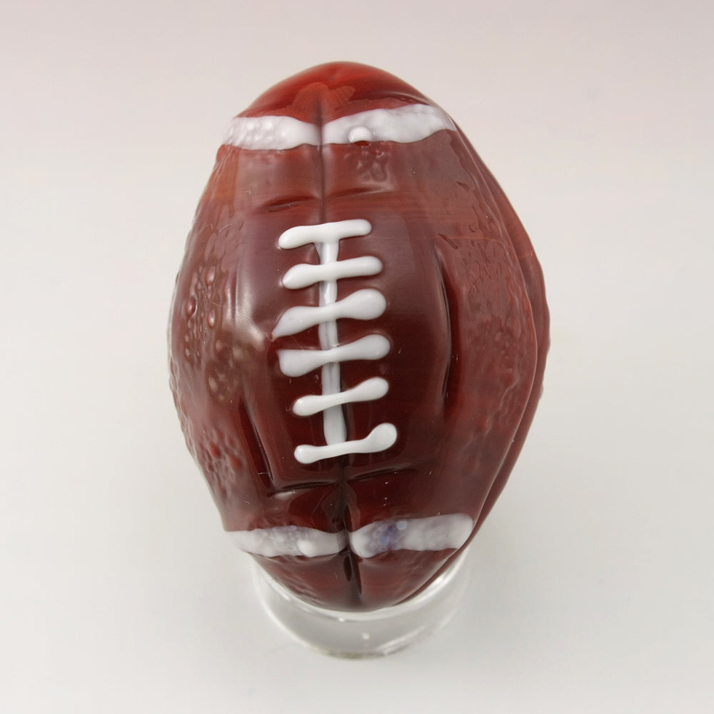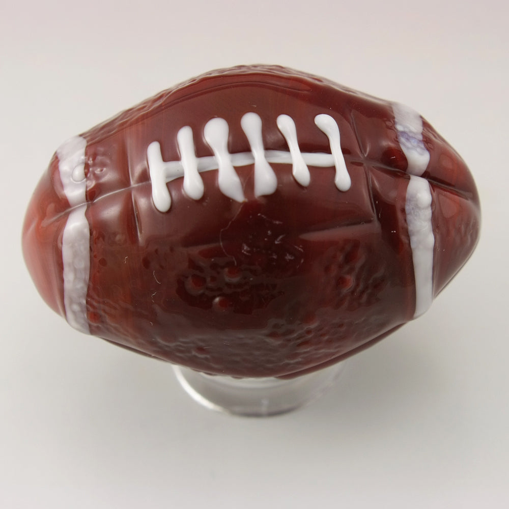 brown football sculpture/oblong marble. The white stitching has been left raised for texture and the piece has been textured to more accurately represent a football.