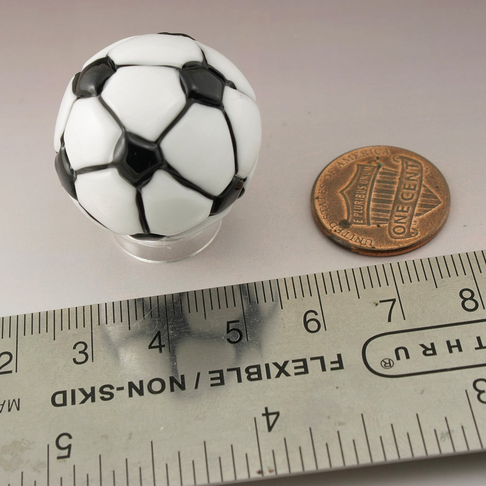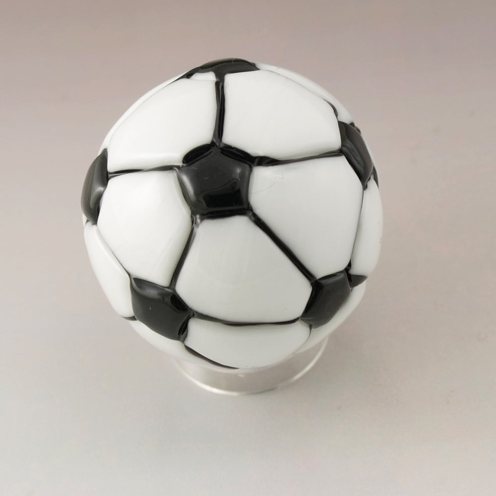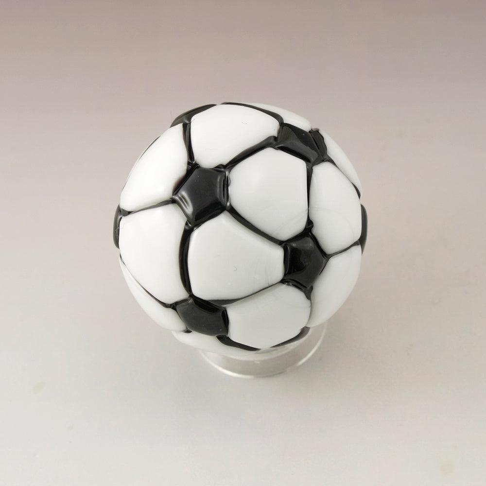 White marble with black pentagons and creases to form white hexagons to represent a soccer ball. Note that this marble isn't perfectly round because it has a lot of texture.
