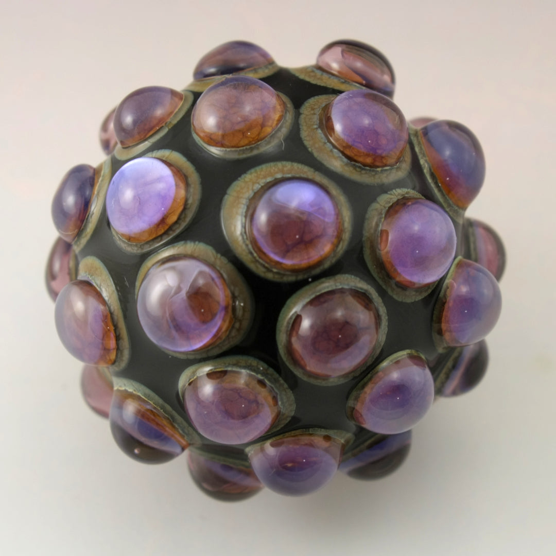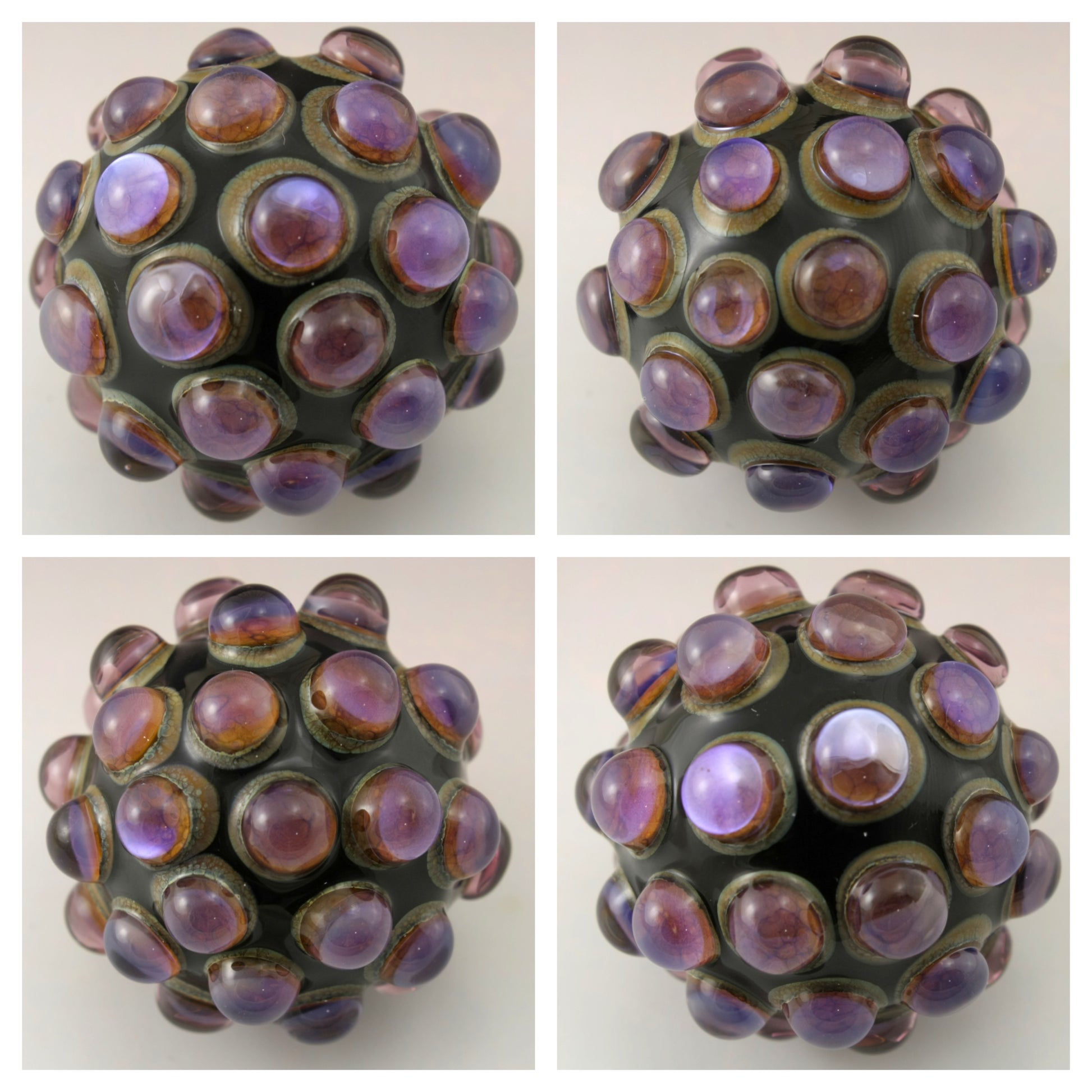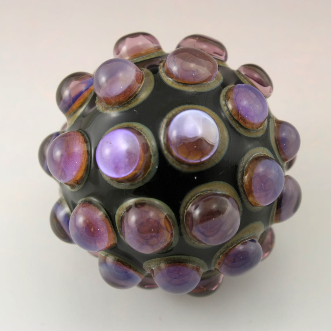 This handmade lampwork glass bead is made from a black base with raised bumpy dots. The dots have a base of aged silvered ivory with pink purple luster encased in a large dot of clear