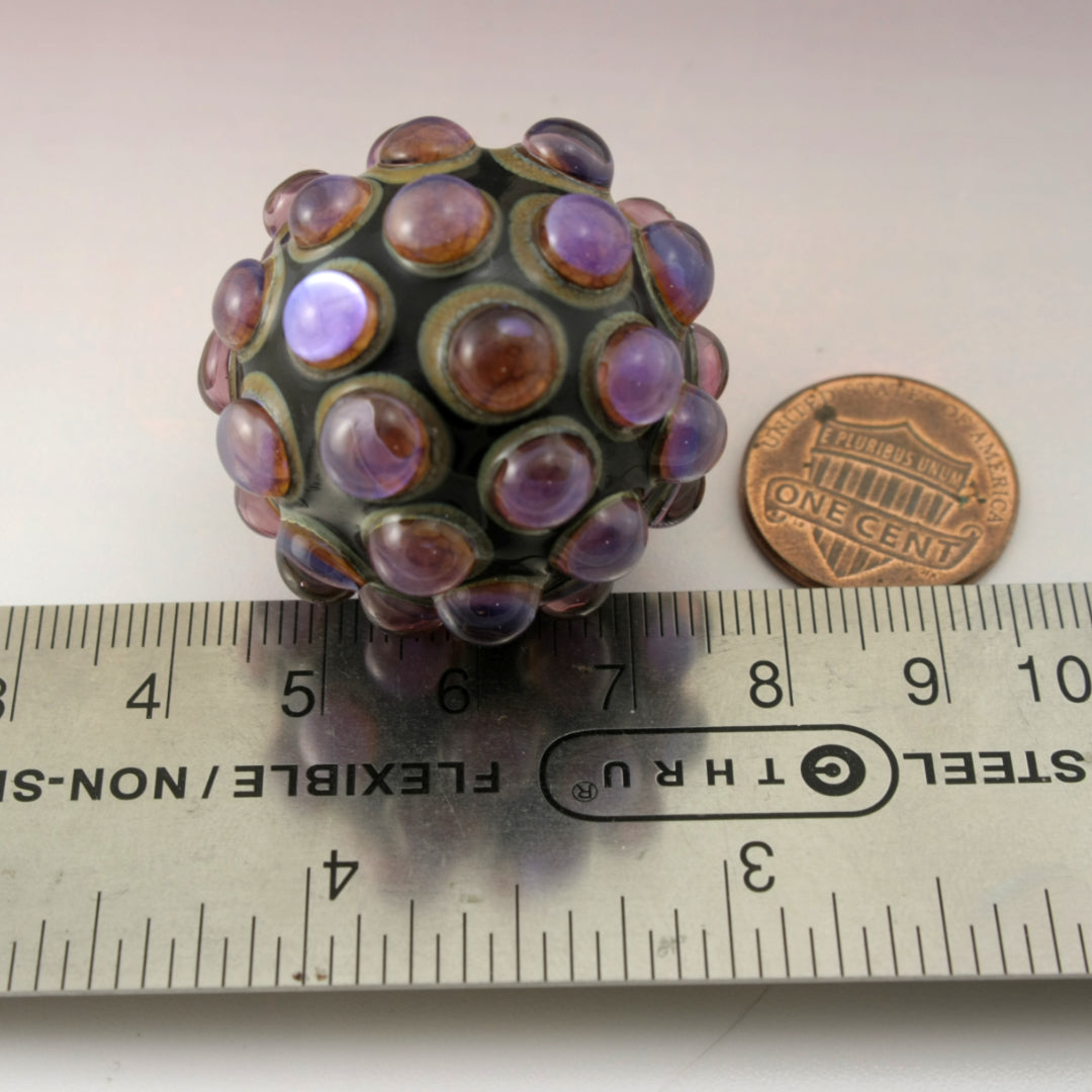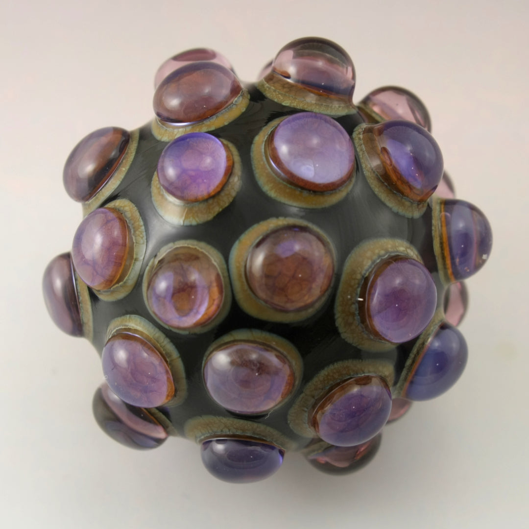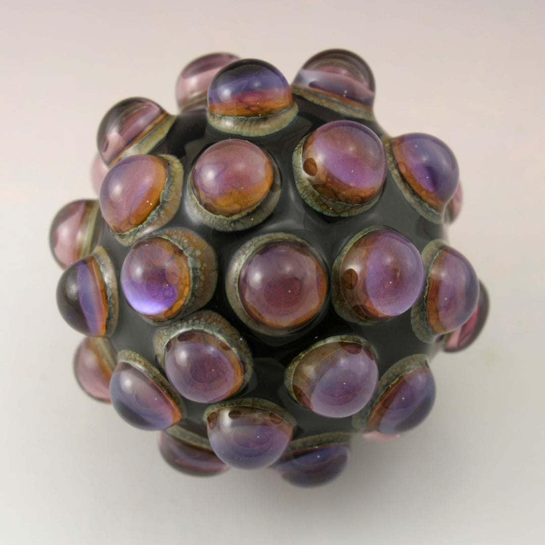 This handmade lampwork glass bead is made from a black base with raised bumpy dots. The dots have a base of aged silvered ivory with pink purple luster encased in a large dot of clear