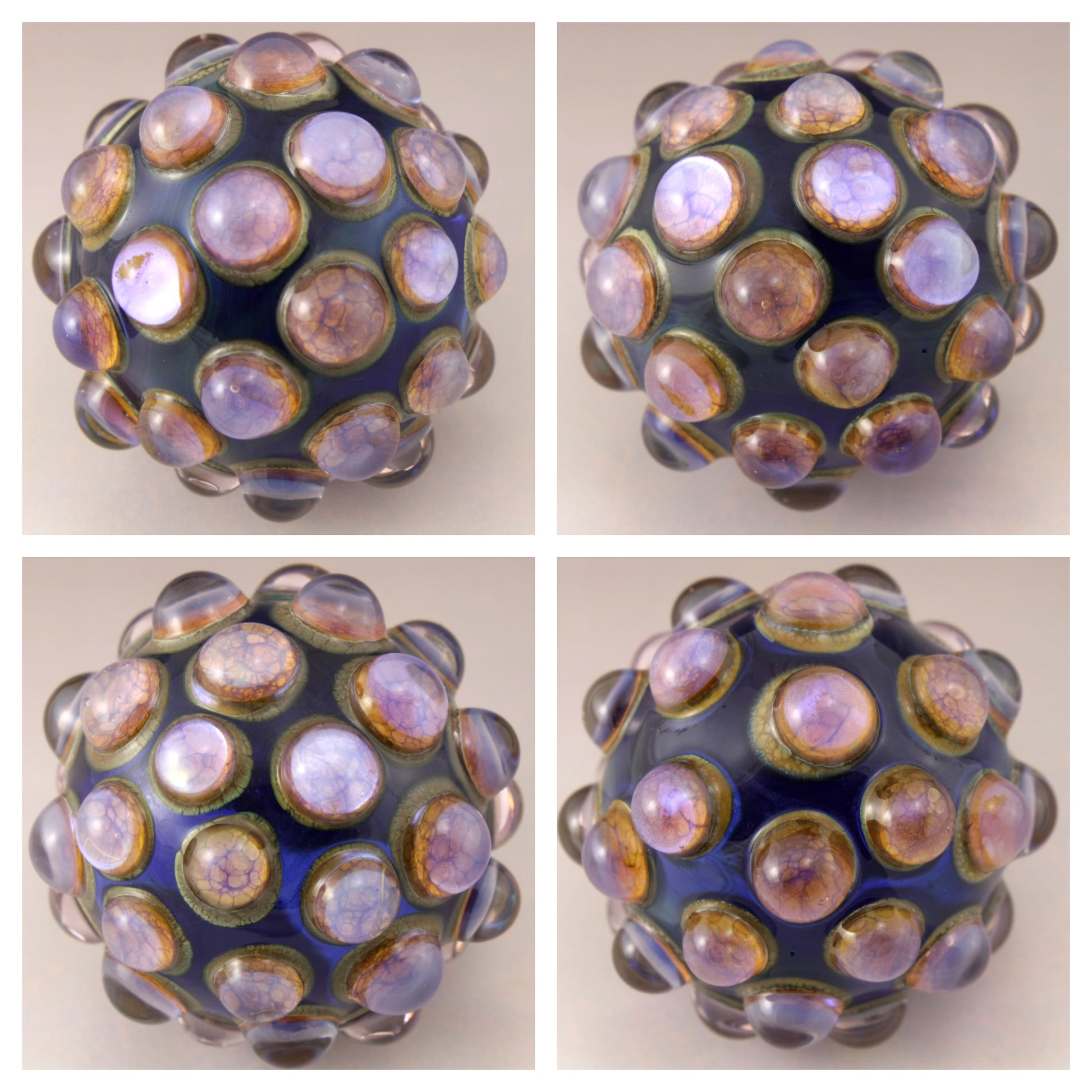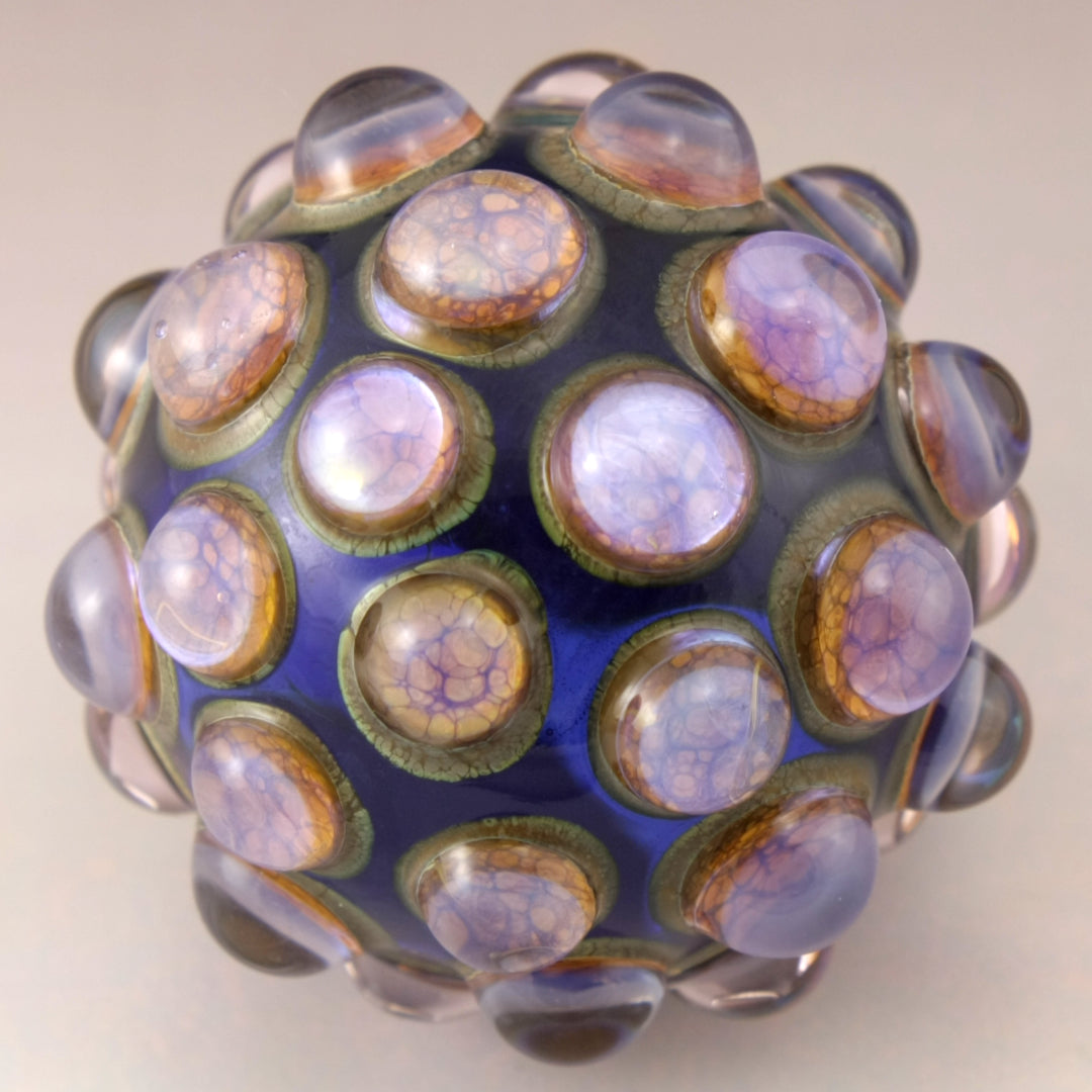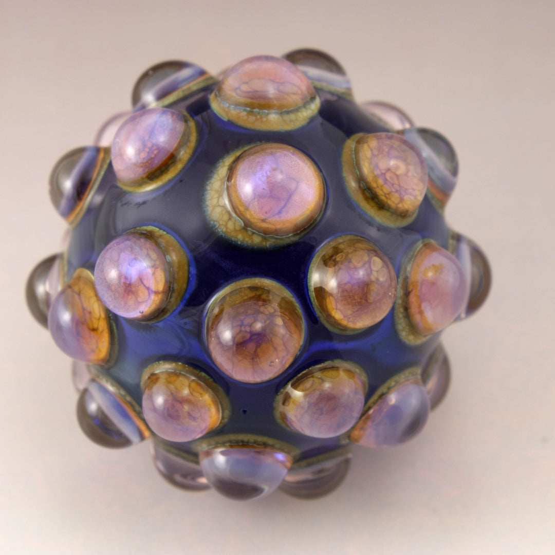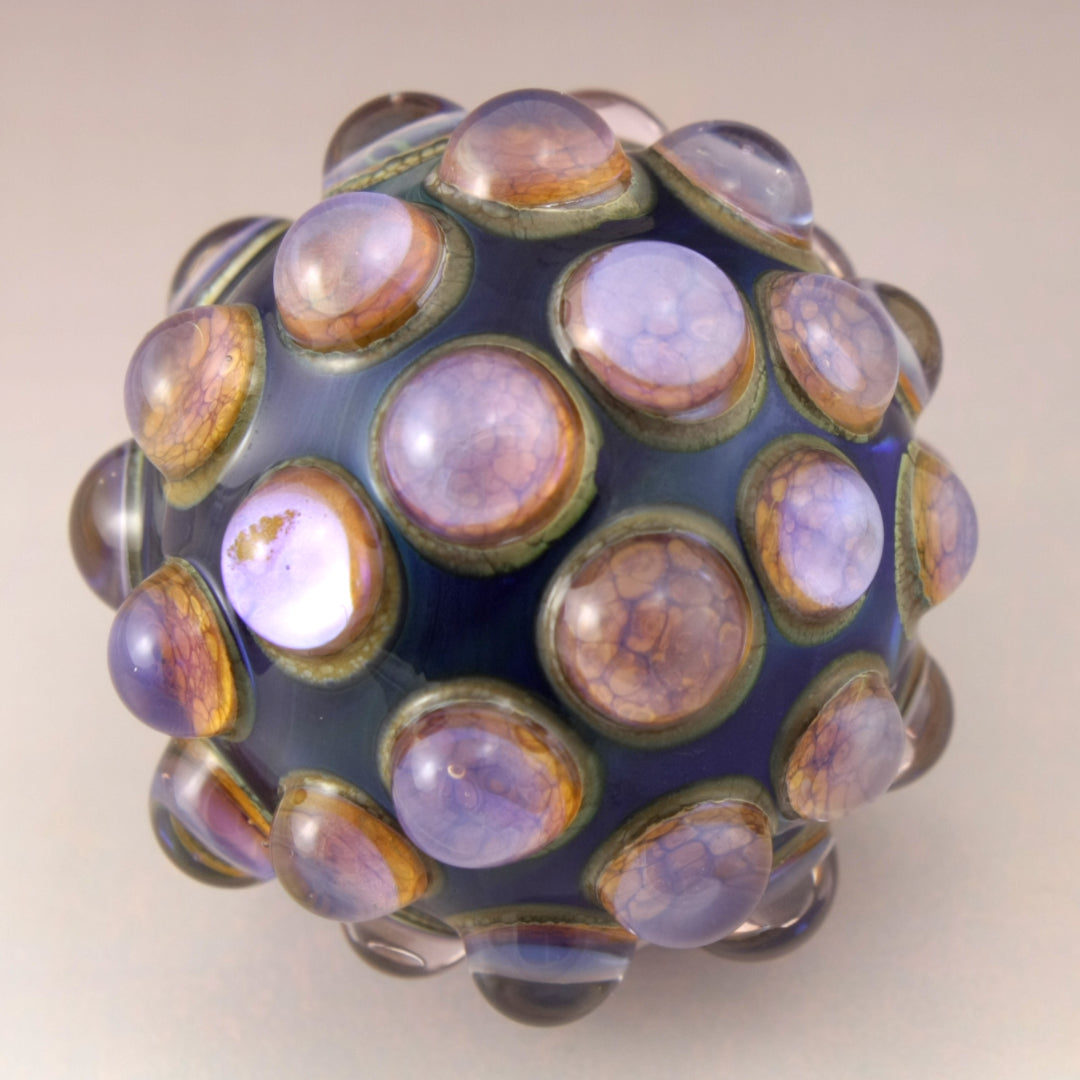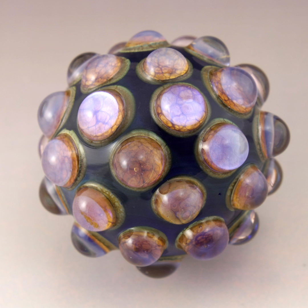 This handmade lampwork glass bead is made from a transparent blue base with raised bumpy dots. The dots have a base of aged silvered ivory with pink purple luster encased in a large dot of clear