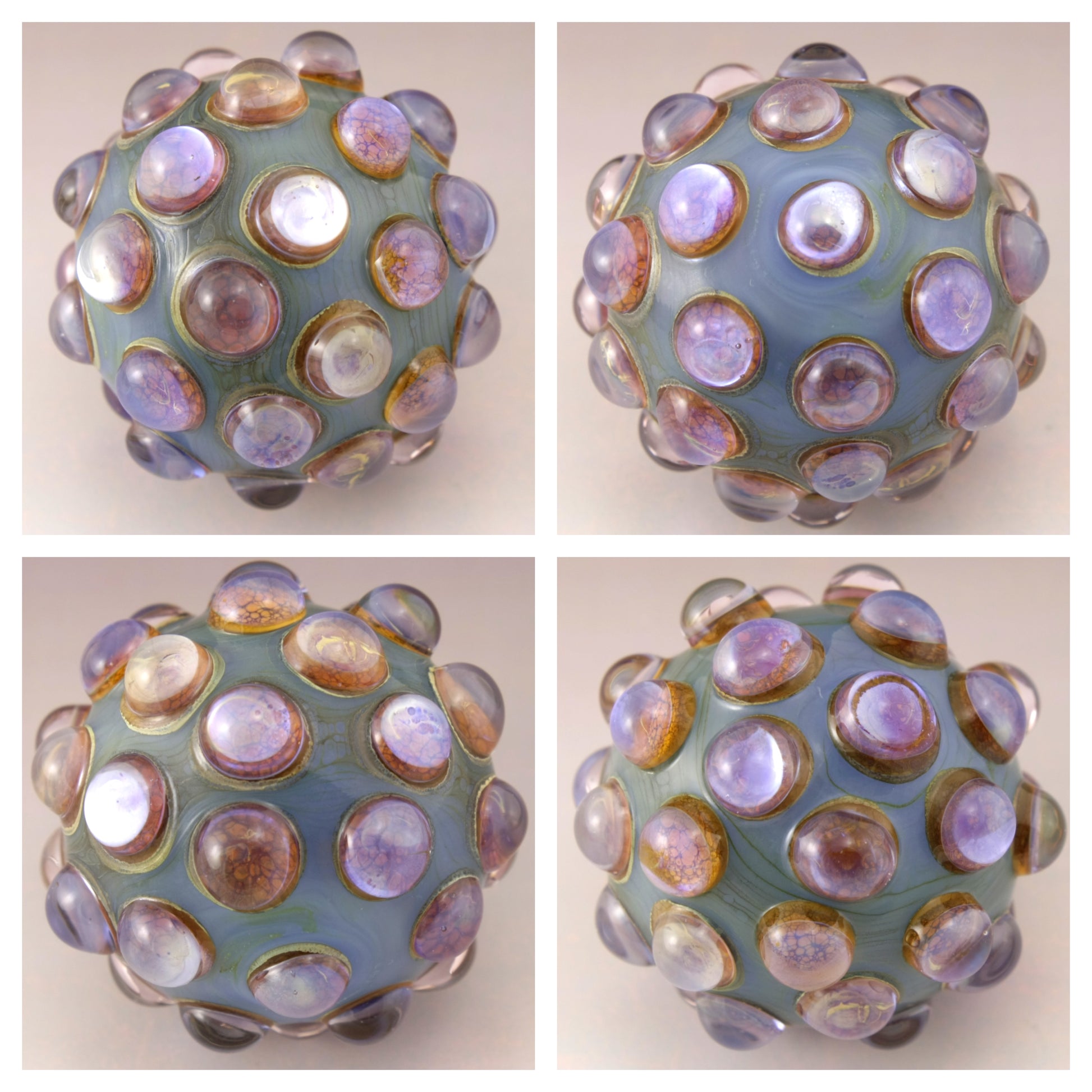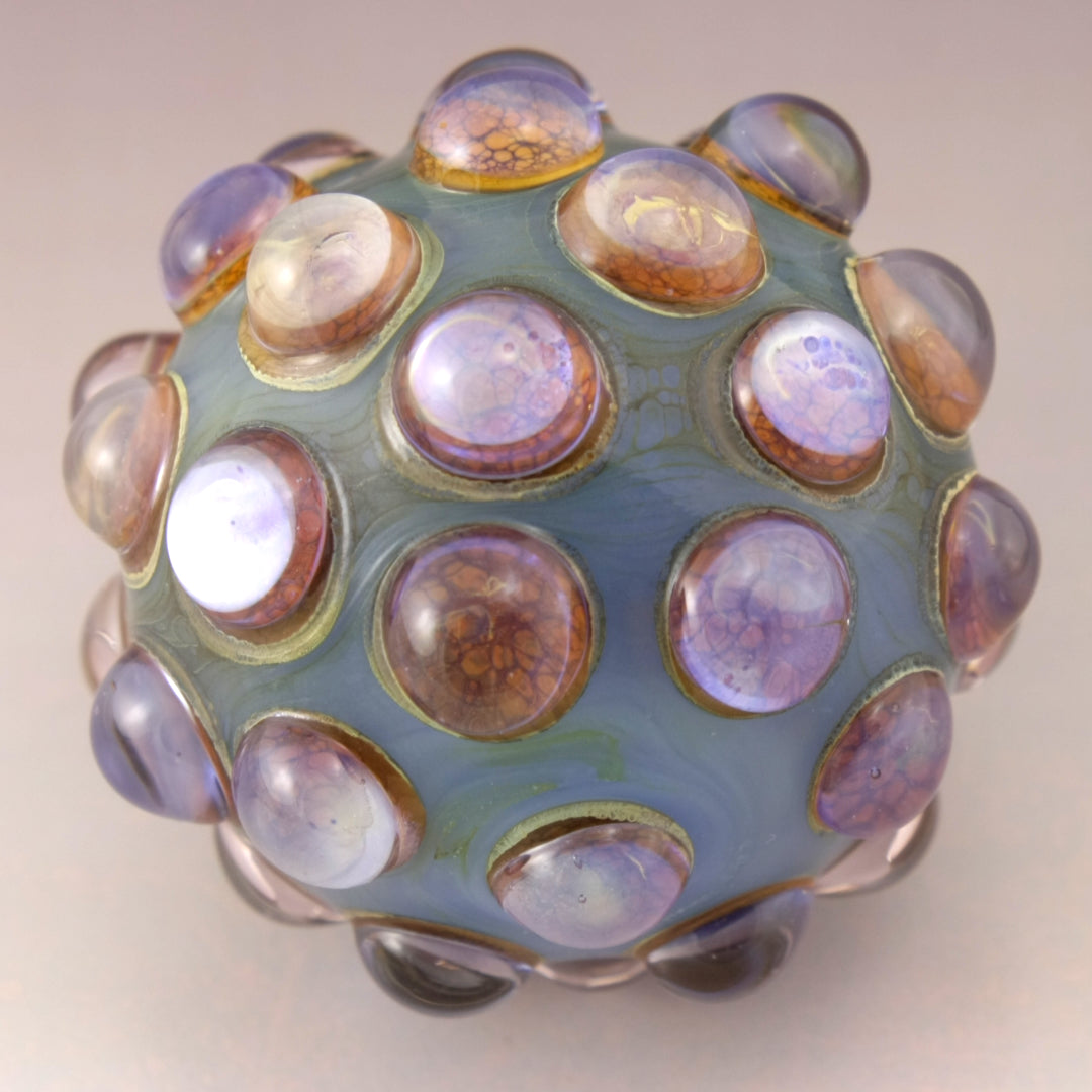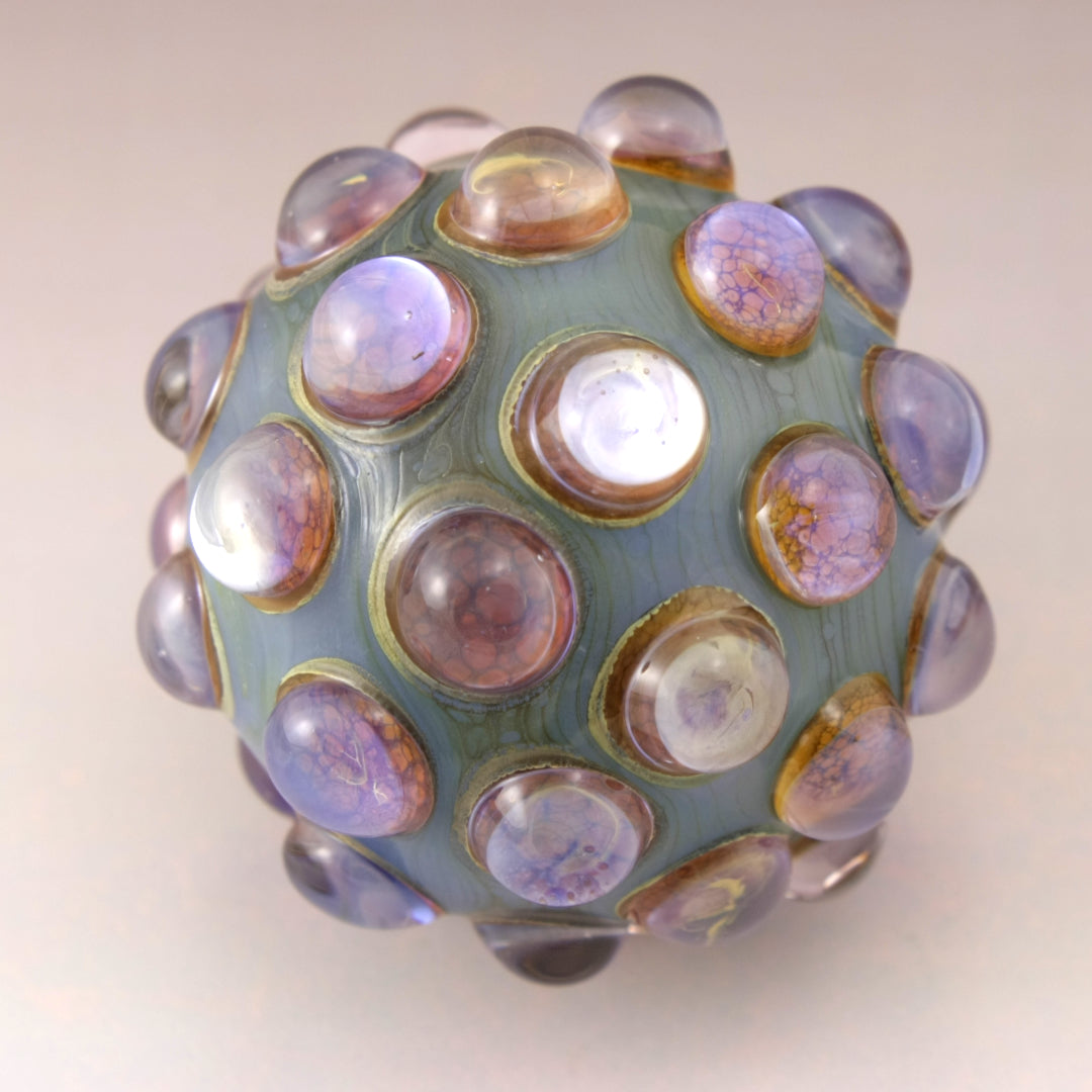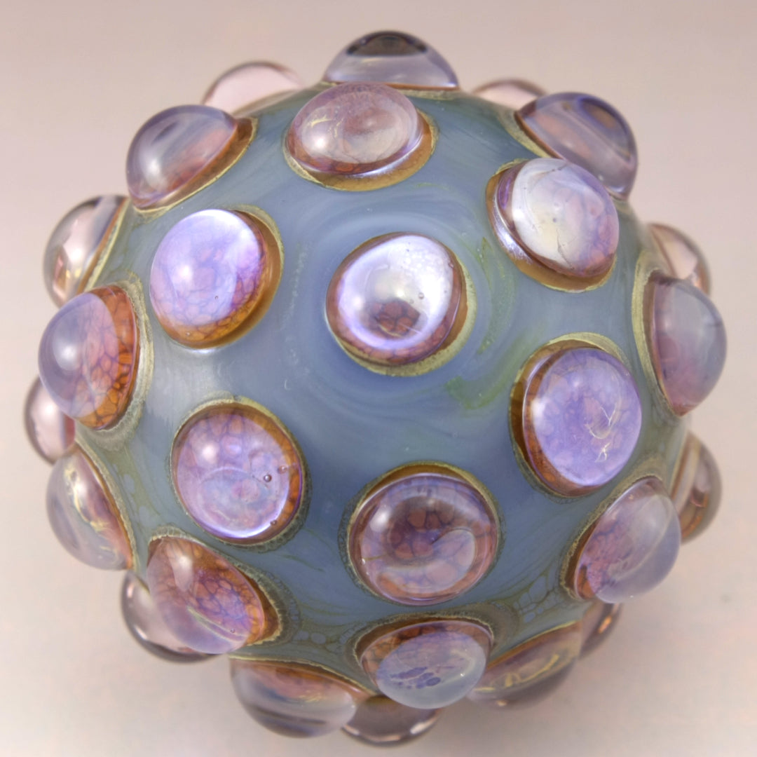 This handmade lampwork glass bead is made from a milky light blue base with raised bumpy dots. The dots have a base of aged silvered ivory with pink purple luster encased in a large dot of clear