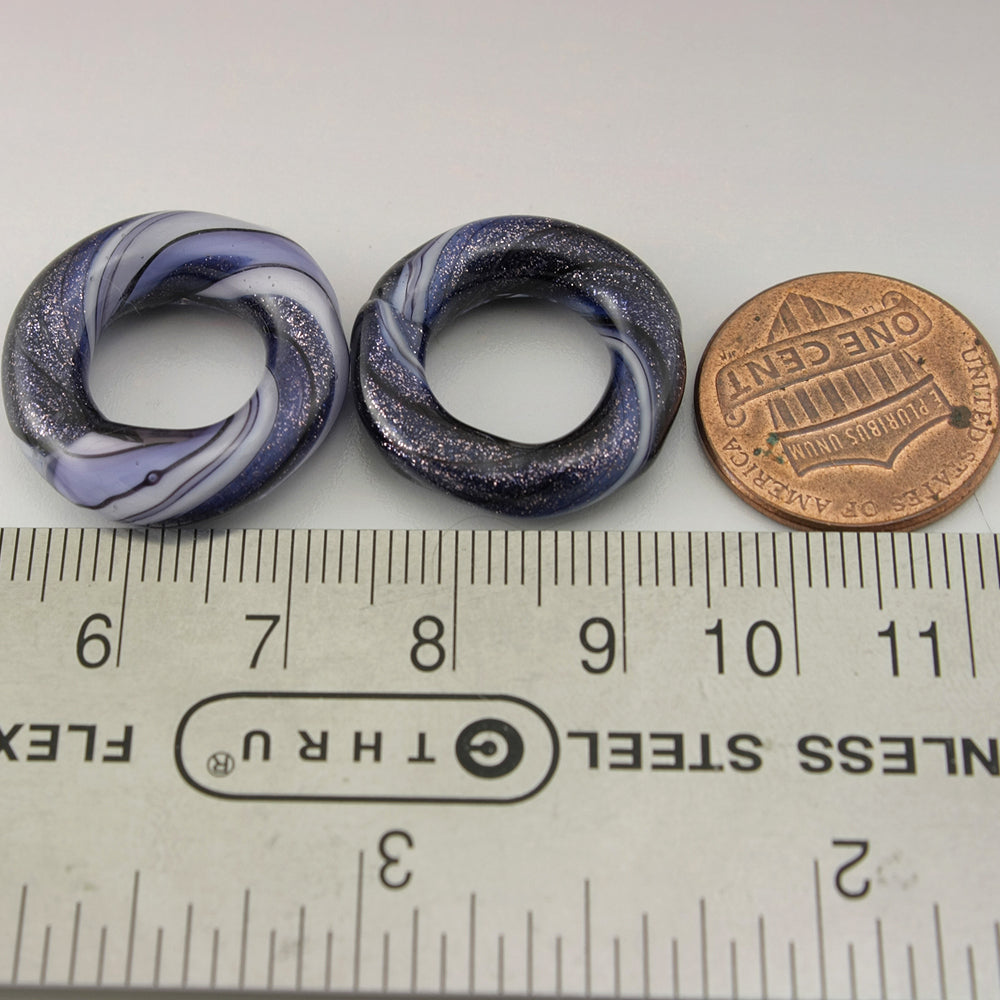 Handmade Purple Blue goldstone sparkle and black pinstripes twisty circle loop pair. This one is made with the end of the twistie, so it has some random patterning with splashes of goldstone