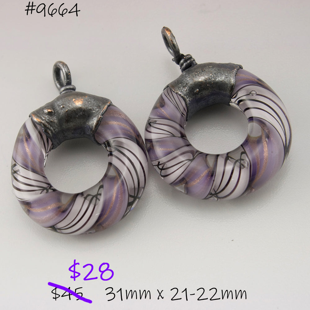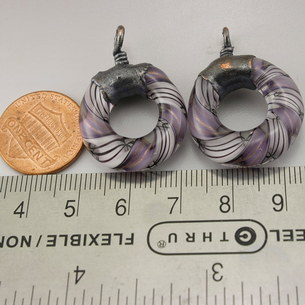 Handmade ink purple and pale pink with black pinstripes and a hint of goldstone helix twisty circle loop with Electroforming Oxidized pair