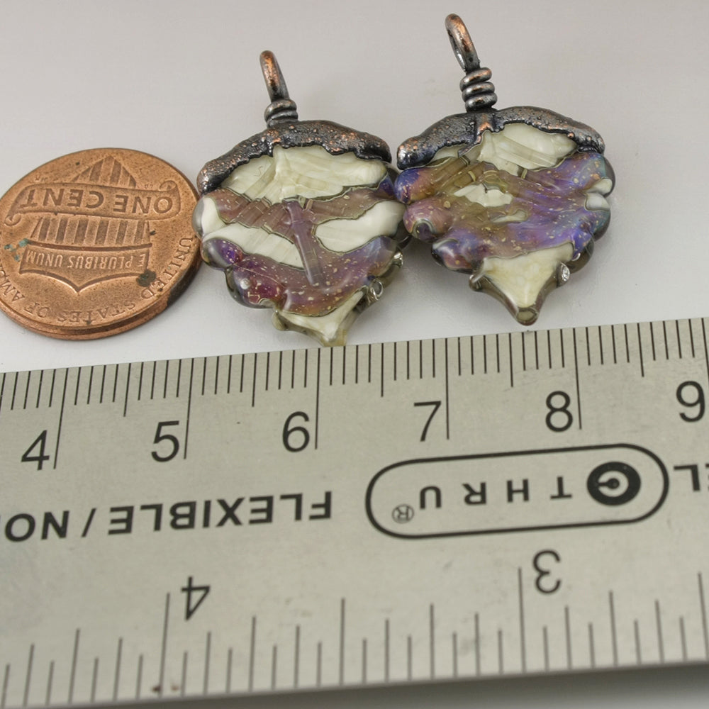 Handmade Ivory with Purple Speckled luster Lampwork Glass Leaves with Copper Electroforming Oxidized pair