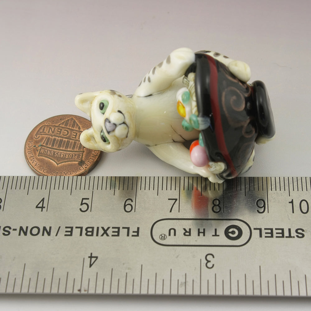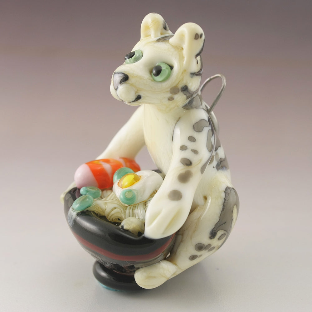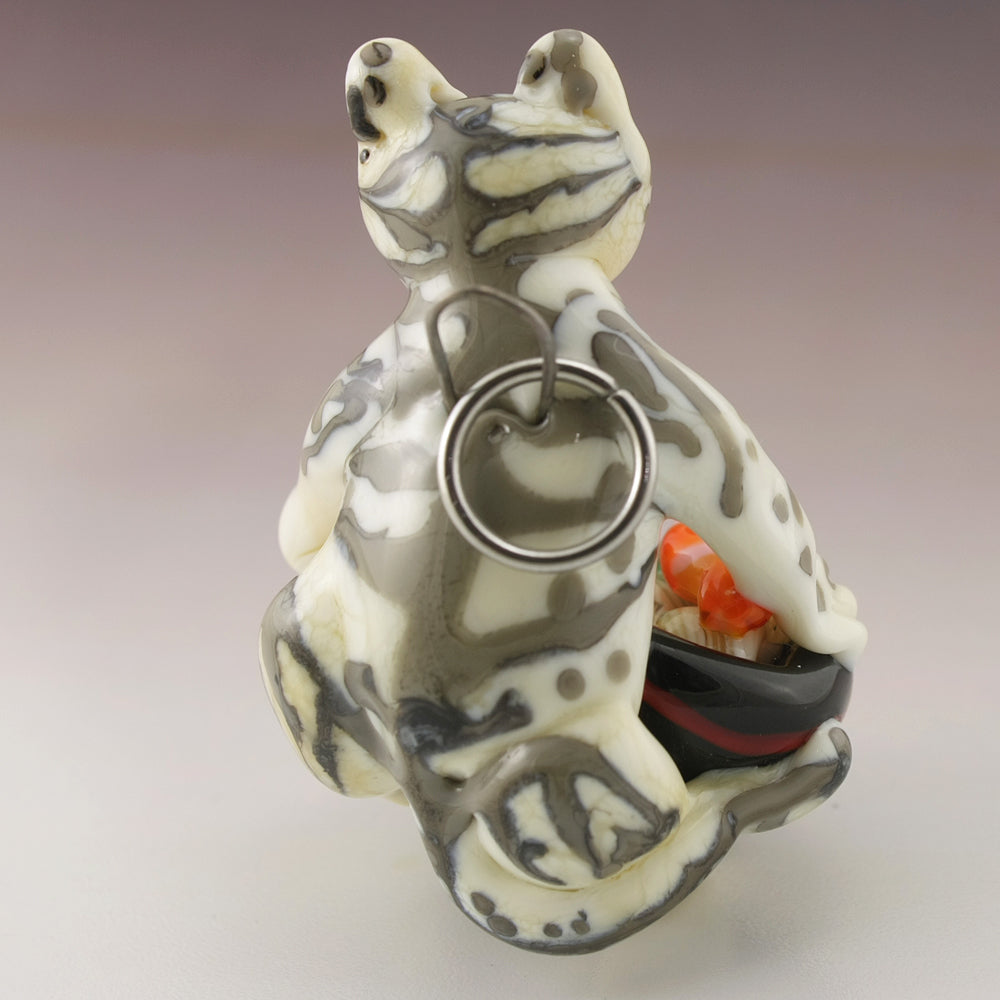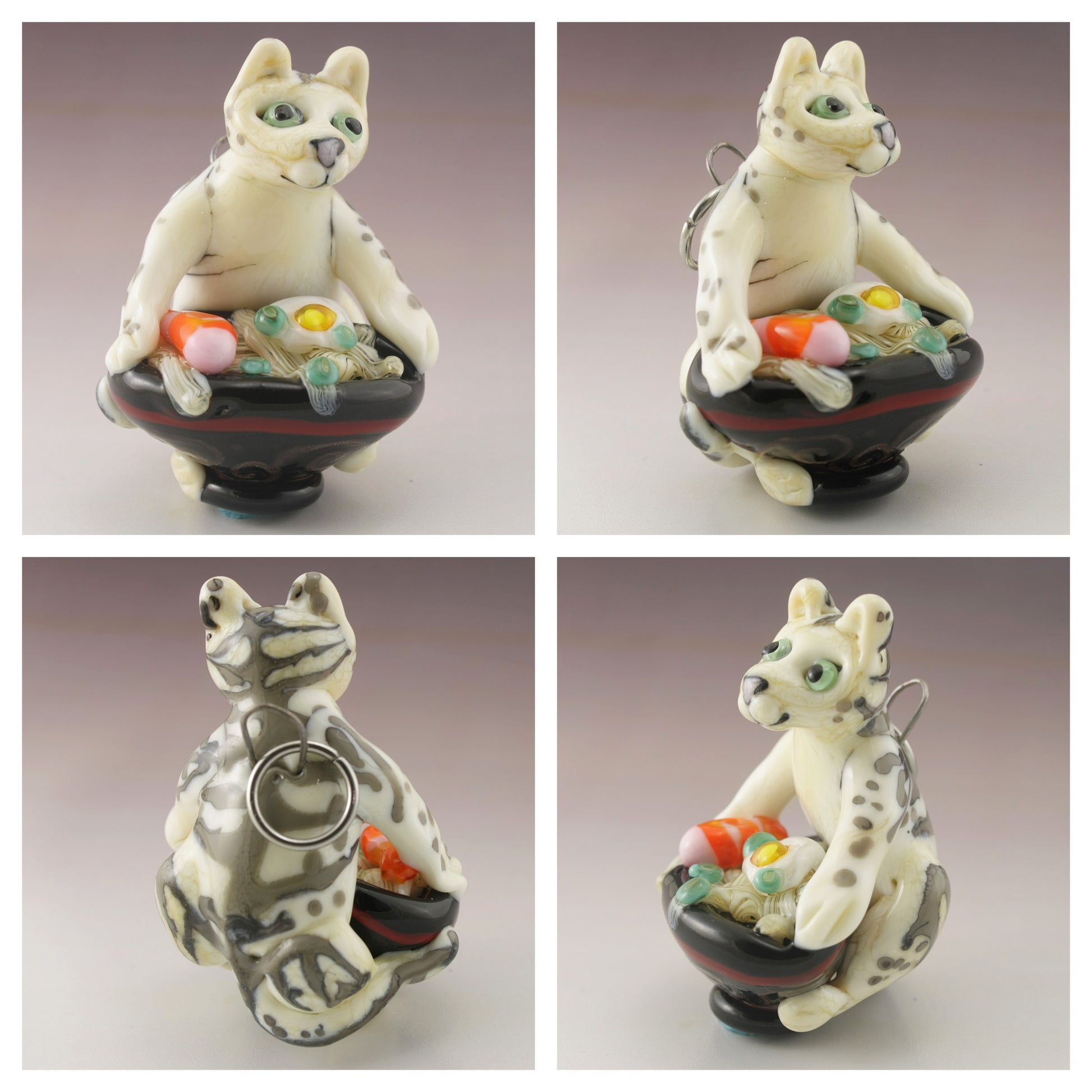 This adorable glass kitty sculpture is a wearable pendant made in soft glass. This ivory and grey tabby cat is hovering over his black, red and goldstone bowl full of ramen noodles, shrimp, egg and green onions. I've used kanthal wire and a stainless steel jumpring to make him a wearable piece of art for you